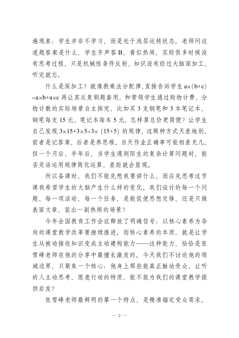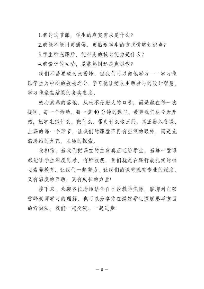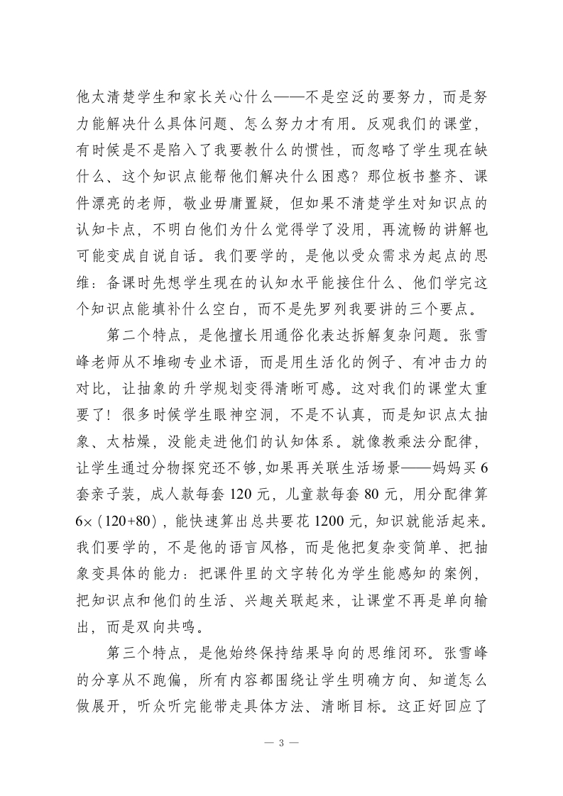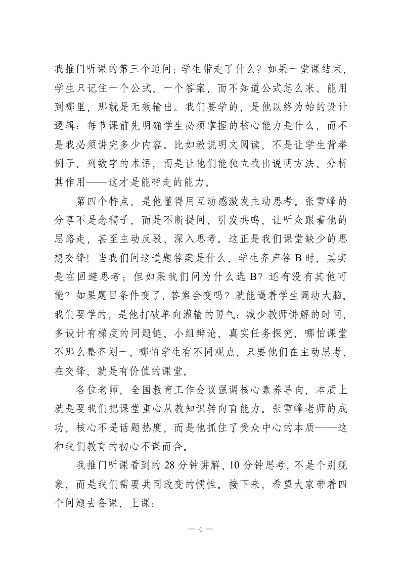 校长推门听课后,在全体教师会上发言:我们可以从张雪峰例子中学一点东西各位老师:下午好!这段时间,根据期初制定的要求,我不告而入,推门听课,没有固定时间,走进了不少教室。今天不是来秋后算账,也不是给大家的课打分排位,只是想把我在教室最后一排看到的情况如实分享,再和大家一起探讨接下来该如何上好每一堂课。先和大家说一个细节。上个星期三的第二节课,我走进一间教室,那位老师讲解知识点时非常专注,板书整齐、课件漂亮、语言流畅,能看出备课的用心和敬业的态度。但我的目光落在学生身上时,却发现了不一样的景象:前排同学在记笔记,中间几排在翻书,后排有两三位同学眼神空洞地发呆。整堂课四十分钟,老师讲解时长约二十八分钟,而学生真正思考、操作和表达的时间加起来不足十分钟。我不是要批评这位老师,他的敬业值得肯定,但这个现象却让我深深反思:我们花费大量精力在课堂上,学生是否真正接收到了知识、提升了能力?这也是我今天想和大家重点探讨的核心一推门听课的时候,我关注的从不是老师教得怎么样,而是三个问题:学生想的是什么?学生做的是什么?学生带走的是什么?这三问,就是我判断一堂普通课好坏的核心标准。第一个追问:学生在想什么?想是看不见的,但恰恰是这个看不见的东西,决定了一节课的质量。听课中我发现一个普1