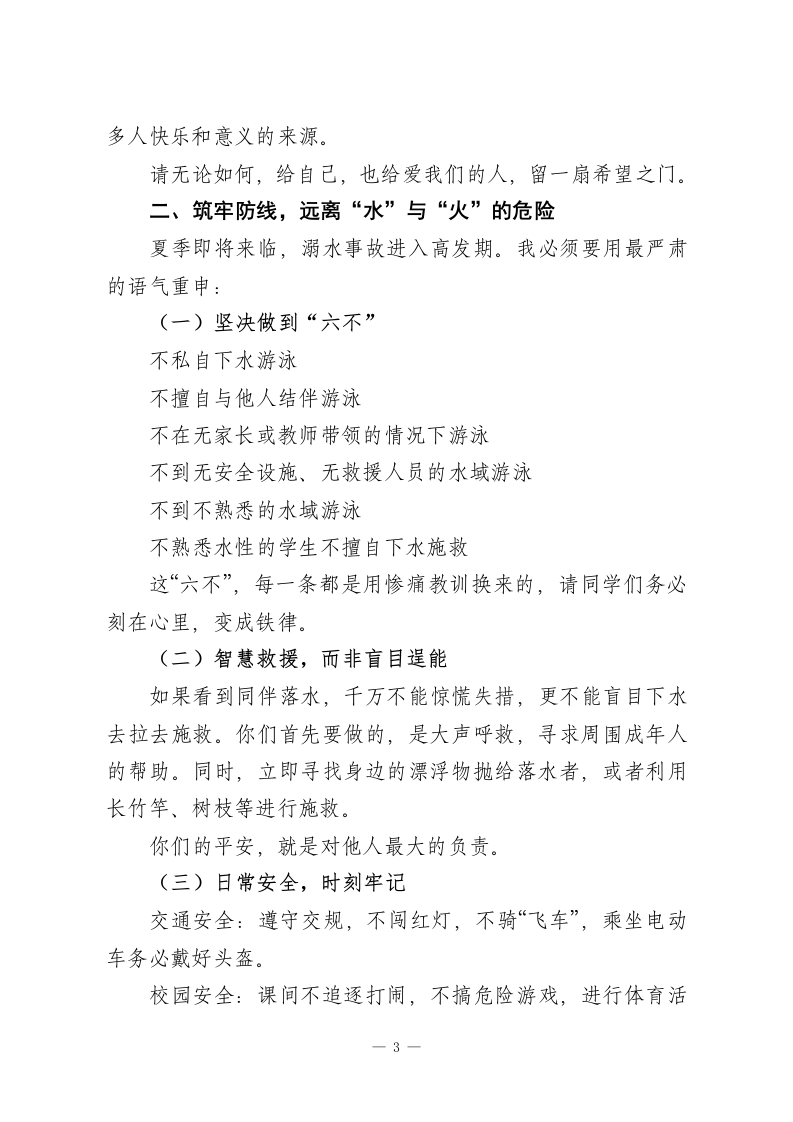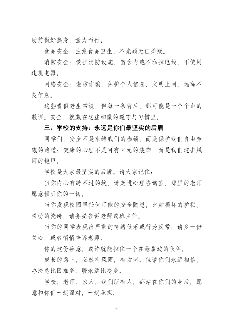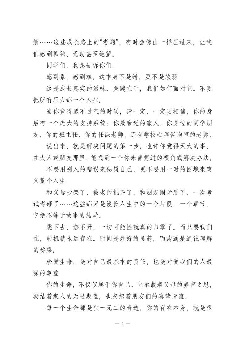 校长在晨会上的讲话:守住安全底线,健康快乐成长今天,站在这里,看着大家青春的脸庞,感受着朝阳的气息,我的心情其实有些复杂。每次和大家交流,我都希望能多谈谈理想,多聊聊未来,多分享一些成长的喜悦。但今天,我想把话题暂时放得更基础,也更沉重一些,那就是两个字一安全。最近一段时间,从新闻里,甚至从我们邻近的地区,我们听到了一些让人无比痛心、无比惋惜的消息。有和我们一样的花季少年,因为一时难以承受的压力或困扰,选择了极端的方式,永远离开了父母、师友和这个充满可能性的世界;也有同学在节假日,因为一时的疏忽或侥幸,在水边嬉戏时发生了溺水的悲剧。这些消息,像一块块巨石压在我们每一位教育者的心上。我相信,也一定触动了在座的你们。生命如此灿烂,又如此脆弱。所以今天,我想以一位长辈,也是你们校长的身份,和大家非常恳切地聊一聊守住安全底线,健康快乐成长”这个话题。这不是一次例行公事的教育,而是一次郑重的提醒,一次发自内心的恳谈。一、守护内心,从接纳情绪开始真正的危险,有时不仅来自车水马龙的外部世界,更可能来自我们内心一时的风雨。学业压力、人际关系的烦恼、对未来的迷茫、与家人的误一1