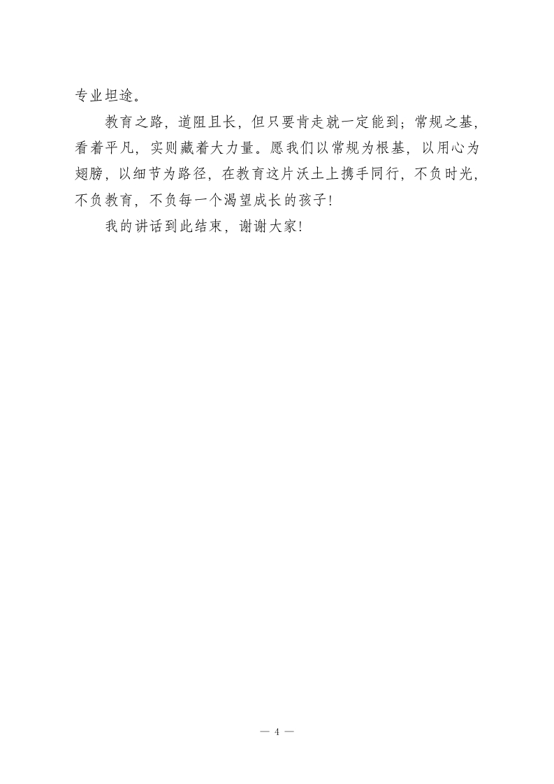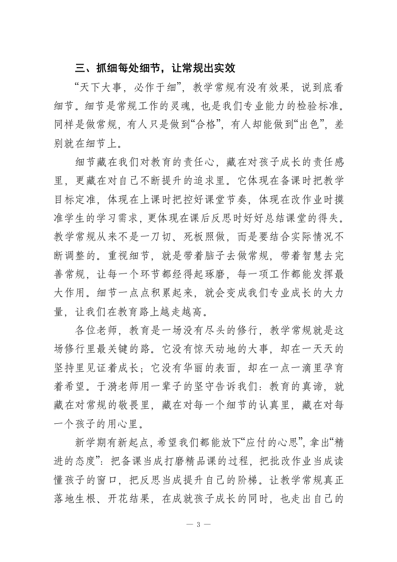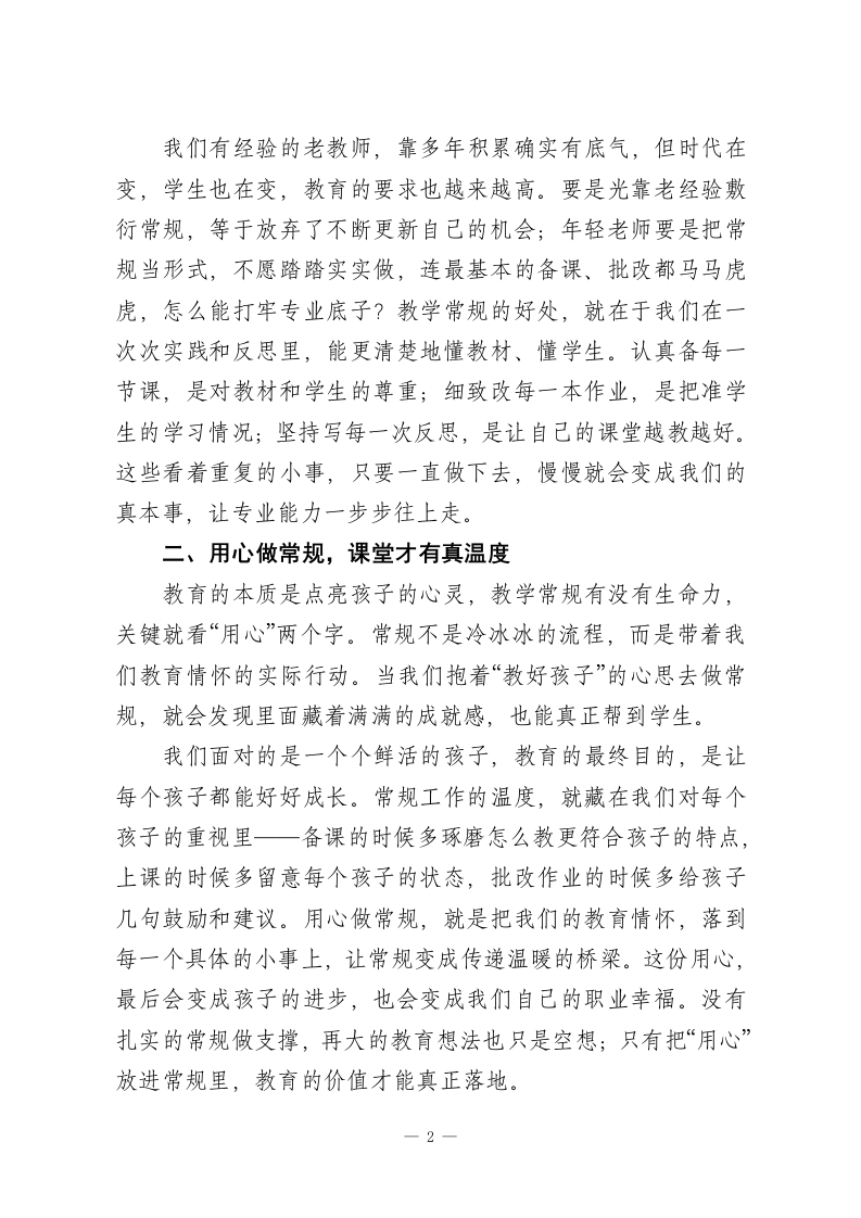 校长在教师例会上精彩讲话:把教学常规做到位,教好孩子也提升自已老师们:大家好」今天我们聚在一起,讲讲“教学常规”这个看着普通,却藏着教育根本的重要话题。它就像我们盖房子的地基、开船前的罗盘,看着不起眼,可没有它,教育工作就稳不住、走不远。教育从来不是一时的轰轰烈烈,而是在一天天的坚持里慢慢攒力量,教学常规,就是这份坚持最实在的体现。著名教育家于漪老师说过:“一辈子做老师,一辈子学做老师。这句话说到了教育的根子上一我们老师和学生一起进步,而教学常规,正是我们和学生共同成长的必走的路。我干教育二十多年,深深体会到:不管教育理念怎么变、教学方法怎么创新,常规工作的核心从来没变过一一它不是为了应付检查、给学校交差的活儿,也不是绑住我们手脚的麻烦,而是我们提升自己专业能力的台阶,是学生未来发展的底子。结合这些年的教育感悟,今天我想和大家说三句心里话,我们一起共勉。一、别敷衍常规,成长才不会掉队“敷衍”是教育工作的大忌,更是我们自己成长的拦路虎。有些老师把常规工作当成额外负担,只求“做完”不求“做好”,压根没看到背后的育人价值和成长意义。大家想想,教育哪有什么捷径可走?常规工作的每一个环节,都是我们练专业、攒经验的机会。一1