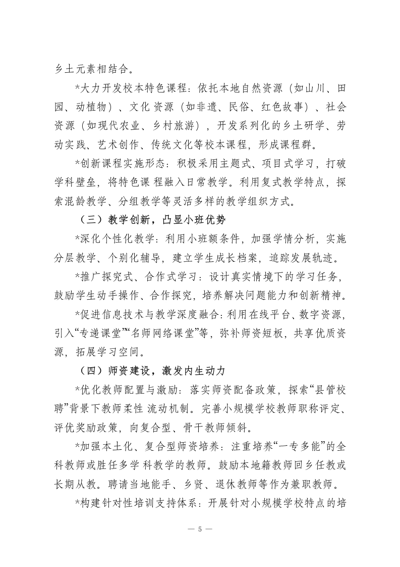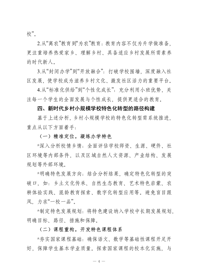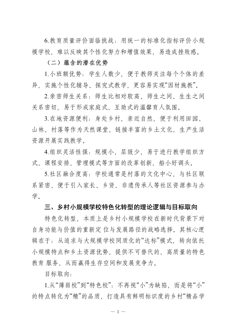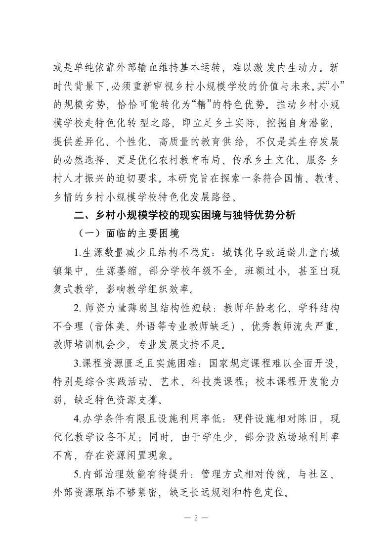 新时代乡村小规模学校的特色化转型研究摘要:在城镇化进程持续推进和学龄人口变动的背景下,乡村小规模学校(通常指在校生人数较少的村小、教学点)已成为我国农村教育体系的重要组成部分。面对生存挑战与发展机遇并存的新时代,此类学校的简单维持或撤并均非最优解,探索特色化转型之路,实现从“弱校”到“优校”、从“兜底”到“提质”的转变,对于促进教育公平、助推乡村振兴具有战略意义。本文系统分析了乡村小规模学校面临的现实困境与独特优势,论证了其特色化转型的内在逻辑与时代必然性,并从精准定位、课程重构、教学创新、师资建设、治理优化、空间赋能及协同发展等维度,构建了一套以“小而美、小而优、小而特”为目标的特色化转型路径体系,旨在为提升乡村小规模学校内涵质量、彰显其独特价值提供理论参考与实践指南。一、引言:背景与意义乡村小规模学校是保障农村偏远地区儿童就近入学、接受有质量教育的重要载体,是阻断贫困代际传递、维护教育起点公平的“神经末梢”。随着我国社会主要矛盾转化和乡村振兴战略全面实施,乡村教育的发展目标已从“有学上”转向“上好学”。然而,受制于地理位置、人口外流、资源投入等因素,许多乡村小规模学校普遍面临生源减少、师资薄弱、课程开不齐、开不足、质量不高等共性问题,生存与发展陷入困境。传统的思路或是通过撤点并校追求规模效益,但这可能加剧学生上学难、增加家庭负担,甚至导致乡村文化生态调零;-1-