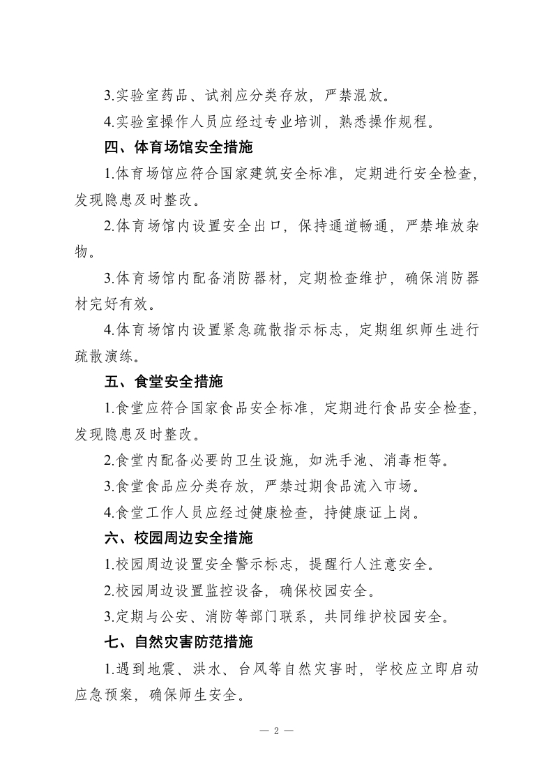 学校防灾减灾安全生产措施为保障学校师生的人身安全,预防和减少各类灾害事故带来的损失,学校应制定并落实以下防灾减灾安全生产措施:一、组织管理1.成立学校防灾减灾安全生产领导小组,明确职责分工,确保各项工作落实到位。2.定期组织师生进行防灾减灾安全教育和培训,提高师生的安全意识和自救互救能力。3.制定各类灾害事故应急预案,并定期组织演练,确保师生熟悉应急程序。二、教学楼安全措施1.教学楼应符合国家建筑安全标准,定期进行安全检查,发现隐患及时整改。2.教学楼内设置安全出口,保持通道畅通,严禁堆放杂物。3.教学楼内配备消防器材,定期检查维护,确保消防器材完好有效。4.教学楼内设置紧急疏散指示标志,定期组织师生进行疏散演练。三、实验室安全措施1.实验室应符合国家实验室安全标准,定期进行安全检查,发现隐患及时整改。2.实验室内配备必要的安全防护设施,如通风设备、防爆设备等。一1