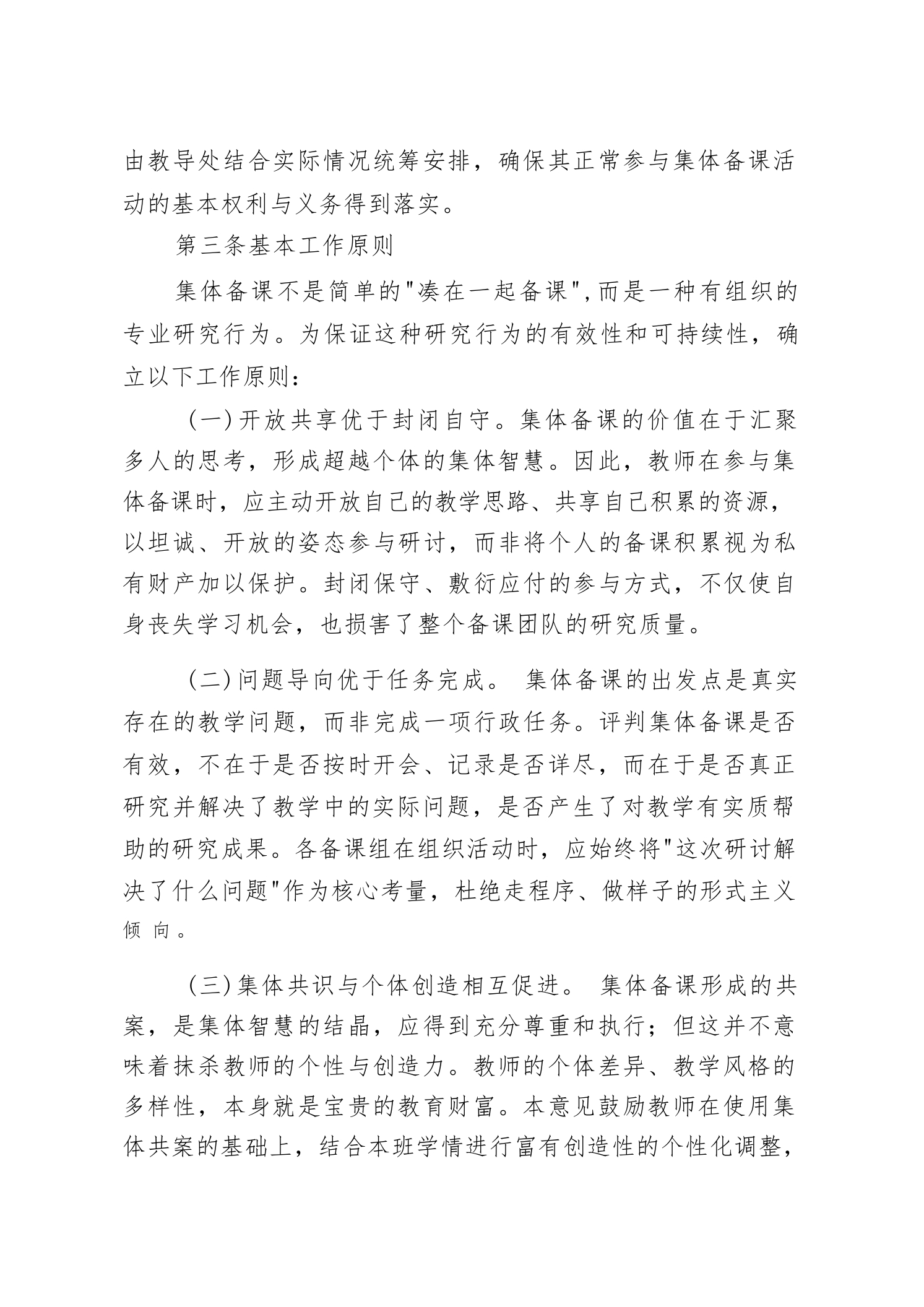 学校集体备课管理办法(2026试行)第一章指导思想与总体要求第一条制定背景与目的教学质量是学校工作的生命线,而备课质量直接决定课堂教学的深度与效度。长期以来,部分备课组存在活动流于形式、研讨停留表面、成果难以积累等问题,严重制约了集体教研价值的发挥。为从根本上扭转这一局面,切实将集体备课建设成为教师专业成长的重要平台和教学质量提升的有效抓手,本校在认真研究《中华人民共和国教师法》《基础教育课程改革纲要》及上级教育行政部门关于深化校本教研系列文件精神的基础上,结合本校教学管理实际,制定本实施意见。本意见的根本目的在于三个层面的统一:其一,在制度层面,建立边界清晰、操作可行的集体备课工作规范;其二,在过程层面,确保每一次集体备课活动都有实质性的问题研究和真实的成果产出;其三,在结果层面,推动备课成果向教学实践的有效转化,并通过持续积累形成具有本校特色的学科教学资源体系。第二条适用范围本意见适用于本校全体在岗任课教师,涵盖所有学段、所有学科。凡在本校承担课堂教学任务的教师,无论是否担任管理职务,均须按照本意见规定,参加所在学科备课组的集体备课活动,不得以任何理由长期缺席或游离于集体备课体系之外。对于跨校区任课、承担多学科教学任务等特殊情形的教师,