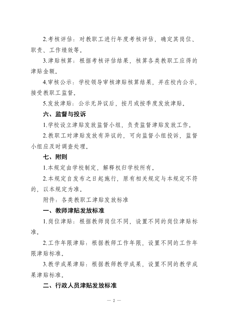 学校津贴发放管理规定津贴发放管理规定一、目的为规范学校津贴发放工作,确保津贴发放的公平、公正、公开,提高津贴使用效益,特制定本规定。二、适用范围本规定适用于学校全体教职工,包括教师、行政人员、后勤人员等。三、津贴种类1.教师津贴:根据教师岗位、工作年限、教学成果等因素确定。2.行政人员津贴:根据行政岗位、工作职责、工作绩效等因素确定。3.后勤人员津贴:根据后動岗位、工作内容、工作质量等因素确定。四、津贴发放原则1.公平原则:根据教职工的实际工作表现和贡献,公平分配津贴。2.公开原则:津贴发放标准、程序、结果公开透明,接受全体教职工监督。3.效率原则:提高津贴使用效益,促进教职工工作积极性。五、津贴发放程序1.制定津贴标准:根据学校实际情况,制定各类津贴发放标准。