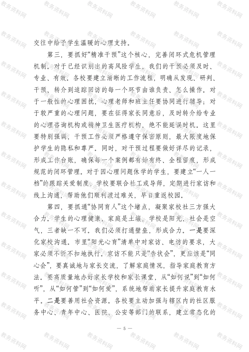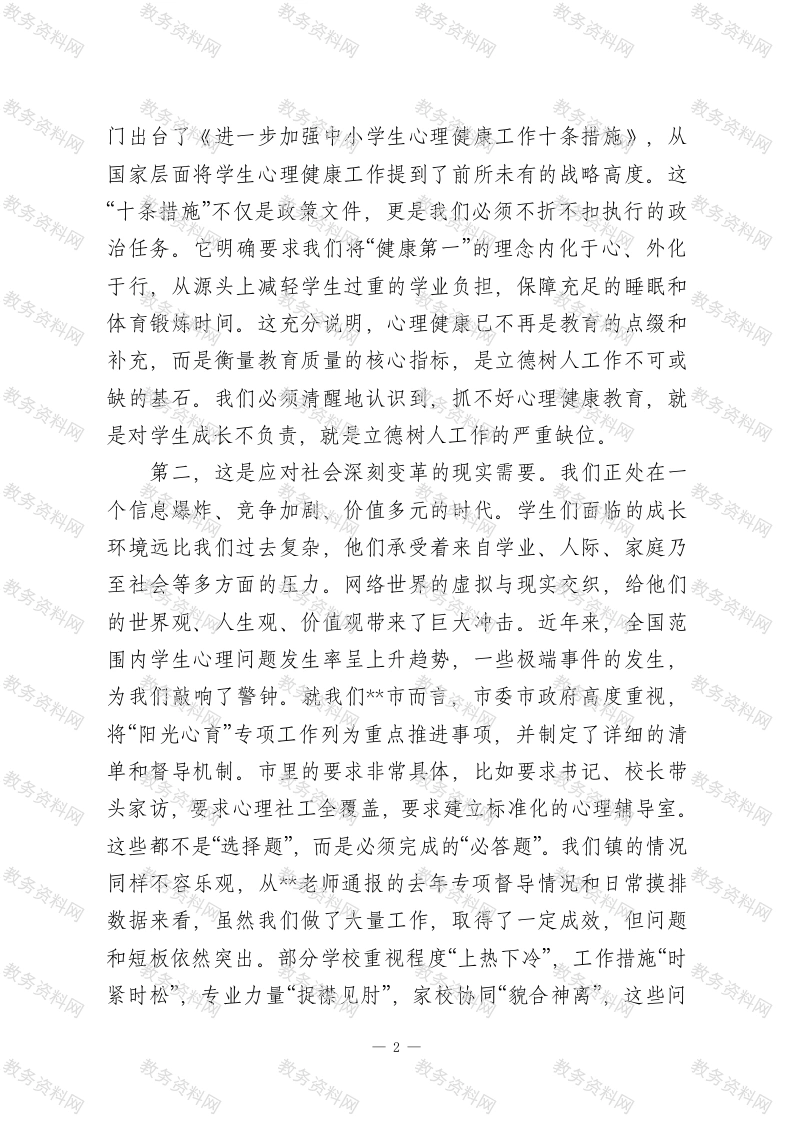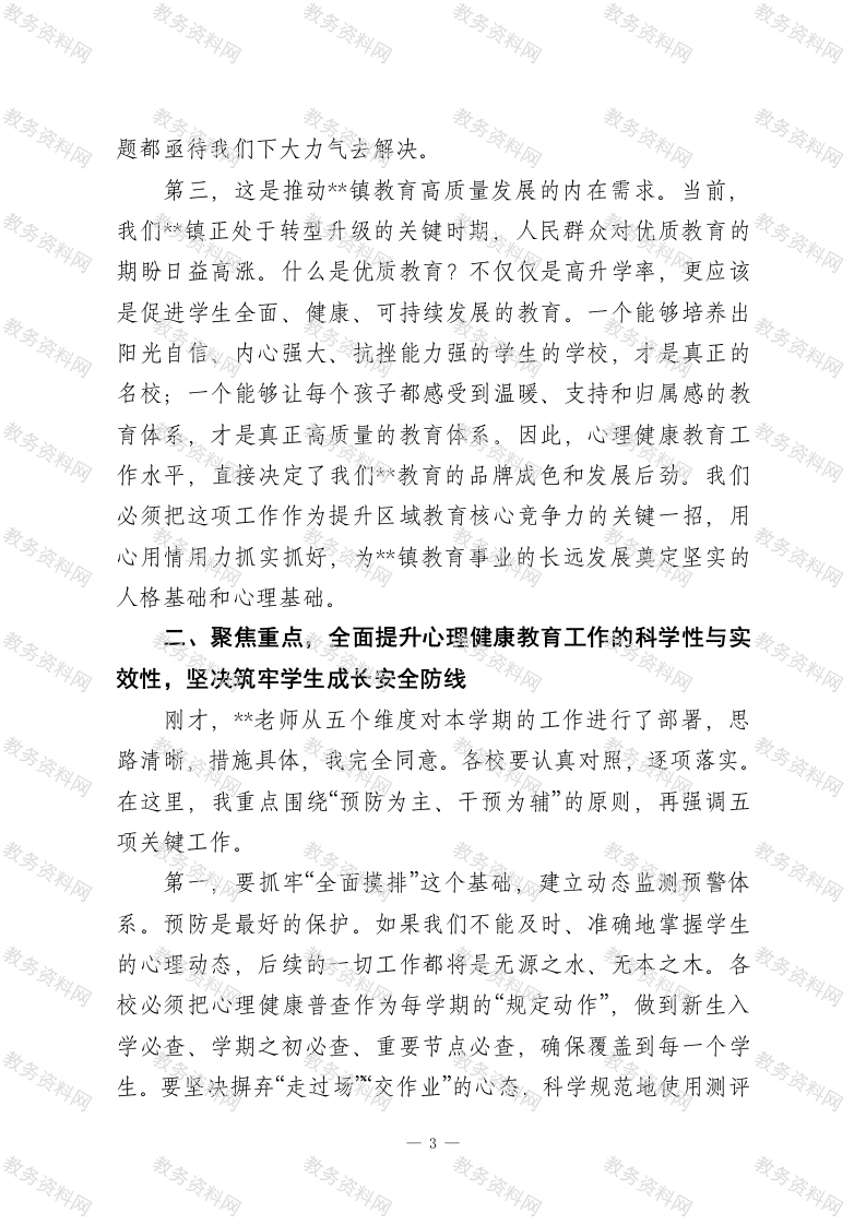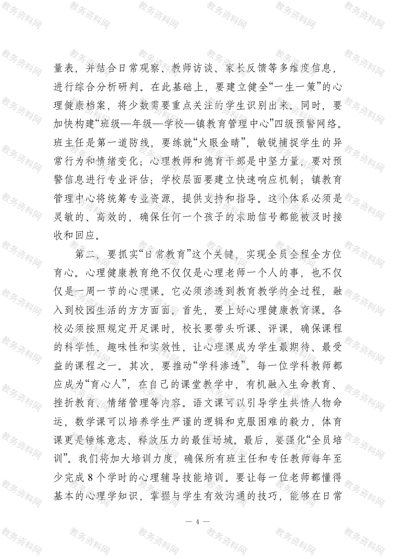 在2026年春季学期中小学心理健康教育工作专题会议上的总结讲话同志们:大家好!今天我们在这里召开全镇中小学心理健康教育工作专题会议,恰逢其时,意义重大。刚才,*同志传达了上级最新的文件精神,*老师系统回顾了过去一年的工作,并对本学期的重点任务作了详尽部署,我都完全赞同。两位同志的发言,既有宏观的政策解读,又有微观的实践指导,为我们接下来的工作统一了思想、明确了方向。借此机会,我代表镇教育管理中心,向长期以来辛勤耕耘在心育工作一线的各位校长、各位老师、各位同仁,表示衷心的感谢和崇高的敬意!下面,我结合大家的发言和当前形势,再强调三点意见。一、认清形势,深刻领会心理健康教育工作的极端重要性,切实增强时代责任感与历史紧迫感学生心理健康工作,事关学生的健康成长,事关家庭的幸福安宁,更事关国家民族的未来。我们必须站在战略和全局的高度,深刻认识这项工作的极端重要性。第一,这是落实立德树人根本任务的必然要求。教育的根本目的,是培养德智体美劳全面发展的社会主义建设者和接班人。一个心理不健全的人,即便学富五车,也难以成为社会的栋梁之材,甚至可能成为社会的不稳定因素。去年,教育部专1