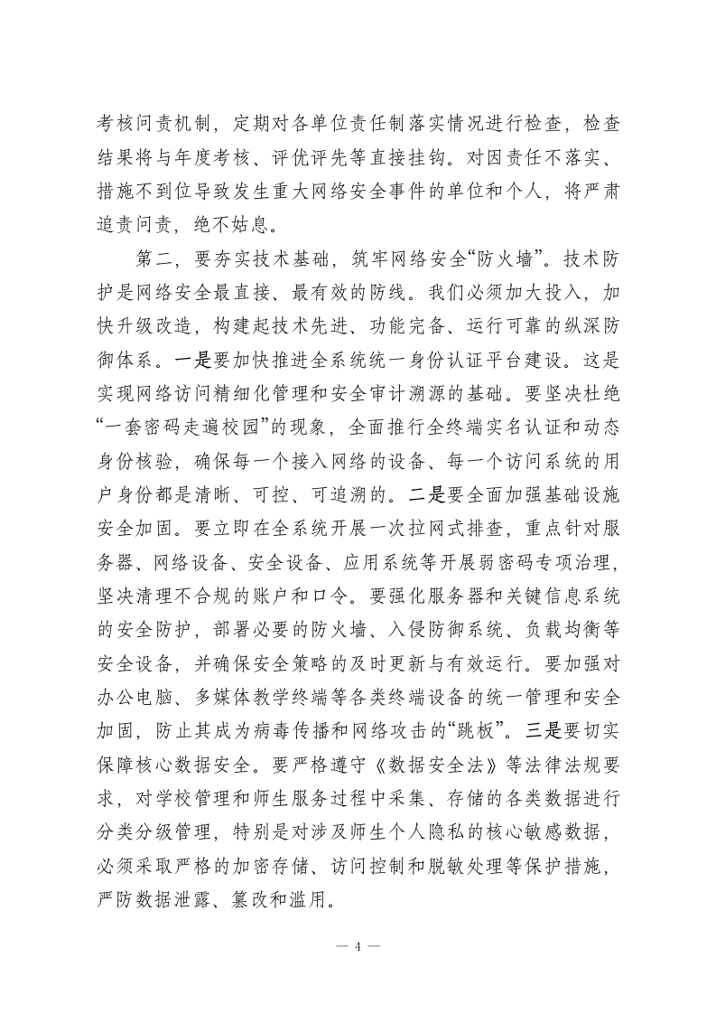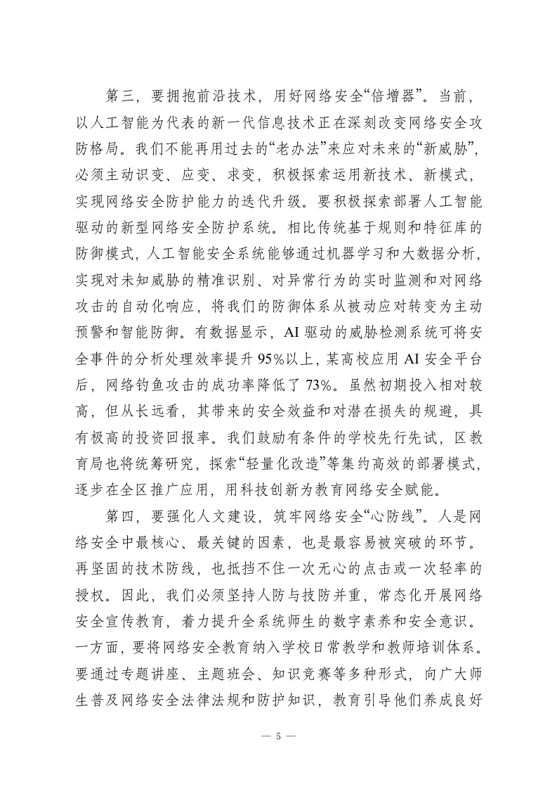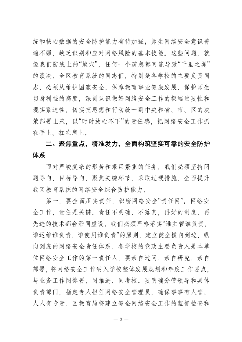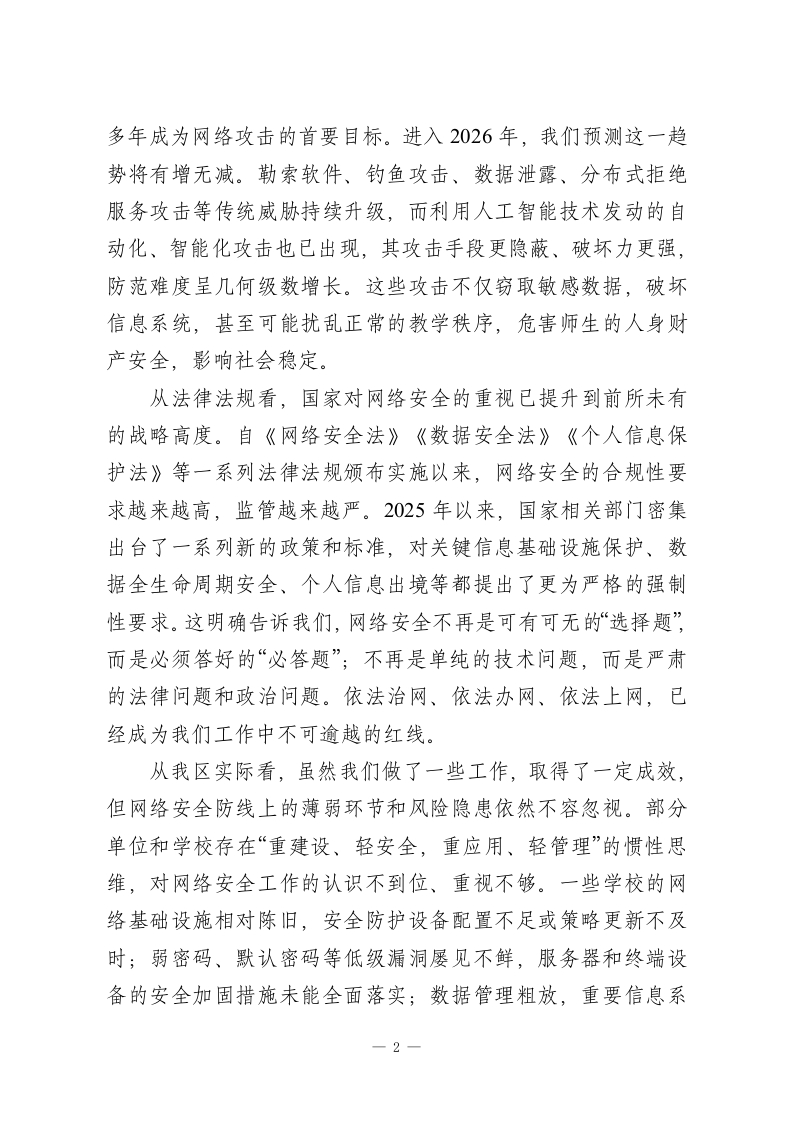 在2026年全区教育系统网络安全工作专题会议上的讲话同志们:今天,我们在这里召开全区教育系统网络安全工作专题会议,主要任务是深入分析当前我区教育系统面临的网络安全新形势、新挑战,全面部署下一阶段重点工作,进一步统一思想、压实责任,动员全系统力量,共同筑牢教育领域的网络安全屏障。刚才,几位同志和专家从不同角度作了很好的发言和培训,内容详实、重点突出,具有很强的指导性和操作性,希望大家认真领会,抓好落实。下面,我讲几点意见。一、认清形势,提高站位,深刻把握网络安全工作的极端重要性近年来,在区委、区政府的坚强领导下,我区教育信息化建设取得了长足进步,智慧校园、在线教学、数据管理等应用日益普及,为提升教育教学质量、促进教育公平发挥了不可替代的作用。但我们必须清醒地认识到,信息化的快速发展如同一枚硬币的两面,在带来巨大便利的同时,也使我们日益暴露在复杂严峻的网络安全风险之下。教育系统作为知识密集、人才密集、数据密集的领域,正越来越多地成为网络攻击的重点目标。从宏观态势看,网络安全威胁正呈现出前所未有的复杂性和破坏性。根据最新的网络安全态势分析,自2024年以来,针对教育行业的网络攻击次数同比增长了75%,教育行业已连续1