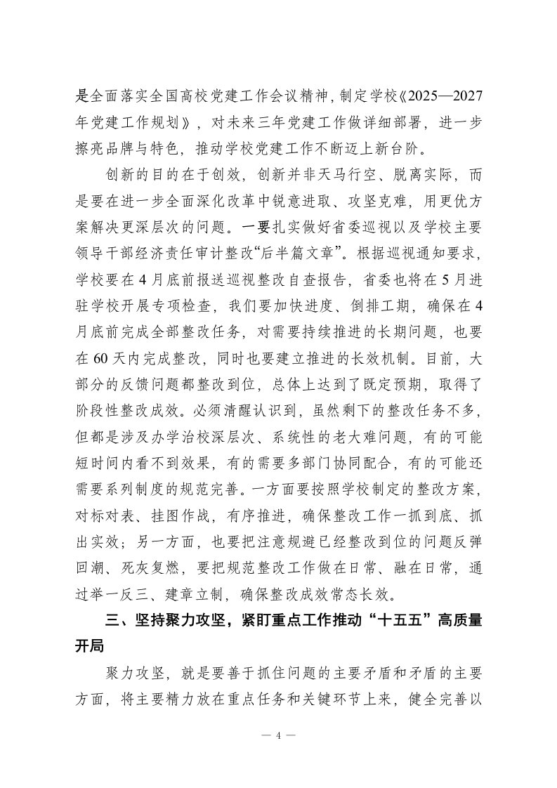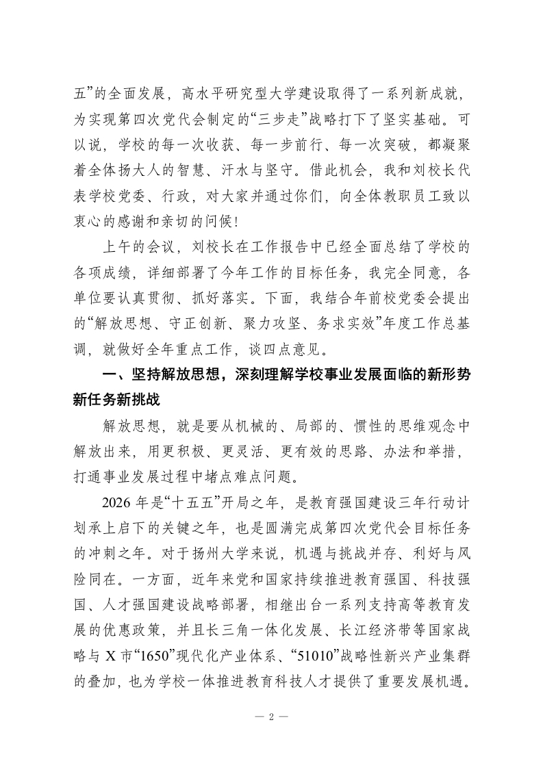 在某高校教代会、工代会暨2025-2026学年春学期干部教师大会上的讲话(校党委书记十五五事业发展良好开局)】各位代表,老师们,同志们:大家新年好!为深入贯彻落实中央八项规定精神,结合学校工作实际,我们将两代会和干部教师大会合并召开。经过大家的共同努力,本次教代会、工代会圆满完成各项议程,即将胜利闭幕。会议审议通过了校长所作的工作报告,以及委员会工作报告和提案工作报告,通过了教代会执行委员会和提案委员会委员调整方案。代表们充分展现了强烈的主人翁意识和担当精神,对大会有关文件材料,特别是对“十五五”事业发展规划、职称评聘办法及系列职称资格条件等文件,提出了许多建设性意见,相关部门正在武装布岗,要认真梳理研究、有效吸收。在座的各位代表,注入了更加强有力的发展动能,为实现“十五五”良好开局,注入了强大的发展动能。老师们,同志们,“十四五”时期是加快建设高水平研究型大学的关键五年。过去五年,我们始终牢记习近平总书记“优化布局、强化全民、服务现实”的要求,坚决落实中央省委各项决策部署,在全校上下的共同努力下,办成了一系列大事、要事、喜事、暖心事,学校连续6次获省属高校综合考核第一等次,成功入选双省部共建高校、教育部优势特色学科重点关注高校、X高水平大学建设高峰计划A类建设高校,学校办学质态也得到了上级部门、高水平研究型大学建设的一致好评。经过“十四1