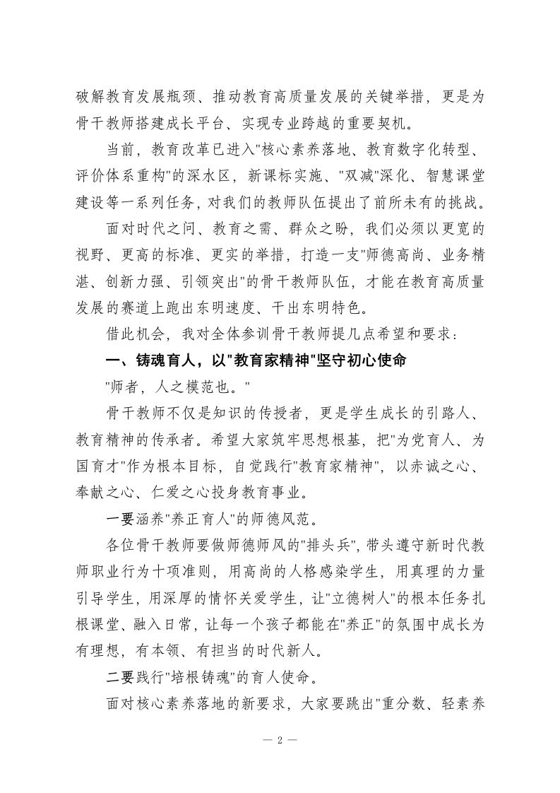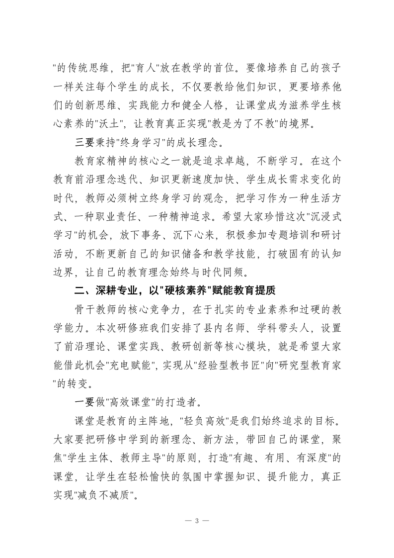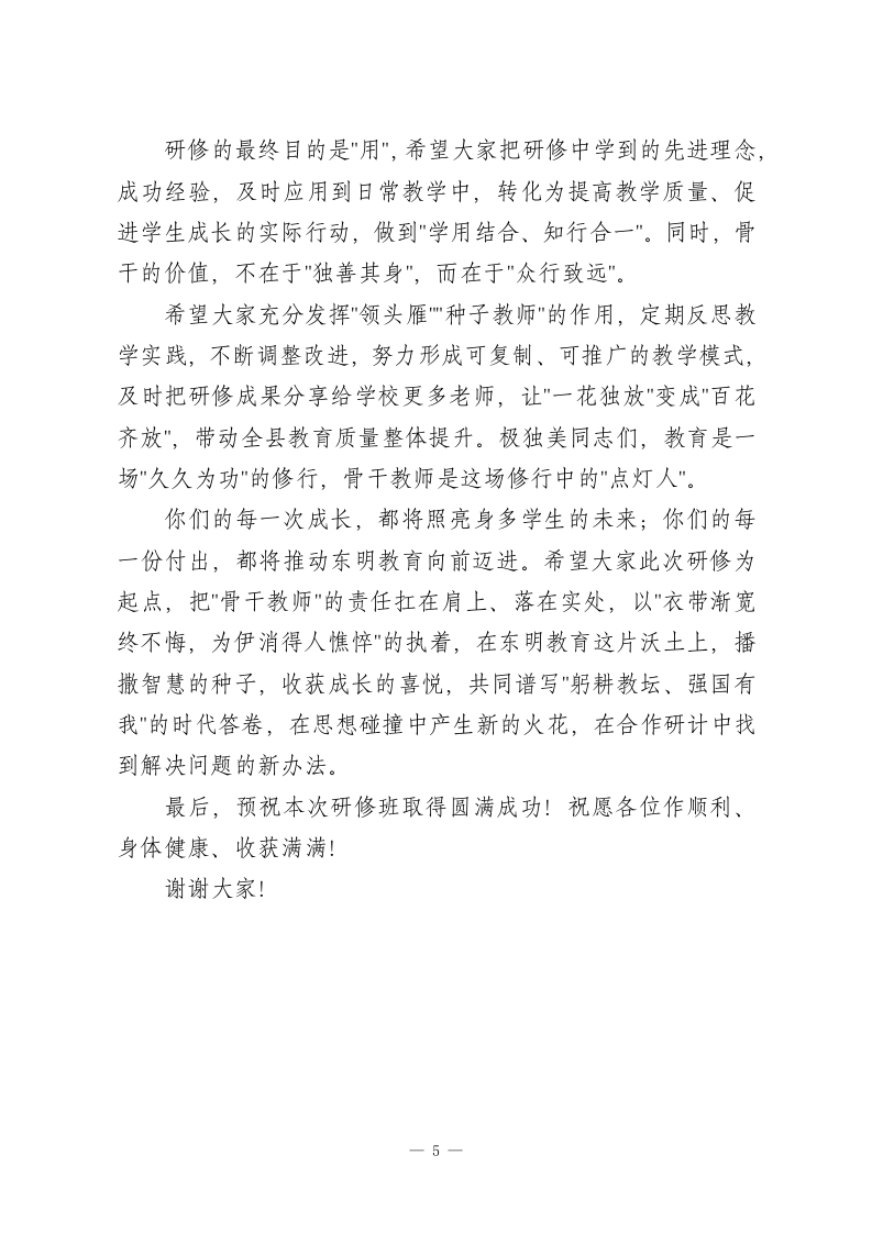 在县第二期骨干教师研修班开班仪式暨第一次集中培训上的致辞各位老师,同志们:草长莺飞春日暖,扬帆奋进正当时。在这个孕育希望、催生力量的美好时节,我们怀着对教育事业的赤诚与热爱,齐聚一堂,共同举行东明县第二期中小学骨干教师研修班第一次集中培训暨开班仪式。首先,向各位授课教师及全体参训的骨干教师,致以亲切的问候和崇高的敬意!骨干教师是教育的"中流砥柱”,是推动教育高质量发展的”核心引擎"。近年来,县委、县政府始终把教育摆在优先发展的战略位置,把建设高素质专业化创新型教师队伍作为教育提质升级的”第一推动力",积极改善办学条件,让"好学校"遍布城乡;我们精心组织4.5万余人次教师参加分层分类培训,让"好教师"不断涌现;我们深入实施"三名工程",选拔培育318名名师、名校长、名班主任,组建24个名师工作室,让"领头雁"引领方向;我们构建4个层级学科教研共同体,相关成果在全国70个项目县中排名第一,受到教育部通报表扬…这些成绩的取得,离不开全县广大教师的辛勤耕耘,更离不开在座各位骨干教师的示范引领、攻坚克难。今天,我们启动新一轮骨干教师研修班,既是落实国家“强师计划”、深化新时代教师队伍建设改革的具体行动,也是我县1