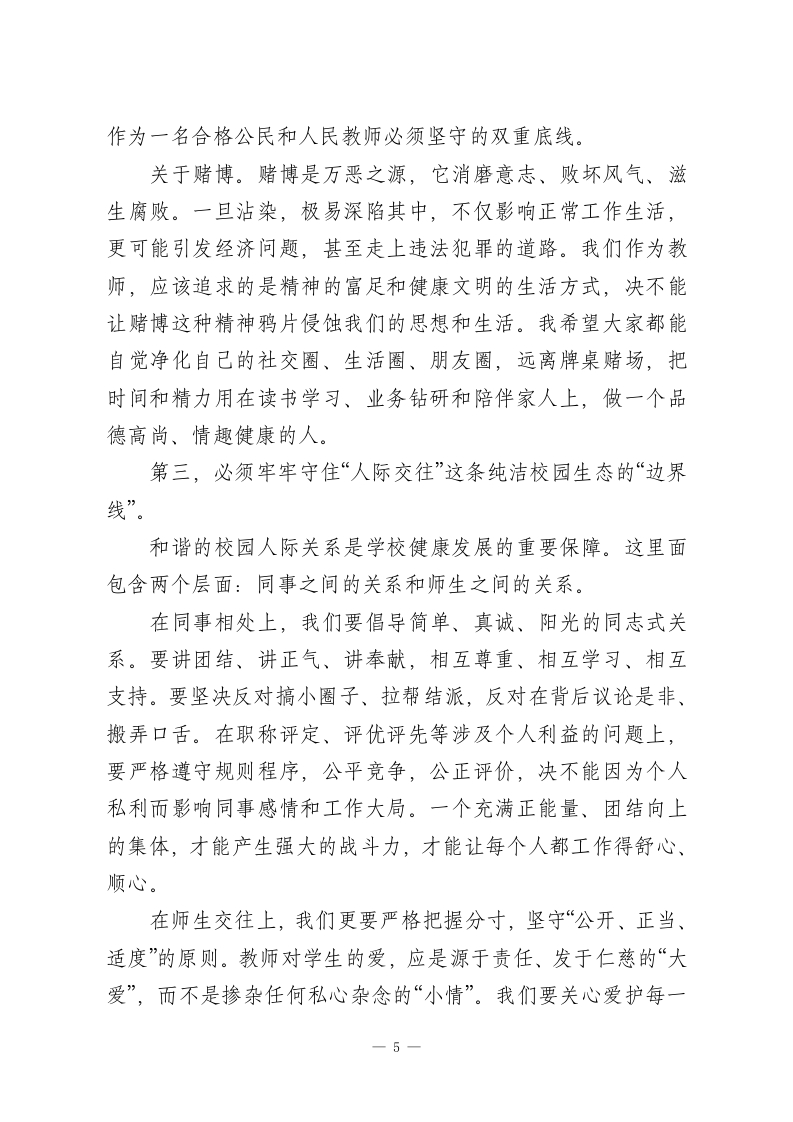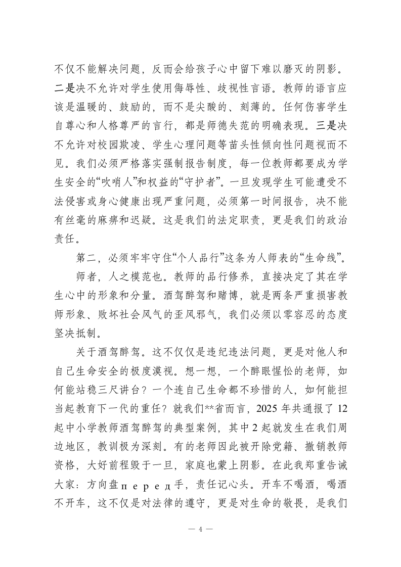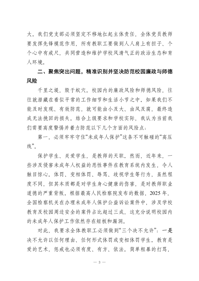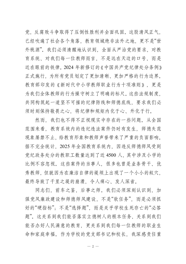 在小学党风廉政建设专题党课上的讲话:守纪律正师风护成长同志们:今天,我们在这里召开全体教职工大会,共同开展一次以“守纪律、正师风、护成长”为主题的党风廉政建设专题学习。这既是一次深刻的纪律教育,也是一堂严肃的师德党课,更是一场触及灵魂的思想洗礼。目的就是要进一步统一思想、凝聚共识,引导我们全体教职工深刻认识新时代全面从严治党向纵深发展的新形势、新要求,准确把握教育工作者肩负的特殊使命与重大责任,从而以更加坚定的信念、更加清醒的头脑、更加务实的作风,共同守护好*小学这片教育净土,全力护航每一个孩子的健康成长。下面,我将围绕三个方面,与大家进行交流。一、提高政治站位,深刻领会新时代加强师德师风与廉政建设的极端重要性教育是国之大计、党之大计。党的二十大报告擘画了以中国式现代化全面推进中华民族伟大复兴的宏伟蓝图,明确提出要“办好人民满意的教育”。作为国民教育体系的基石,小学教育是立德树人的起点,是为孩子扣好人生第一粒扣子的关键阶段。我们每一位教师,不仅是知识的传授者,更是学生品德的塑造者、灵魂的工程师。我们的一言一行,直接影响着学生的价值观念、道德情操乃至一生发展。因此,我们这支队伍的纯洁性、先进性,直接关系到党和国家事业的未来。近年来,党中央以前所未有的决心和力度推进全面从严治1