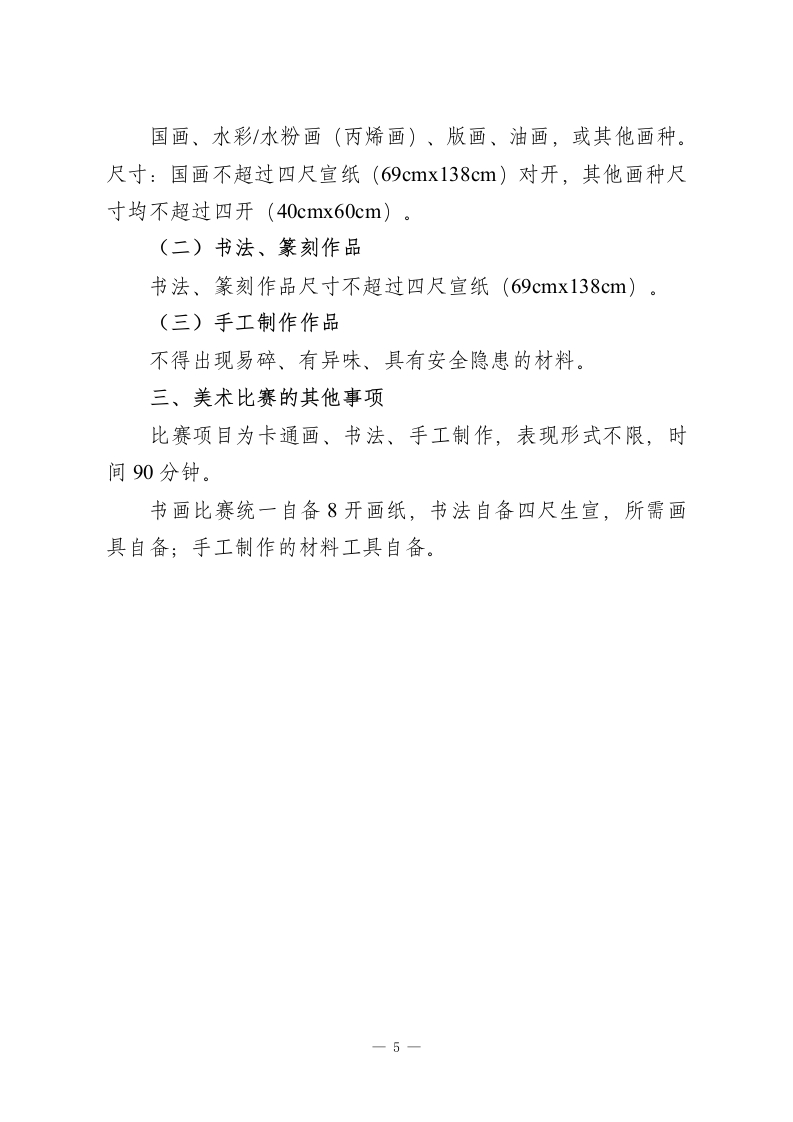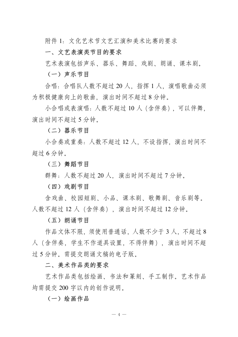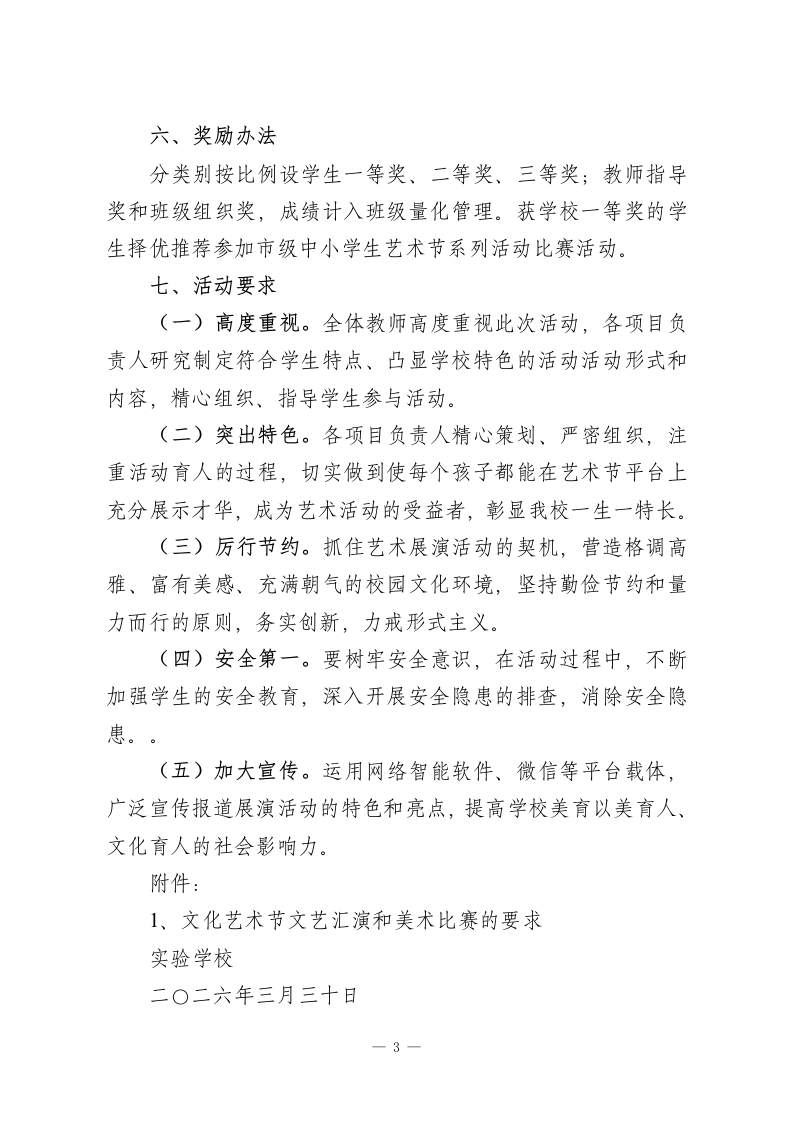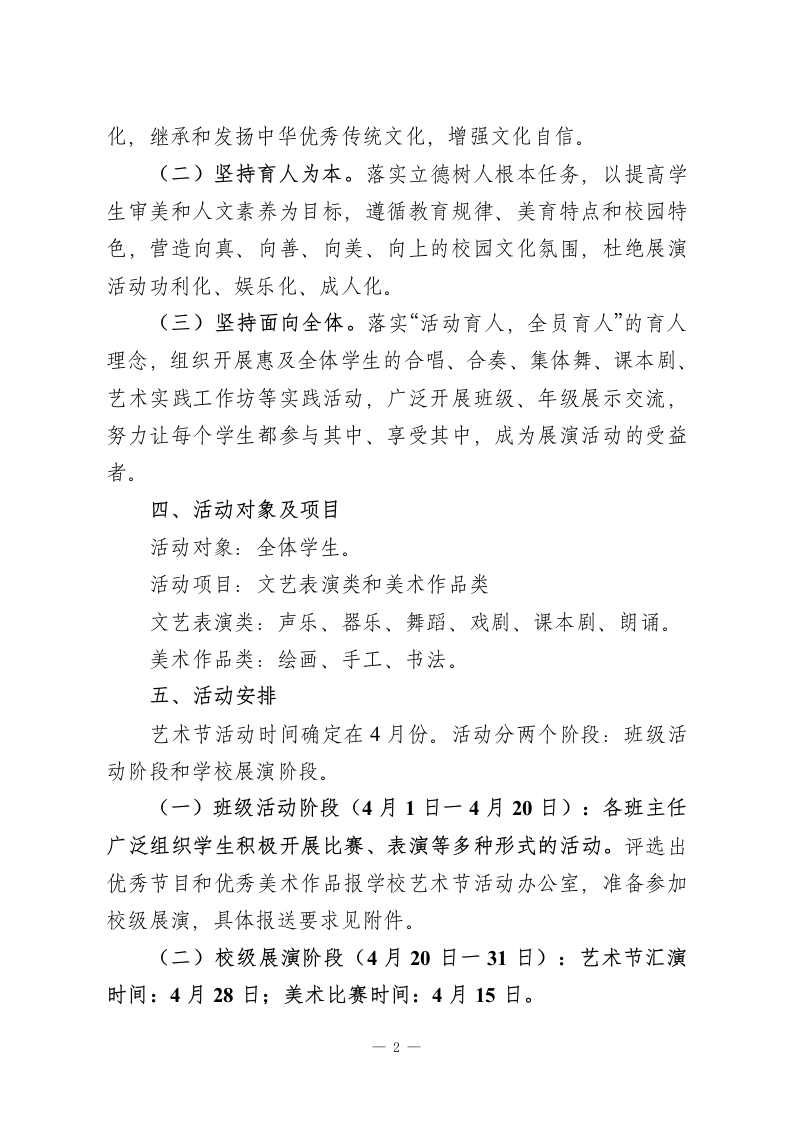 2026年春季学校艺术节活动实施方案一一在阳光下成长为深入推进素质教育,有效落实“双减”政策,充分发挥艺术教育的育人功能,营造积极向上、健康文明的校园文化氛围。培养学生良好的艺术修养,展示我校艺术教育成果,引导学生树立正确的审美观念、健康的审美情趣,促进学生德智体美全面发展。经学校研究决定举办2026年学校校园文化艺术节活动。一、指导思想以习近平新时代中国特色社会主义思想为指导,全面贯彻党的教育方针,落实立德树人根本任务,坚持以社会主义核心价值观为引领,坚持根植中华优秀传统文化深厚土壤,坚持以美育人、以美化人,引导学生树立正确的审美观念,陶冶高尚的审美情操,培养德智体美劳全面发展的社会主义建设者和接班人。二、活动主题本届艺术节活动的主题是“在阳光下成长”。艺术节活动的各项目和内容要紧紧围绕主题,全面展现新时代青少年学生热爱中国共产党、热爱祖国、热爱人民,树立远大志向、培育美好心灵,勤学上进、志存高远、奋发成长的昂扬风采。三、活动原则(一)坚持正确方向。培养和践行社会主义核心价值观,弘扬传承红色基因、结合学校“双减”政策的优势,立足校园文1
