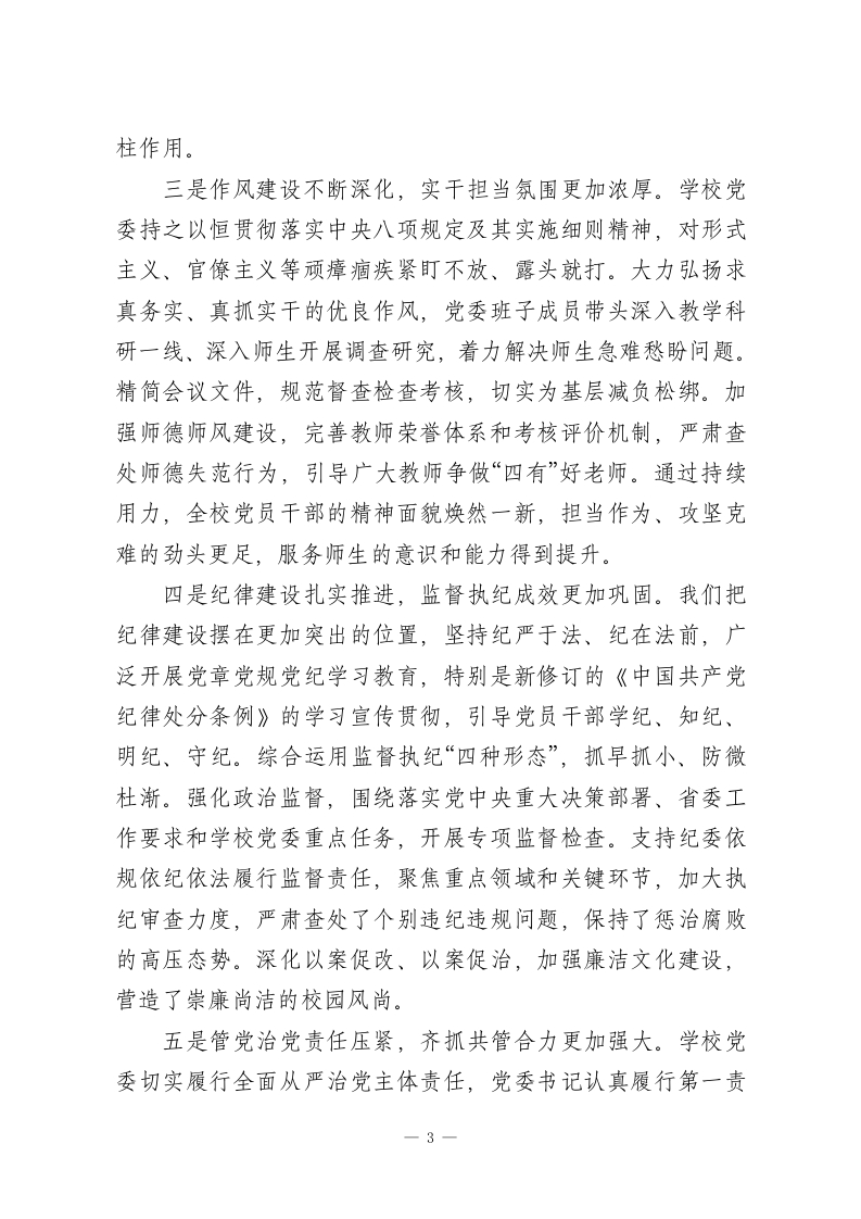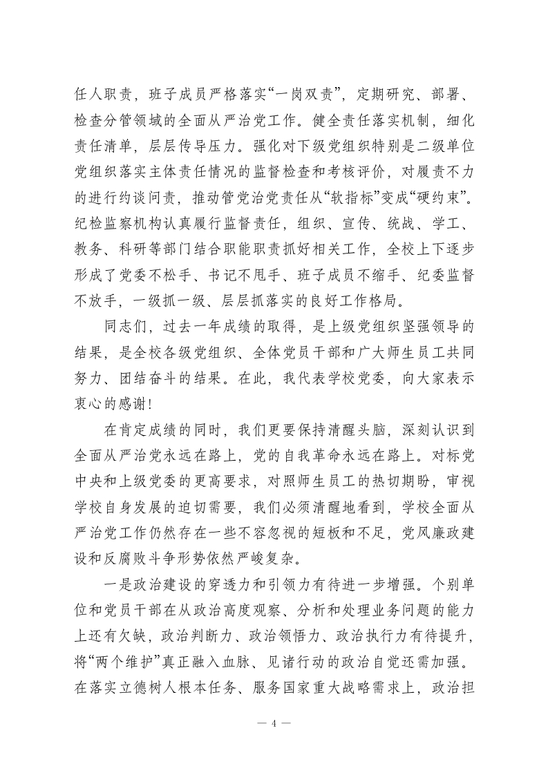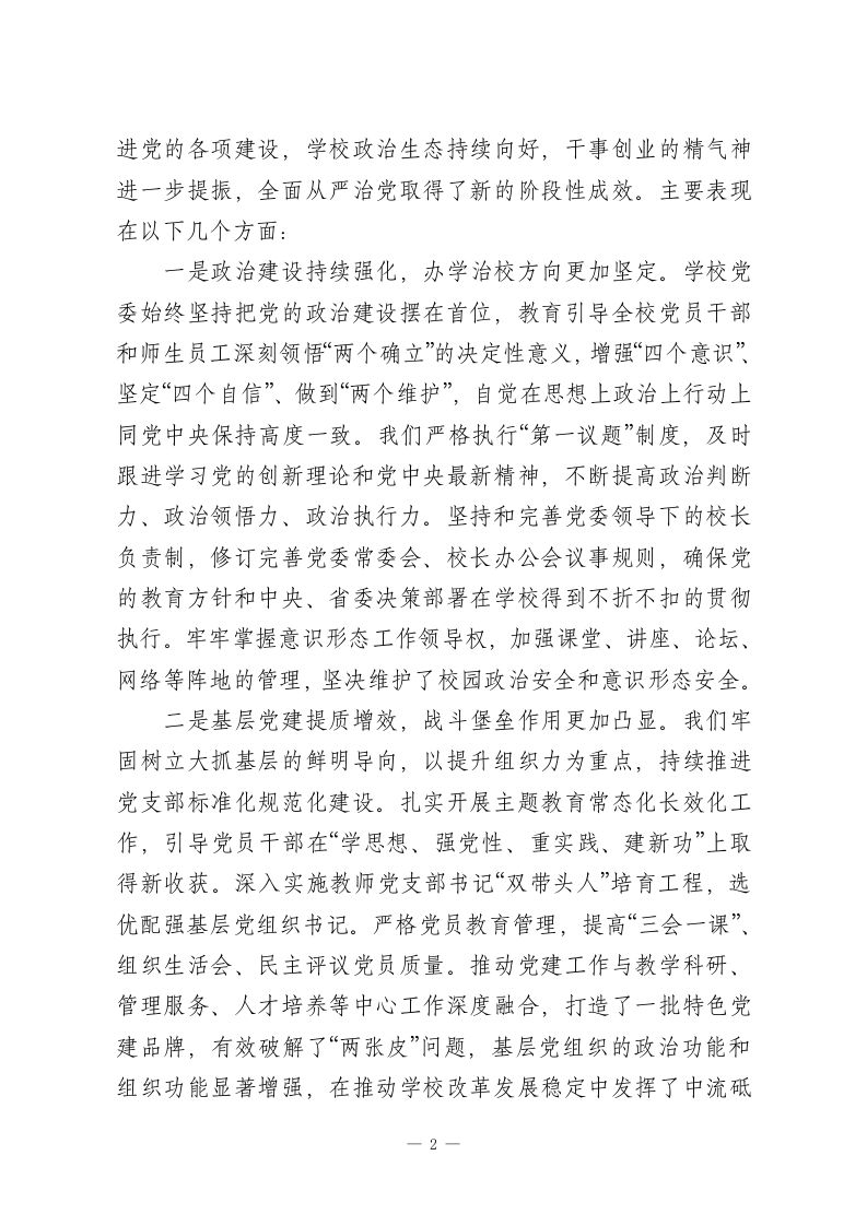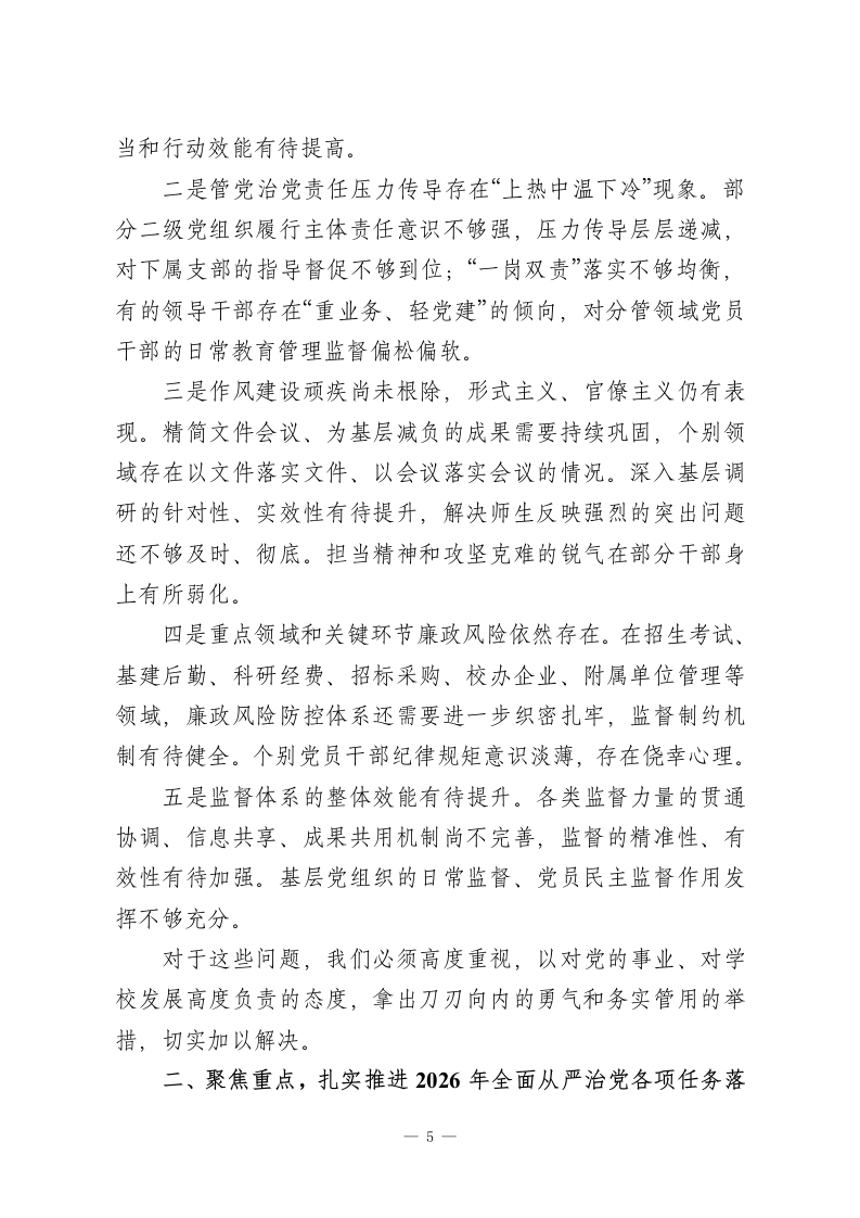 XXX学校党委书记在2026年全面从严治党工作会议上的讲话同志们:今天我们在这里召开学校2026年全面从严治党工作会议。这次会议的主要任务是:坚持以党的科学理论为指导,深入学习贯彻党的二十大及二十届历次全会精神,全面落实二十届中央纪委历次全会以及省、市纪委全会的部署要求,回顾总结过去一年学校全面从严治党工作,分析研判当前面临的新形势新任务,安排部署今年重点工作,动员全校各级党组织和全体党员干部进一步统一思想、提高认识,以更加坚定的决心、更加务实的作风,把严的基调、严的措施、严的氛围长期坚持下去,不断推动学校全面从严治党向纵深发展,为学校全力攻坚“一高一本”战略目标、加快建设特色鲜明的高水平学校提供坚强有力的政治引领和政治保障。刚才,XX同志代表学校纪委作了工作报告,系统总结了2025年纪检监察工作,并对2026年任务作了具体部署,我完全同意,请大家认真抓好落实。下面,我代表学校党委,讲三个方面的意见。一、回顾总结,客观看待过去一年全面从严治党工作取得的新成效2025年是学校发展进程中具有重要意义的一年。一年来,在上级党委的坚强领导下,学校党委坚决扛起管党治党政治责任,团结带领全校师生员工,以党的政治建设为统领,全面推1