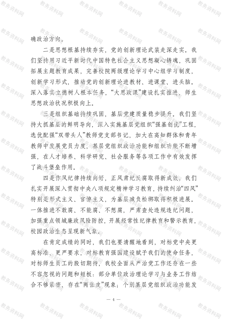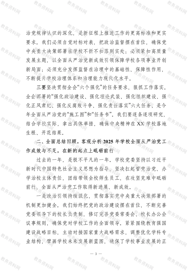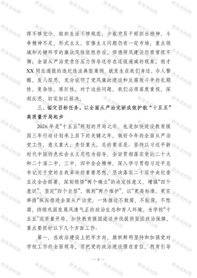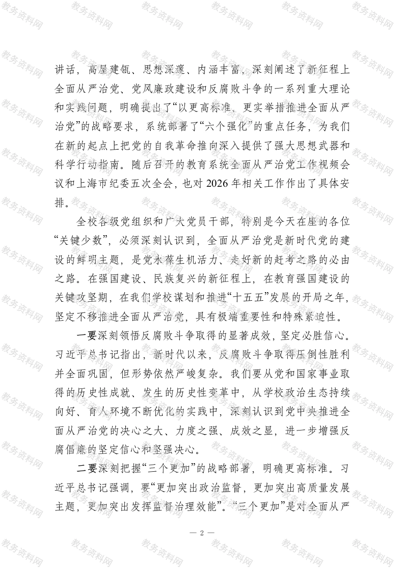 XXX学校党委书记在2026年全面从严治党工作暨警示教育会议上的讲话同志们:今天我们召开XX学校2026年全面从严治党工作会议暨警示教育会议。这次会议的主要任务是:深入学习贯彻习近平总书记在二十届中央纪委五次全会上的重要讲话精神,全面落实二十届中央纪委五次全会、2026年教育系统全面从严治党工作视频会议和十二届上海市纪委五次全会部署要求,总结我校2025年全面从严治党工作,分析当前形势,部署2026年重点任务,持续纵深推进学校全面从严治党,为学校立足教育强国建设大局,推动“十五五”高质量开局提供坚强政治保障。刚才,XX同志通报了学校纪委监督执纪工作情况,开展了深刻的警示教育,并对2026年纪检监察工作作出了具体部署。XX同志代表党委所作的工作报告,全面客观、重点突出,我完全同意。稍后,XX同志还要就贯彻落实会议精神提出具体要求,请大家认真学习领会,一并抓好落实。下面,我代表学校党委,讲四点意见。一、提高政治站位,深刻领会中央关于全面从严治党的新部署新要求,切实增强纵深推进全面从严治党的思想自觉和行动自觉今年1月召开的二十届中央纪委五次全会,是在“十五五”规划开局起步、我们党成立105周年的重要历史节点召开的一次具有里程碑意义的会议。习近平总书记在全会上发表的重要1