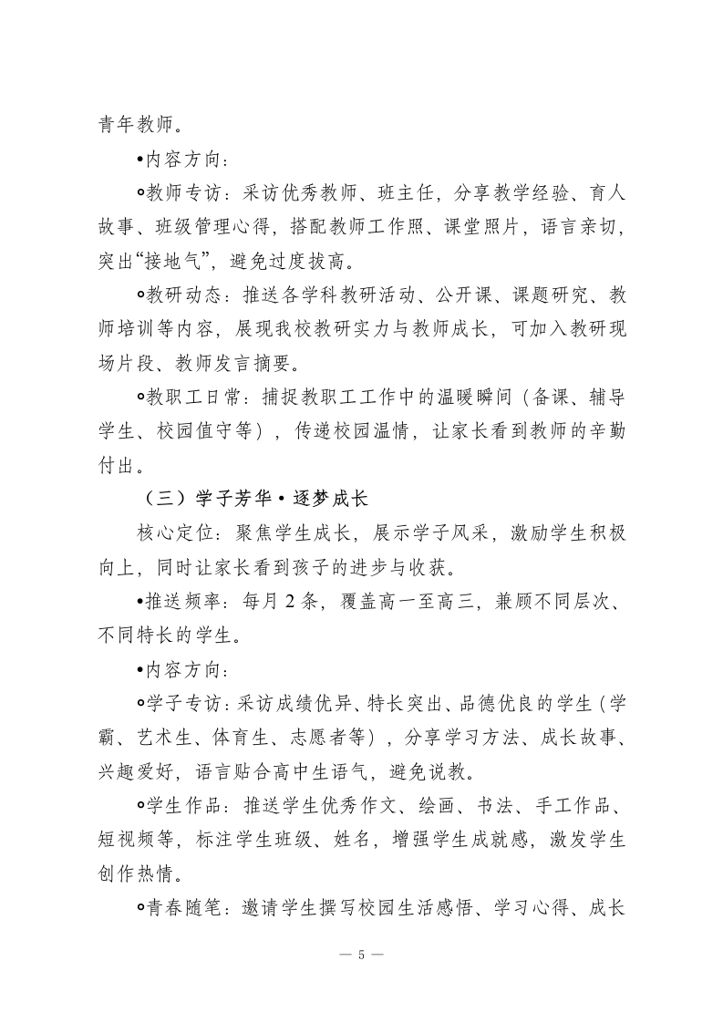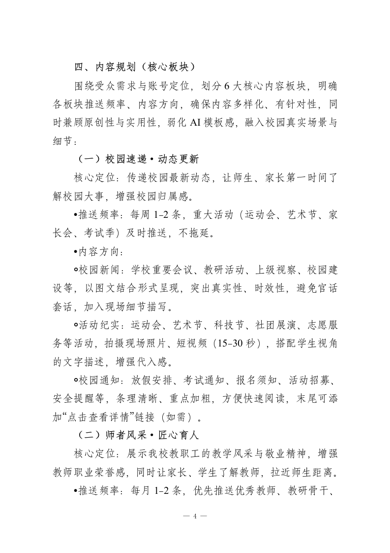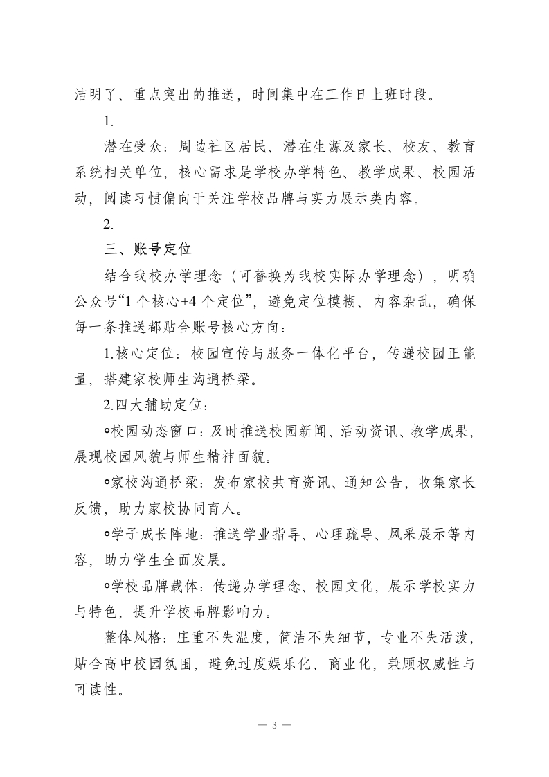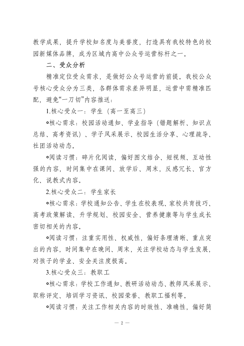 XX高中微信公众号2026年运营方案微信公众号作为高中校园宣传、家校沟通、师生联结的核心新媒体平台,是展示校园风貌、传递教育理念、服务师生家长的重要窗口。为进一步规范公众号运营,提升内容质量与传播力,充分发挥其桥梁纽带作用,结合我校办学特色、师生需求及校园工作重点,特制定本运营方案,确保公众号运营有序、内容优质、成效显著,助力校园文化建设与教育教学工作高质量推进。一、运营目标本方案以“立足校园、服务师生、联结家校、传递正能量”为核心,明确2026年运营核心目标,兼顾实用性与成长性,避免空泛化,确保可落地、可量化:1.粉丝增长:全年新增粉丝不少于1500人,粉丝总数较上一年增长30%,覆盖全校教职工、学生家长,辐射周边社区及潜在生源家庭,确保粉丝活跃度(月均互动率不低于5%)。2内容质量:打造有温度、有深度、有特色的校园内容,杜绝敷衍式推送,原创内容占比不低于70%,月均推送12-15条,单条平均阅读量较上一年提升25%,打造3-5条阅读量破千的爆款内容(校园活动、升学资讯、学子风采类优先)。3.功能发挥:完善公众号服务功能,实现通知公告、家校沟通、学业指导、校园动态等核心需求一键获取,提升师生、家长使用便捷度,满意度不低于90%。4.品牌塑造:通过优质内容传递我校办学理念、校园文化、1