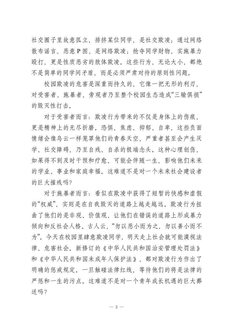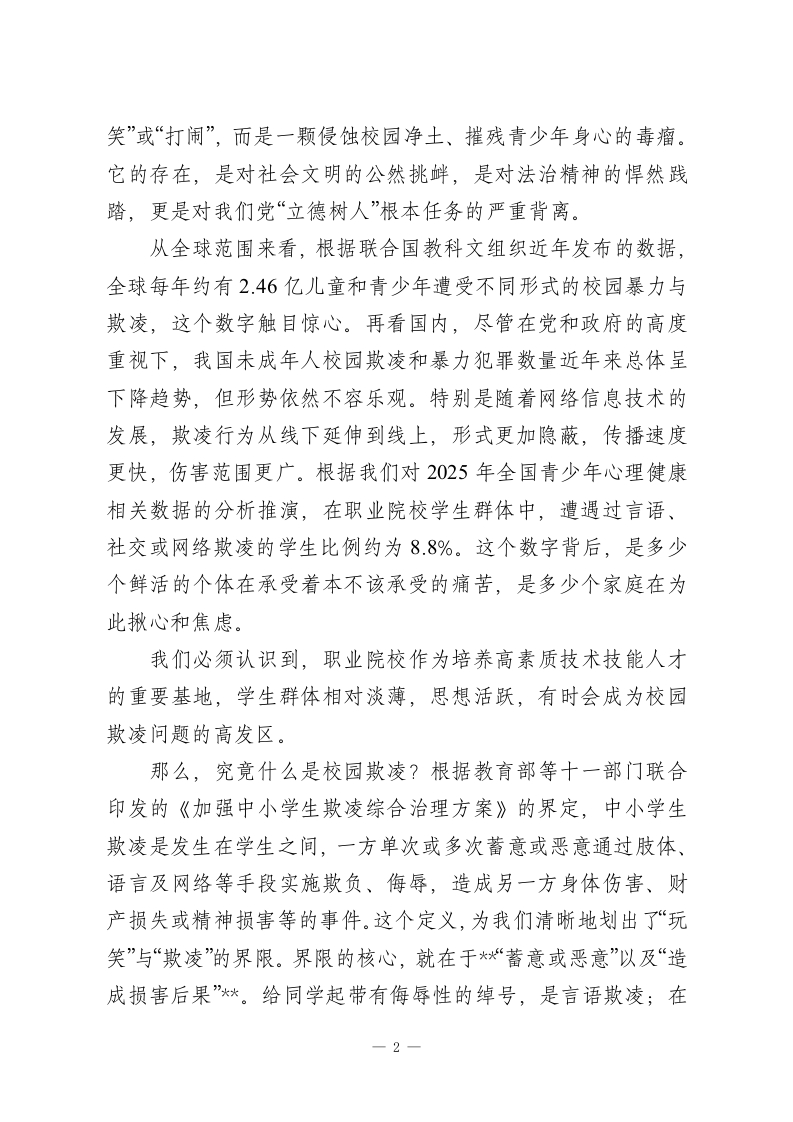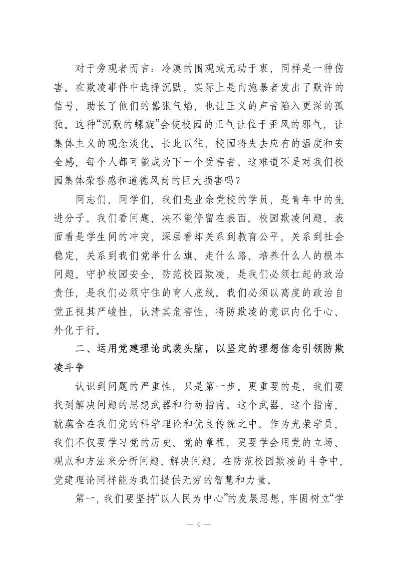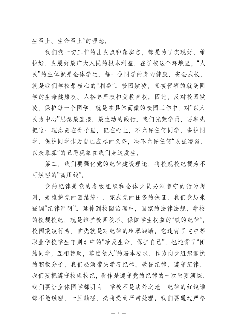 党课:筑牢思想防线勇担时代使命坚决向校园欺凌亮剑同志们,同学们:今天,我们XX职业中专青马工程培训班暨本期业余党校的全体学员汇聚一堂,举行这次专题党课,意义非凡。我们今天不谈空泛的理论,而是要聚焦一个与我们在座每一位同学的健康成长、与我们校园的和谐稳定、与我们国家未来的建设者和接班人培养息息相关的严肃课题一一拒绝校园欺凌,向校园欺凌亮剑。在座的各位,是经过层层选拔的学生骨干,是积极向党组织靠拢的先进分子,是未来肩负起民族复兴大任的青年马克思主义者。党的性质、党的宗旨、党的优良传统,就是在每一件具体的事、每一次具体的行动中,被人民所感知、所认同、所拥护的。因此,将防范校园欺凌这一议题纳入党课,不是小题大做,更不是偏离主题,而是要从讲政治、讲大局、讲担当的高度,深刻认识这一问题的本质,淬炼我们青年学子的思想武器,明确我们肩负的光荣使命。这既是落实教育部“健康第一”教育理念和“强化生命安全教育”重点任务的必然要求,更是我们用实际行动践行党的宗旨、守护青年成长的生动实践。今天,我将围绕三个方面,与大家进行深入的交流和探讨。一、深刻认识校园欺凌的严峻性与危害性,以高度的政治自觉筑牢安全底线首先,我们必须清醒地认识到,校园欺凌绝非无伤大雅的“玩1