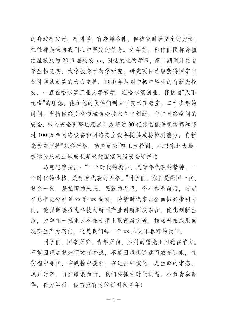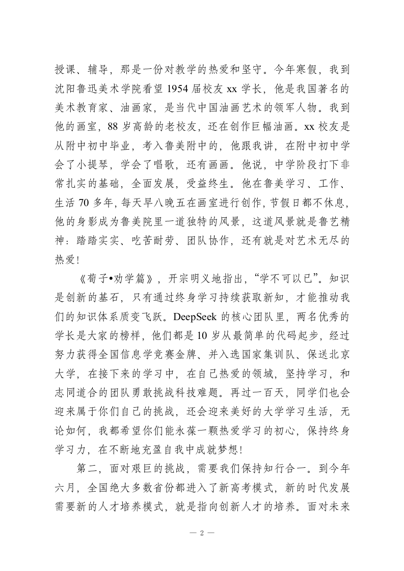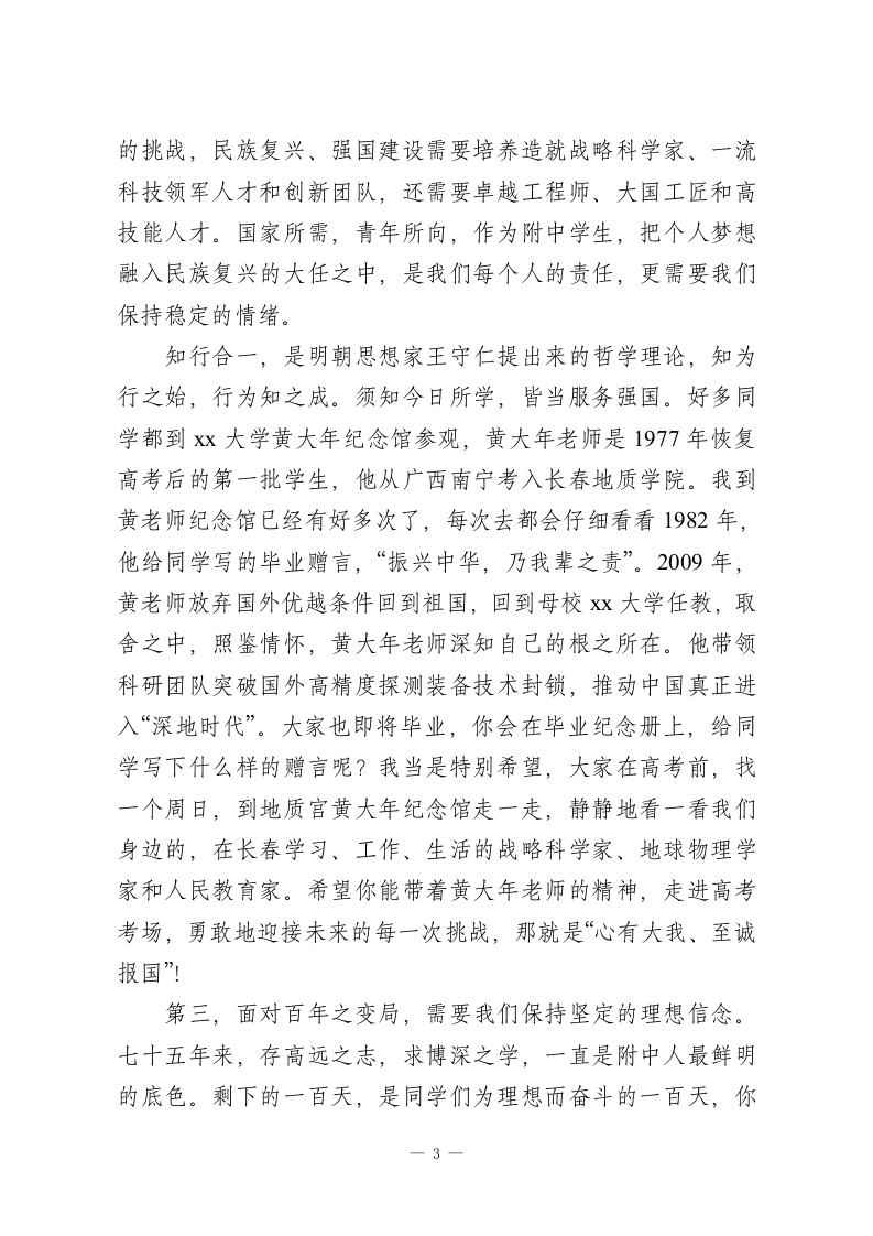 校长在高三年级下学期暨百日励志教育大会上的讲话(学校一中学)一一风正时济,自当踏浪而行尊敬的家长朋友,敬爱的老师们,亲爱的同学们:大家下午好!春天来了,自由、x校园内又迎来了朝气蓬勃的同学们,长庆街又因一个个活泼的紫色身影而热闹起来。今天,我们再次相聚在熟悉的体育馆,隆重举行2026届高三年级高考百日誓师仪式,共同见证这振奋人心的一刻。高三的开学典礼上,我嘱托同学们要“勇敢出发”,在高三的征途上,要走出附中人的气势,大家的努力和成绩我们有目共睹!如今,三年的高中生活已经接近尾声,班级日历上的高考倒计时已经变成两位数,胜利的曙光就在前方。同学们,我们正迎接新一轮科技革命,从蒸汽机发明,推动了机器工业的发展;到内燃机的发明,让人类进入电气时代;第三次科技革命,电子计算机的发明,推动了高新技术发展,让人类进入信息化时代。面对第四次科技革命,我们身临其境身在其中,又将会改变什么呢?面对大数据、大模型的人工智能化的时代,我们将如何学习、工作、生活?今天,我想以“让我们一起创新向未来”为主题,和大家讲讲我的理解。首先,面对未知的明天,需要我们保持终身学习力。“为学生一生奠基,对民族未来负责”是附中教育的首要理念,三年里,大家一定遇见过很多老师,从教几十年还坚持一丝不苟地备课、1