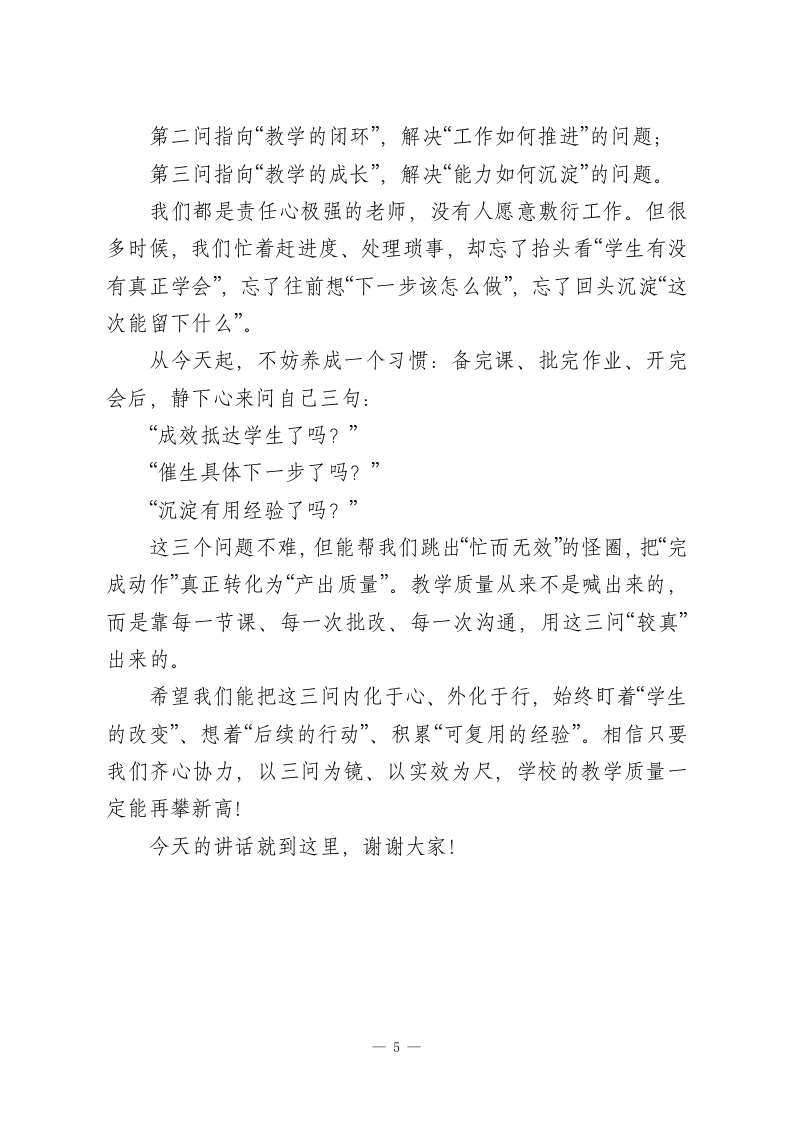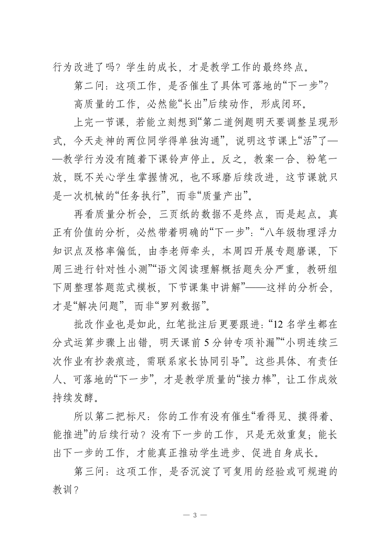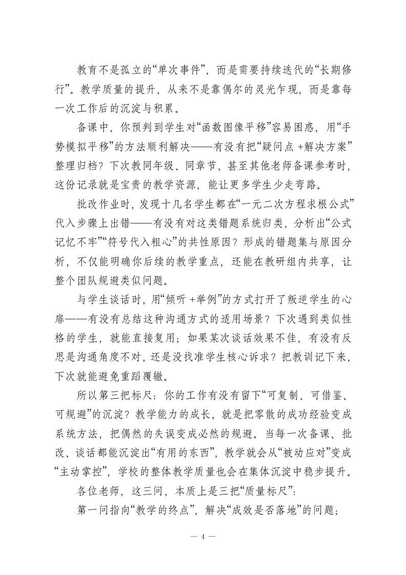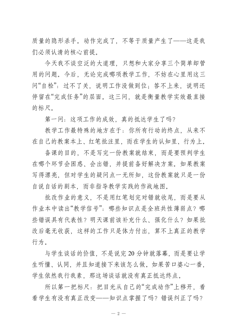 校长在教师例会上发言:以三问破局,以实效立教各位老师:开学半月以来,我几乎每日都在各年级巡课走访一一不占用完整课时,仅在教室后排驻足观察片刻,翻阅学生作业本,或是随机与几位学生交流几句。这段时间的观察,让我有一个深刻的感受:大家都在勤恳忙碌,但工作成效却参差不齐。同样是备课,有的老师教案工整规范,可我翻看班级随堂练习时发现,超半数学生未能掌握上节课核心知识点。教案完成了,课程上完了,但“学生学会”这个核心目标并未达成。同样是批改作业,有的老师坚持每日收发、批注详实,可我随机询问学生:“老师的批注都看懂了吗?错题现在会做了吗?”孩子往往一愣,摇了摇头。作业批改的流程走完了,但批改的反馈并未真正转化为学生的纠错动力。上周某年级的考试质量分析会,会议记录写了满满三页,平均分、优秀率、及格率等数据一应俱全。可当我问年级组长:“分析之后,各学科针对薄弱环节的改进措施是什么?谁来牵头?何时能看到成效?”他却坦言“尚未落实”。没有后续行动的三页纸分析,终究只是一场“数据朗读会”。我并非要指责谁一一这些老师态度认真、毫无敷衍,问题的根源不在于“不努力”,而在于我们缺少一套清晰的标尺,来界定“做好教学”的真正内涵。很多时候,我们觉得“该做的都做了”,便默认“没问题”,但这种“大概还行”的状态,恰恰是教学1