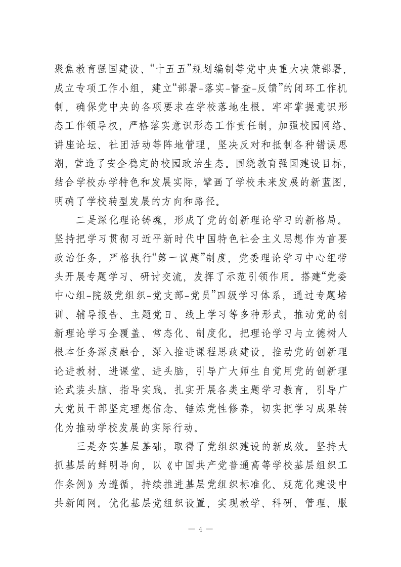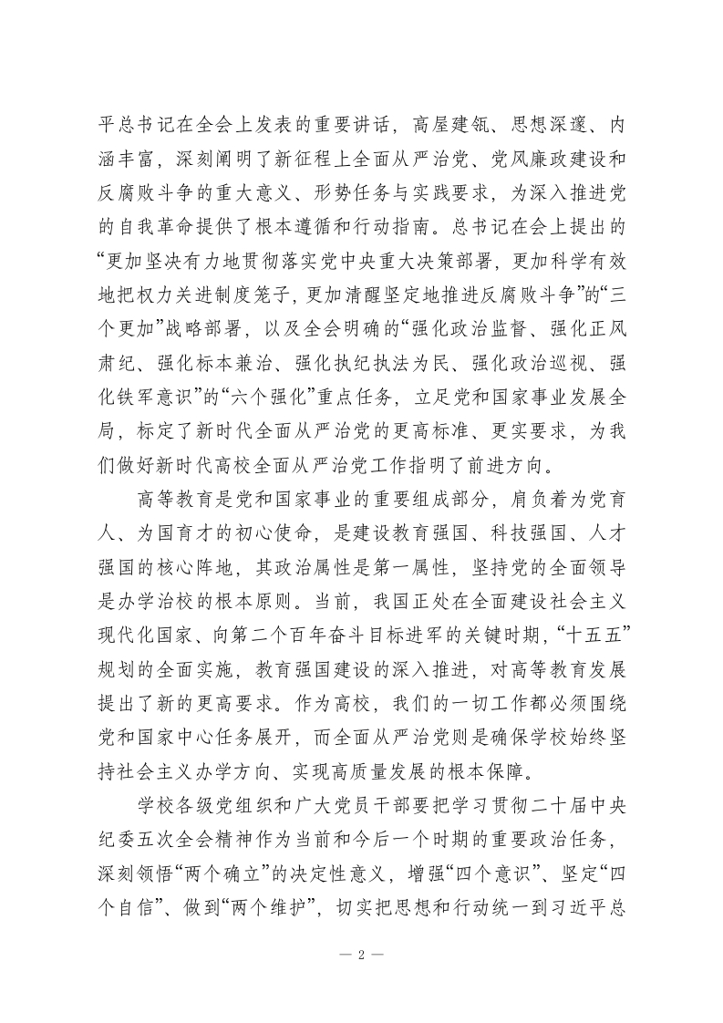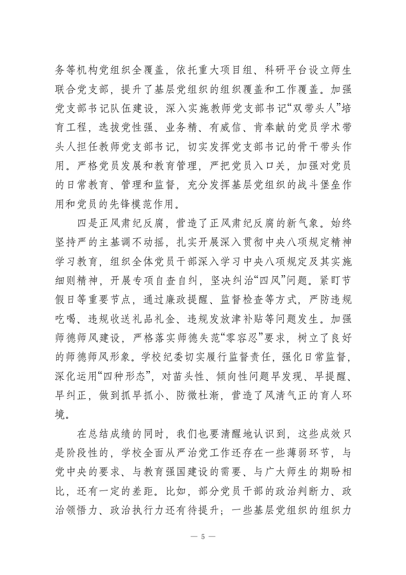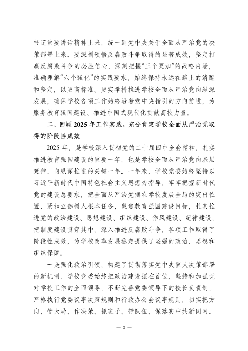 学校党委书记在2026年全面从严治党工作暨警示教育会议上的讲话各位同志:今天,我们齐聚一堂,召开学校2026年全面从严治党工作会议暨警示教育会议,这是学校在“十五五”规划开局起步、党成立105周年的重要历史节点,在加快建设教育强国三年行动计划承上启下的关键之年,召开的一次具有全局性、战略性的重要会议。会议的主要任务是,深入学习贯彻习近平总书记在二十届中央纪委五次全会上的重要讲话精神,全面落实二十届中央纪委五次全会、2026年教育系统全面从严治党工作视频会议和十二届上海市纪委五次全会部署要求,总结学校2025年全面从严治党工作,分析当前面临的形势任务,部署2026年重点工作,持续纵深推进学校全面从严治党,为学校立足教育强国建设大局、推动“十五五”高质量开局提供坚强政治保障。刚才,校长同志主持会议,对本次会议的召开提出了明确要求,纪委书记同志后续将通报学校纪委监督执纪工作情况、开展警示教育并部署2026年纪检监察工作,希望大家认真学习领会、抓好贯彻落实。下面,我代表学校党委,讲三个方面的意见。一、深刻领悟二十届中央纪委五次全会精神,准确把握新时代全面从严治党的战略要求二十届中央纪委五次全会是在“十五五”开局起步、我们党踏上新的百年奋斗征程的关键时期召开的一次重要会议。习近1
