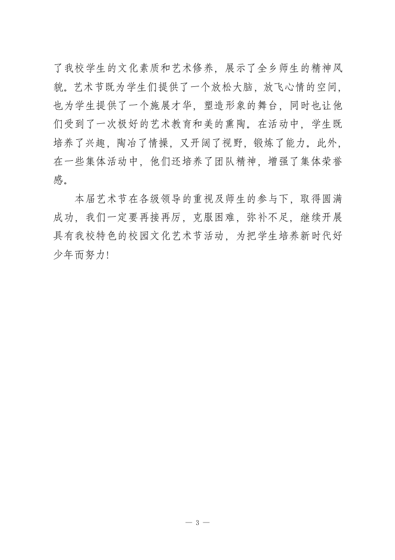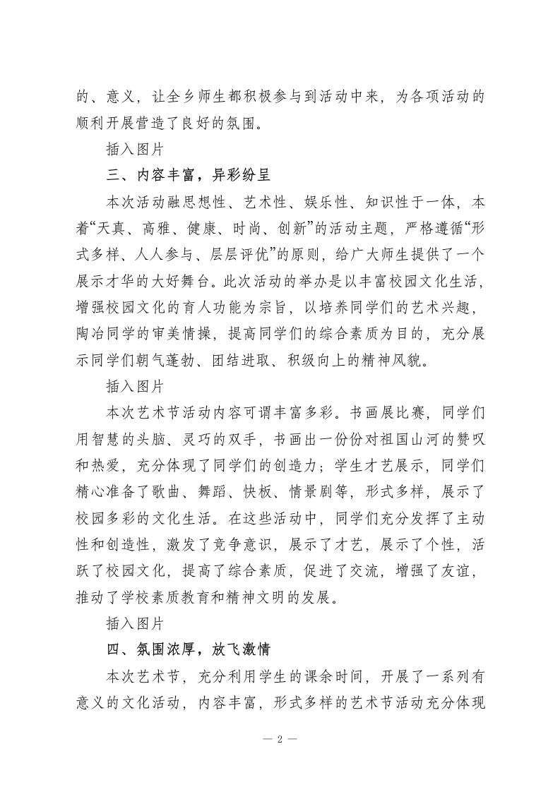 学校校园文化艺术节活动总结(通讯稿)为了我校师生校园文化生活,培养学生们健康审美情趣与良好的艺术修养。根据教育局艺术节活动的通知精神,强化学校艺术教育工作,加强学校校园文化艺术环境建设,发挥艺术教育的育人功能,营造良好的艺术教育氛围,促进学生德智体美全面发展,推进学校艺术教育的改革和发展,我校举办了2026年校园文化艺术节活动。插入图片一、强化领导,认真部署领导重视是加强艺术教育,构建和谐校园的前提和保证。艺术教育作为素质教育的一种载体,有助于学生获得丰富的情感体验,有助于开发智力,健全人格,艺术教人生活的方式。学校成立了校园艺术节领导小组。对于整个艺术节的活动设想,每个单项目的落实都经过例会,商讨、修订、完善,并把每项活动都落实到校、班、落实到人。认真实施,各班积极能够积极配合,不推不靠,使得每一项活动都开展得有始有终、有声有色,达到了预期的效果。插入图片二、广泛宣传,营造氛围为了进一步组织好本次校园文化艺术节活动,学校艺术节领导小组围绕“在歌声中成长”这一主题,进行了精心的策划、准备。制定艺术节活动方案,方案出台后,为了使校园艺术节深入人心,学校利用校园广播、黑板报广泛宣传此次活动的目1