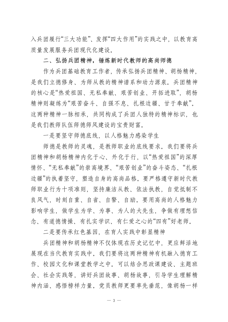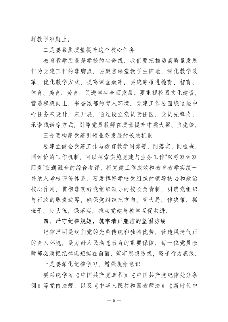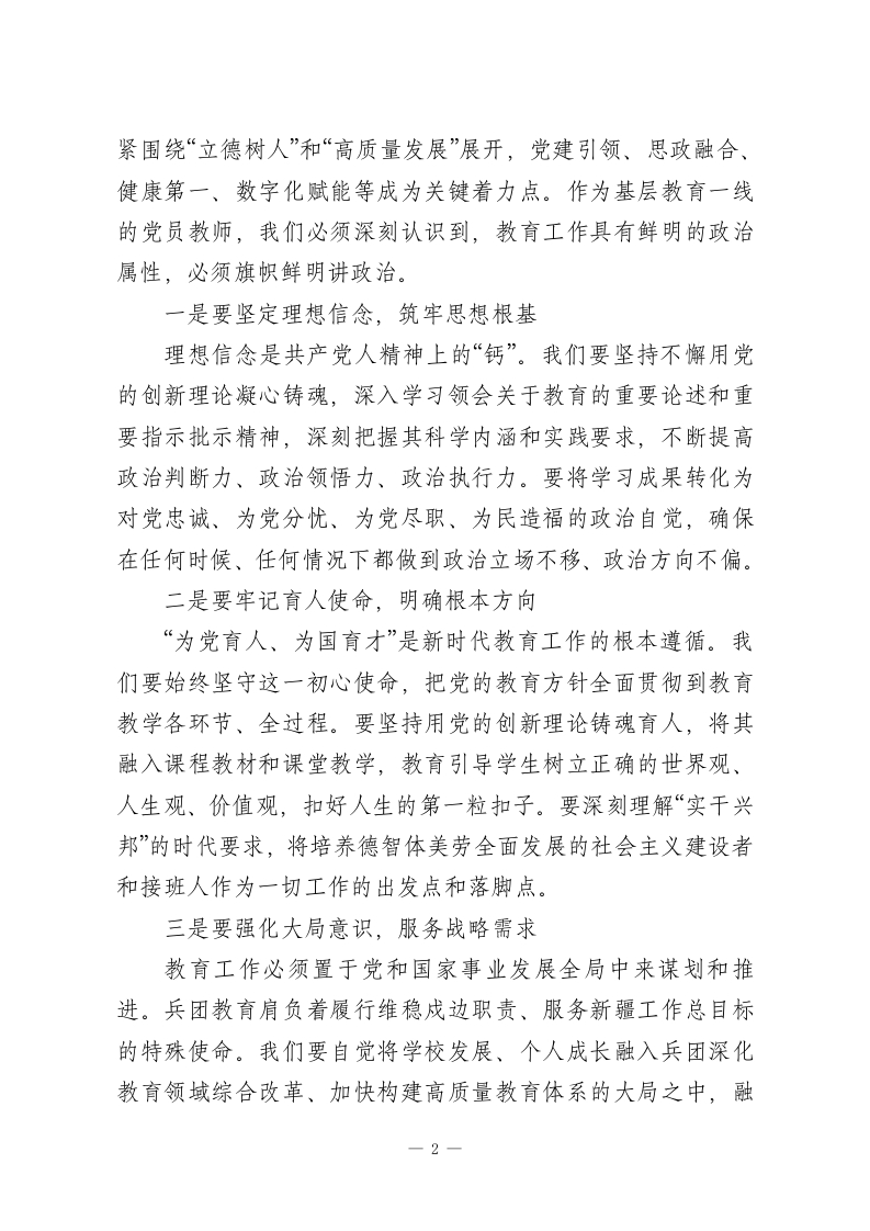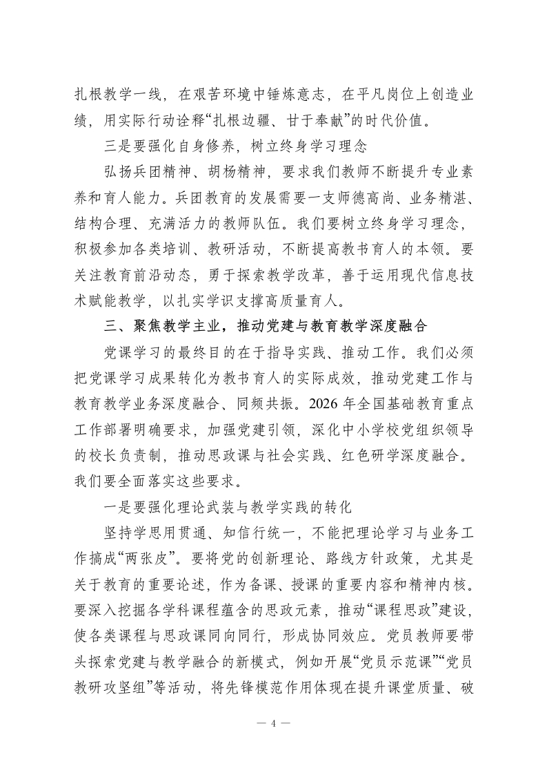 在XX团第一中学全体党员大会上的党课讲稿:坚守育人初心,勇担教育使命同志们:今天,我们齐聚一堂,召开这次专题党课,主要任务是深入学习贯彻党的最新理论成果,强化党员教师思想政治建设,推动党建与教育教学深度融合。本次党课的主题是“坚守育人初心,勇担教育使命”,参训范围包括学校全体党员干部。在当前全党全国上下深入实施科教兴国战略、奋力谱写教育强国建设新篇章的关键时期,在“十五五”规划开局之年的重要节点,组织这次专题学习,旨在进一步统一思想、凝聚共识,激励全体党员教师以更高站位、更强担当、更实作风,投身于为党育人、为国育才的伟大实践,为学校高质量发展和办好人民满意的教育贡献先锋力量。党课紧扣为党育人、为国育才根本任务,结合兵团教育与学校发展实际,围绕以下几个方面展开系统讲解。一、提高政治站位,深刻把握教育工作的根本遵循党员教师是学校发展的中坚力量,必须始终把政治建设摆在首位。这既是党对教育工作者的根本要求,也是我们履行职责使命的前提基础。当前,我们正处在建设教育强国的历史新征程上,基础教育作为国家发展的基石,承担着培养时代新人、提升国民素质的战略任务。党的二十大报告明确提出“实施科教兴国战略”,强调教育的基础性和战略性地位,并设定了到2035年建成教育强国的宏伟目标。2026年,基础教育工作的主线紧1