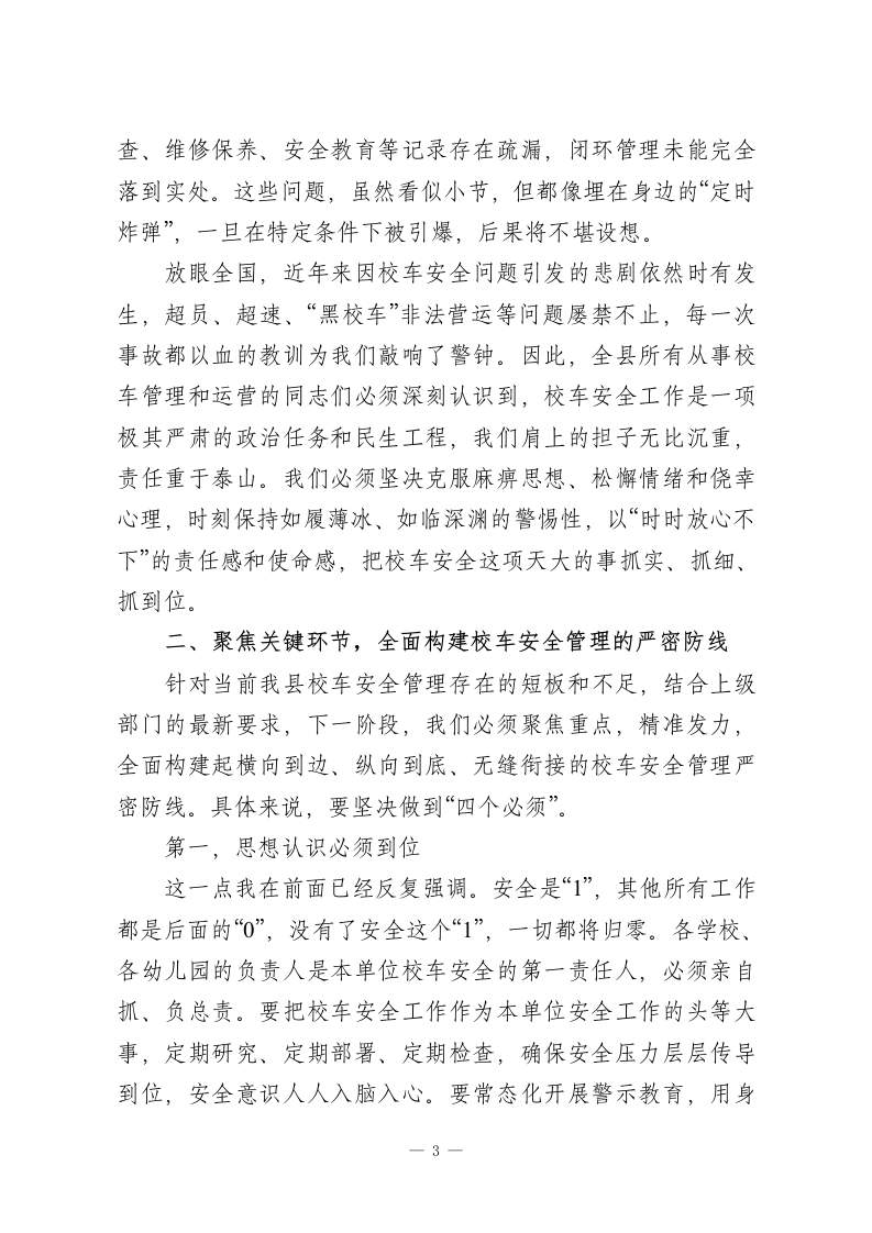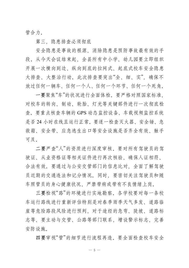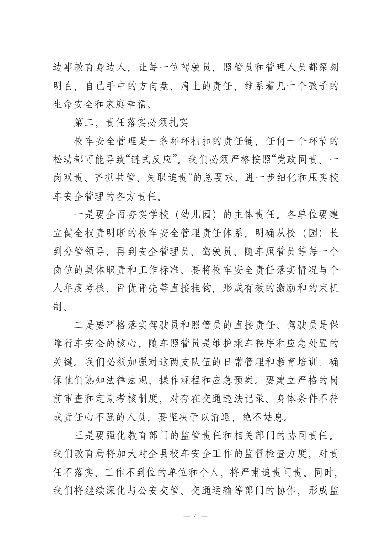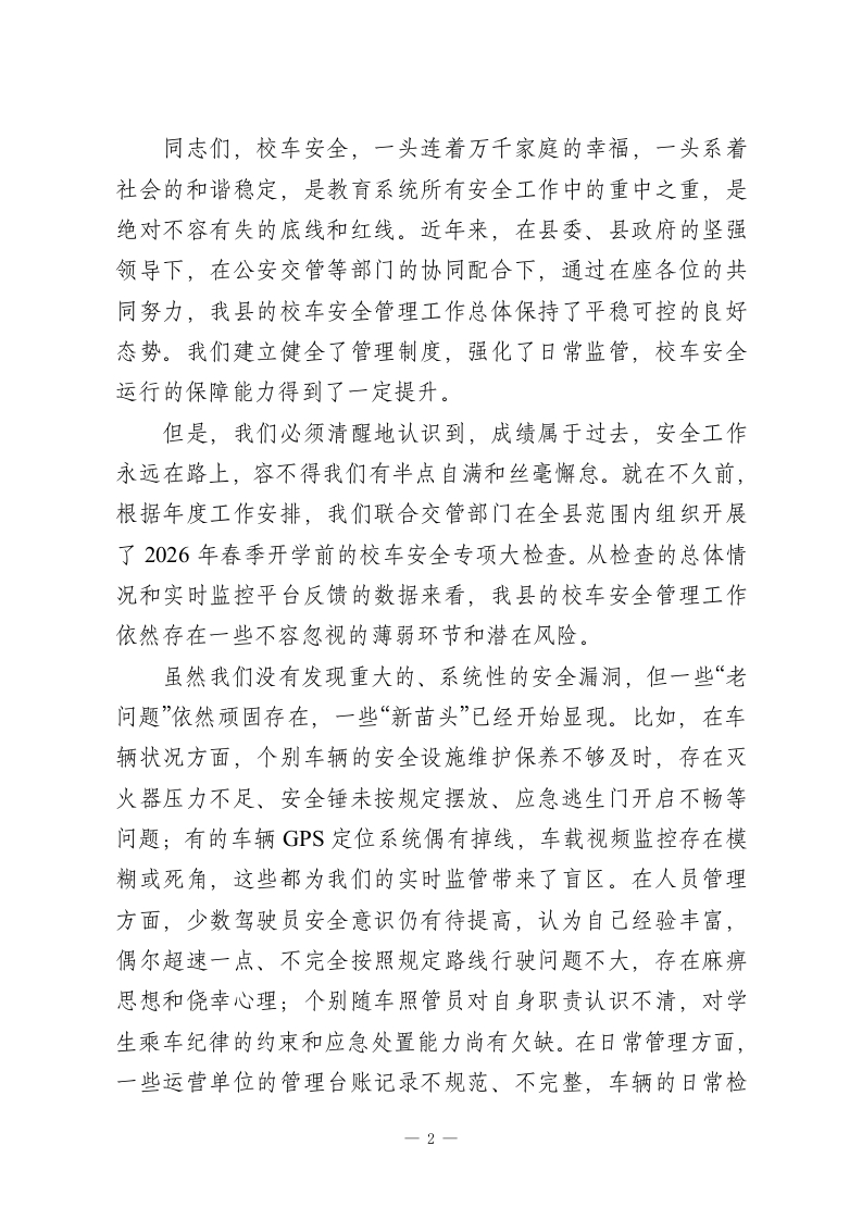 在XX县2026年春季校车安全管理工作会议上的讲话同志们:大家好!春回大地,万物复苏。在这新学期全面开启的关键节点,今天,我们县教育局联合县公安局交通管理大队,在这里隆重召开2026年春季校车安全管理工作会。首先,我代表县教育局,向长期以来奋战在校车安全管理第一线的各位同志,包括我们各中小学的校车主管领导、运营校车幼儿园的园长们、中心小学的工会主席,以及每一位肩负责任的驾驶员和随车照管员同志们,表示衷心的感谢和诚挚的问候!同时,我们也要特别感谢县公安局交通管理大队对我们教育系统安全工作的大力支持,今天何韦同志还将为我们带来专业的交通安全知识培训,希望大家认真听讲,学以致用。本次会议的主要任务是,深入分析当前我县校车安全管理工作面临的新形势、新挑战,全面总结近期安全检查中暴露出的问题与不足,并对下一阶段,特别是整个春季学期的校车安全重点工作进行再强调、再部署、再落实。目的只有一个,那就是动员全县所有校车运营管理相关单位和人员,进一步统一思想、提高认识、压实责任,以最高标准、最严要求、最实举措,坚决筑牢学生上下学途中的交通安全防线,确保全县每一位乘坐校车的学生都能高高兴兴上学、平平安安回家。一、认清严峻形势,深刻把握校车安全工作的极端重要性1