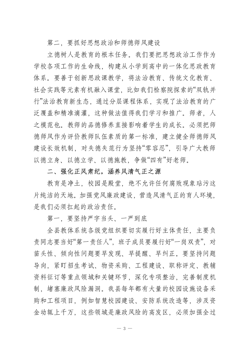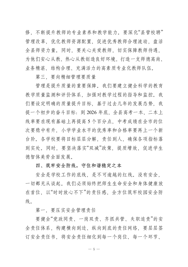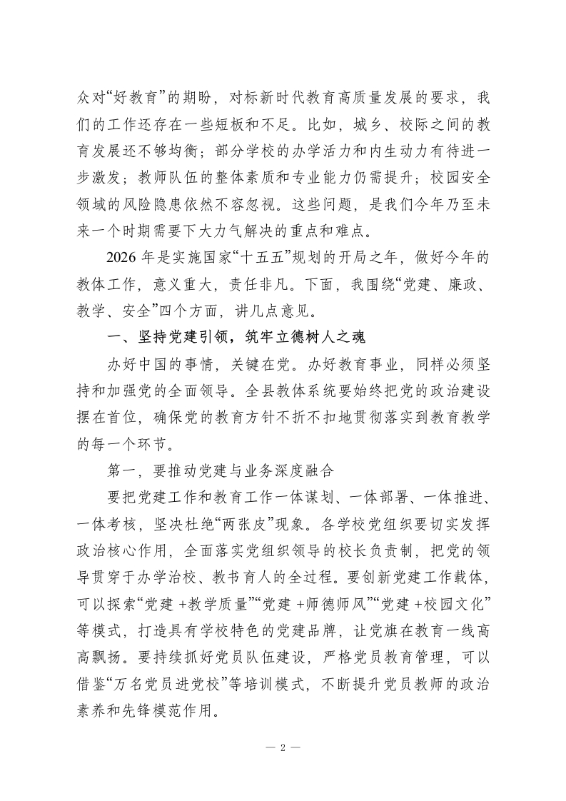 在XX县教体系统重点工作会议上的讲话同志们:今天,我们在这里召开全县教体系统重点工作会议,主要任务是深入学习贯彻上级关于教育工作的系列重要指示精神,全面总结过去一年的工作,分析当前面临的形势与挑战,安排部署2026年全县教体系统的各项重点任务。这次会议既是一次回顾总结会,更是一次凝心聚力、砥砺前行的动员部署会。希望大家能够统一思想、提高认识,以高度的责任感和使命感,共同谋划好、落实好今年的各项工作。过去的一年,全县教体系统广大干部职工、教育工作者辛勤耕耘、默默奉献,推动我县教育体育事业取得了新的显著成绩。我们坚持教育优先发展战略不动摇,财政性教育经费投入持续增长,占一般公共预算支出的比例超过20%,为教育发展提供了坚实保障。我们的办学条件得到持续改善,合作办学模式成效斐然,以XX师范大学附属XX中学为代表的一批优质学校,已经成为我们XX教育的闪亮名片,其一本上线率超过92%,每年都有超过10名优秀学子考入国内顶尖学府,真正实现了“低进高出、高进优出”的育人目标,有效带动了全县教育教学质量的整体攀升。我们的教师队伍建设不断加强,校园安全防线愈加牢固,党建引领作用日益凸显。这些成绩的取得,凝聚着在座各位以及全县一万一千多名教职员工的心血和汗水。在此,我代表县委,向大家表示衷心的感谢和崇高的敬意!在肯定成绩的同时,我们更要清醒地认识到,对标人民群1