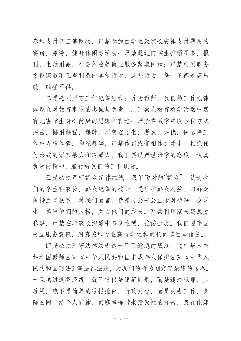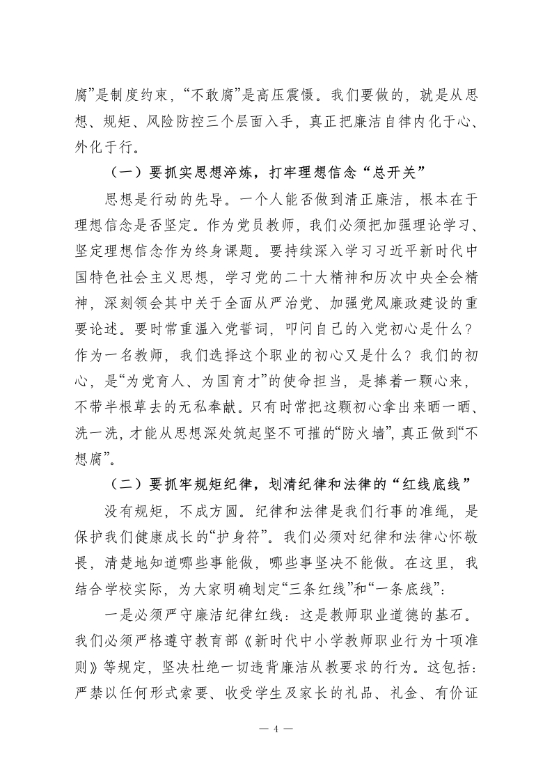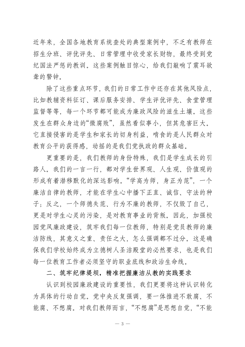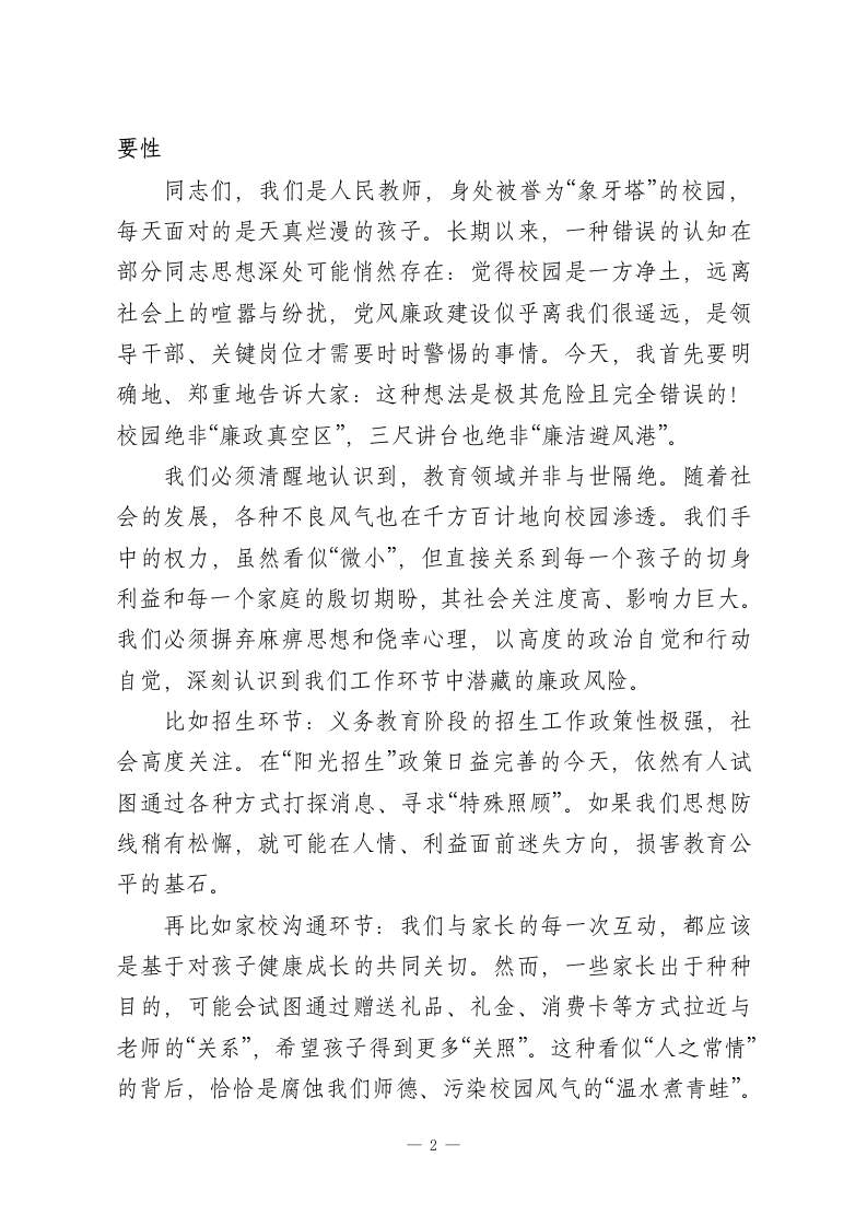 专题党课:坚守廉洁初心,勇担育人使命同志们:大家好!今天,我们X小学全体党员教师齐聚一堂,举行这次意义深远的党风廉政建设专题党课。我今天主讲的题目是*《坚守廉洁初心,勇担育人使命》*。之所以选择这个题目,之所以在当前这个时间节点与同志们深入探讨廉洁从教这一重大课题,是因为党风廉政建设和反腐败斗争是我们党必须抓好的重大政治任务,而对于我们教育工作者而言,这不仅是政治要求,更是我们立德树人、铸魂育人神圣使命的根本保障。党的二十大以来,以习近平同志为核心的党中央对全面从严治党作出了战略部署,反腐败斗争取得压倒性胜利并全面巩固。进入2026年,从中央到地方,全面从严治党的号角愈发嘹亮。就在不久前,全省、全市教育系统都相继召开了党风廉政建设工作会议,明确要求以更高标准、更严要求、更实举措,纵深推进教育系统全面从严治党,持续营造风清气正的教育政治生态。这股清风,必须吹遍教育领域的每一个角落,我们身处的基础教育一线,更是这阵清风中的前沿。因此,举办这次党课,目的就是要引导我们全体党员教师,深刻认识新时代党风廉政建设的重大意义,准确把握廉洁从教的核心要义,从而以更加坚定的信念、更加纯粹的党性、更加高尚的师德,共同守护我们校园的这片净土,担当起为党育人、为国育才的光荣使命。一、深化思想认识,深刻理解校园党风廉政建设的极端重—1