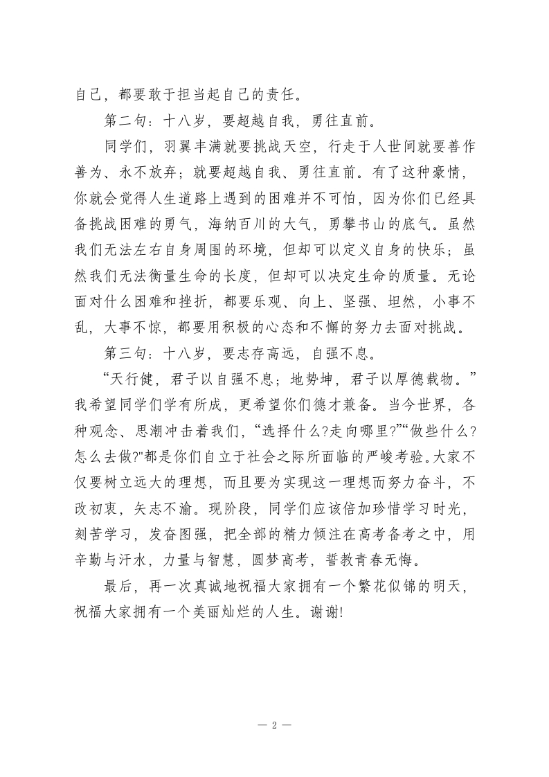成人礼校长致辞愿你有一个灿烂的明天尊敬的各位家长、各位老师,亲爱的同学们:大家上午好!首先,向奋发有为长大成人的高三全体同学表示热烈的祝贺!向呵护、关爱儿女成长的家长表示衷心的感谢!向陪伴教育学子成才的全体老师致以崇高的敬意!同学们,当你们举起右手庄严宣誓的时刻,就标志着你们成为了成年人。就意味着你们将告别幼稚、走向成熟,告别任性、走向理性,告别他律、走向自律。就象征着你们走到了人生一个关键的转折点,站到了人生一个崭新的新起点。此时此刻,我作为校长和老师,诚心地告诉你们:天戴其苍,地履其黄。纵有千古,横有八荒。前途似海,来日方长!成人的真正涵义是奋斗,是奉献,是责任,是超越!在这个特殊的日子,我想跟同学们说三句话。第一句:十八岁,要心怀感恩,担当责任。我们要对父母、老师、朋友和亲人感恩,去关爱、去奉献,感激他们给生命以温度;我们要对缤纷的世界和多彩的社会感恩,去观察、去体悟,感激他们给生命以广度;我们要对人类博大的文化和深邃的科学感恩,去学习、去探索,感激他们给生命以深度。只有心怀感恩才会有强烈的责任意识。当你享受生活的同时,要想到你身处的社会中还有那些看得见和看不见的苦难。同学们要记住:无论是对国家,对社会,还是对家人,对-1