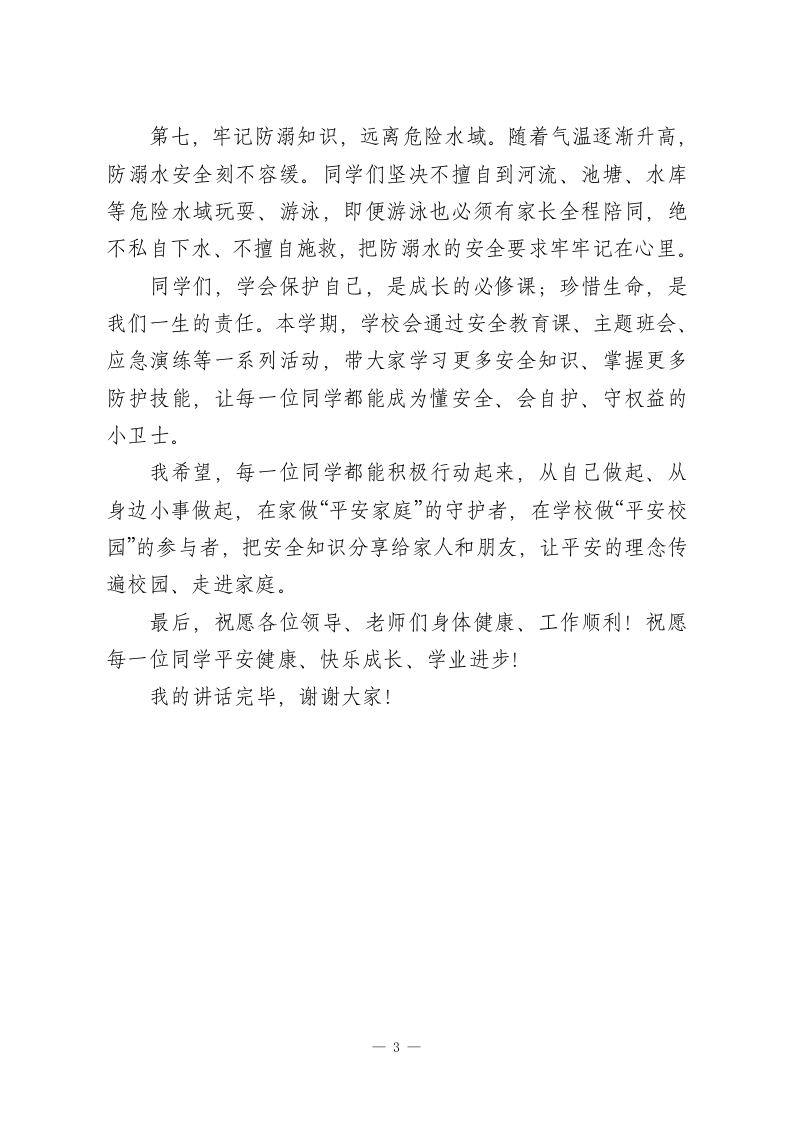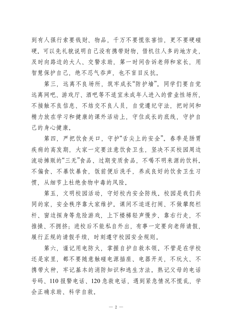 春季学期安全教育启动仪式校长讲话:懂安全、会自护、守权益尊敬的各位领导、老师们,亲爱的同学们:大家早上好!春风和煦,草木萌新,2026年的春天如约而至,我们的校园也满是蓬勃生机。今天,我们全体师生齐聚操场,隆重举行2026年春季学期安全教育启动仪式,核心目的就是教会大家珍惜生命、学会自护、守护权益,把安全意识刻进心里,把防护技能练在手上,让平安伴随我们每一天的校园生活。生命是人世间最宝贵的财富,它只有一次,不可重来。对于我们每一位同学来说,健康成长、平安生活,是学习进步的基础,是家庭幸福的根基,也是学校最牵挂的事。开展安全教育,不是简单的提醒,而是教会大家保护自己的本领,守护自身的合法权益,远离一切危险与伤害。在这个充满希望的春季学期,我想和同学们认真聊聊,如何真正做到安全相伴、自我守护:第一,严守交通规则,守好上下学“平安路”。放学后要按时回家,不随意逗留、不在外留宿,这是最基本的安全准则。走在路上要自觉靠右行,不三五成群并排占道,不在马路边追逐嬉戏、玩手机,主动避让车辆;过马路走斑马线,牢记“红灯停、绿灯行”,坚决不横穿马路、不翻越护栏。平平安安出门,安安全全回家,是对自己负责,也是对家人负责。第二,学会沉着应对,守护自身人身权益。如果在路上遇1
