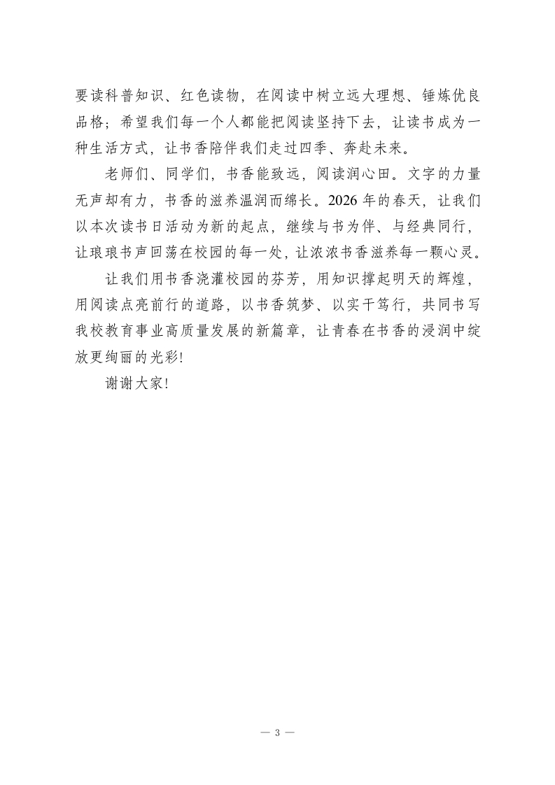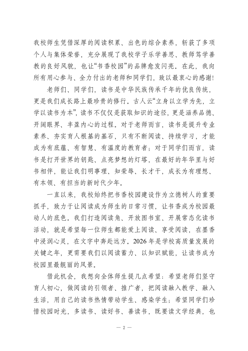 春季学期第X届世界读书日活动总结表彰会校长讲话:让我们用书香浇灌校园的芬芳,用知识撑起明天的辉煌亲爱的老师们、同学们:大家好!春风送暖,书香满园,在这草木葱茏、生机盎然的春季,我们迎来了第27个世界读书日,也圆满完成了我校第X届世界读书日系列主题活动。今天,我们齐聚一堂,召开总结表彰大会,首先,我代表学校,向在本次读书活动中斩获荣誉的书香班级、书香少年、优秀阅读指导教师,以及所有积极投身阅读、收获成长的师生们,致以最热烈的祝贺!回望本届读书日系列活动,从春日启幕到圆满收官,全校师生以书为友、以读相伴,让浓郁的书香充盈了校园的每一个角落。我们开展了“全校共读一本好书”“经典诵读大赛”“班级读书分享会”“图书漂流”“读书手抄报创作”“书香家庭评选”等一系列丰富多彩的活动,老师们精心指导、用心引领,同学们踊跃参与、沉浸阅读,在文字里感悟美好、在书香中汲取力量。在本次活动中,各年级、各班级亮点纷呈:低年级的同学们用稚嫩的声音诵读经典童谣,在绘本故事里认识世界;中高年级的同学们深耕名著、畅谈感悟,用征文、演讲诉说阅读的收获;老师们带头读书、分享心得,以自身的阅读习惯为同学们树立了最好的榜样。在各级各类阅读竞赛、征文展示活动中,