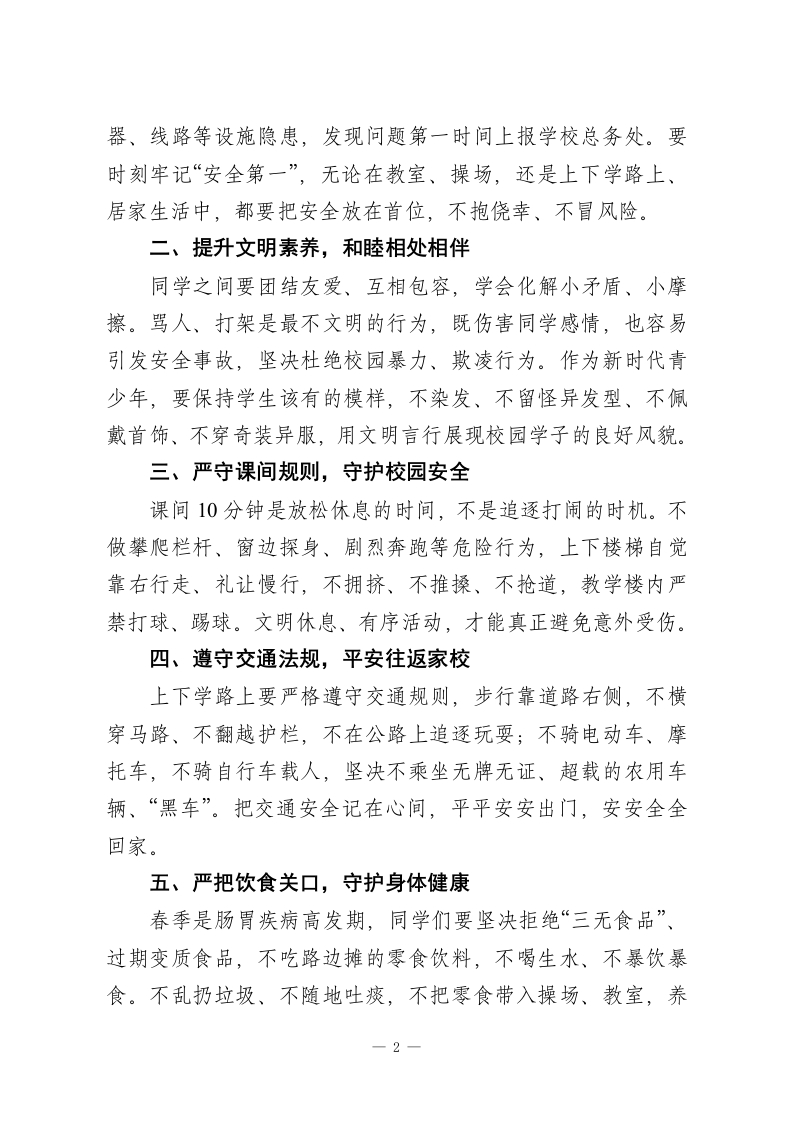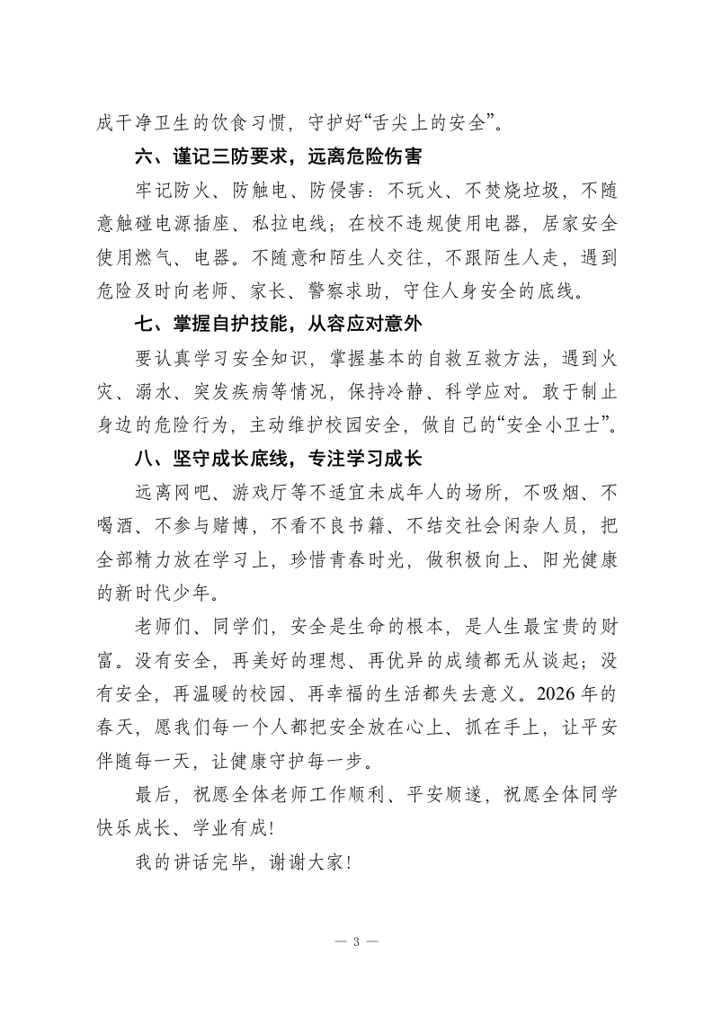 春季学期全国中小学生安全教育日校长讲话:以安全为基,护成长远航老师们、同学们:大家下午好!春天承载着希望,生活蕴藏着美好,而生命,是这一切美好的根基。今天,我们迎来了第31个全国中小学生安全教育日,对于学校而言,安全是一切工作的底线,是师生安心工作、快乐学习的根本保障,更是我们必须牢牢抓在手上、记在心里的头等大事。生命对每个人来说都只有一次,它珍贵且脆弱,容不得半点侥幸和疏忽。相关数据显示,我国每年仍有近万名中小学生因各类安全意外失去生命,校园里的食品安全、运动损伤、交通隐患、溺水风险、火灾触电、矛盾冲突等问题,时刻威胁着同学们的健康成长。这些冰冷的数字背后,是一个个破碎的家庭,是一段段无法重来的青春。但教育专家反复强调,只要我们筑牢安全意识、掌握防护技能,80%以上的校园意外伤害都是可以避免的。在本学期,借着全国中小学生安全教育日的契机,我想结合校园生活实际,给全体同学提出更具体、更实用的安全要求,希望大家把安全刻进骨子里,把防护落在行动上:一、树牢安全意识,排查身边隐患安全不是一句口号,而是融入日常的习惯。每位同学都要做校园安全的“有心人”,主动配合班主任排查教室的桌椅、电1