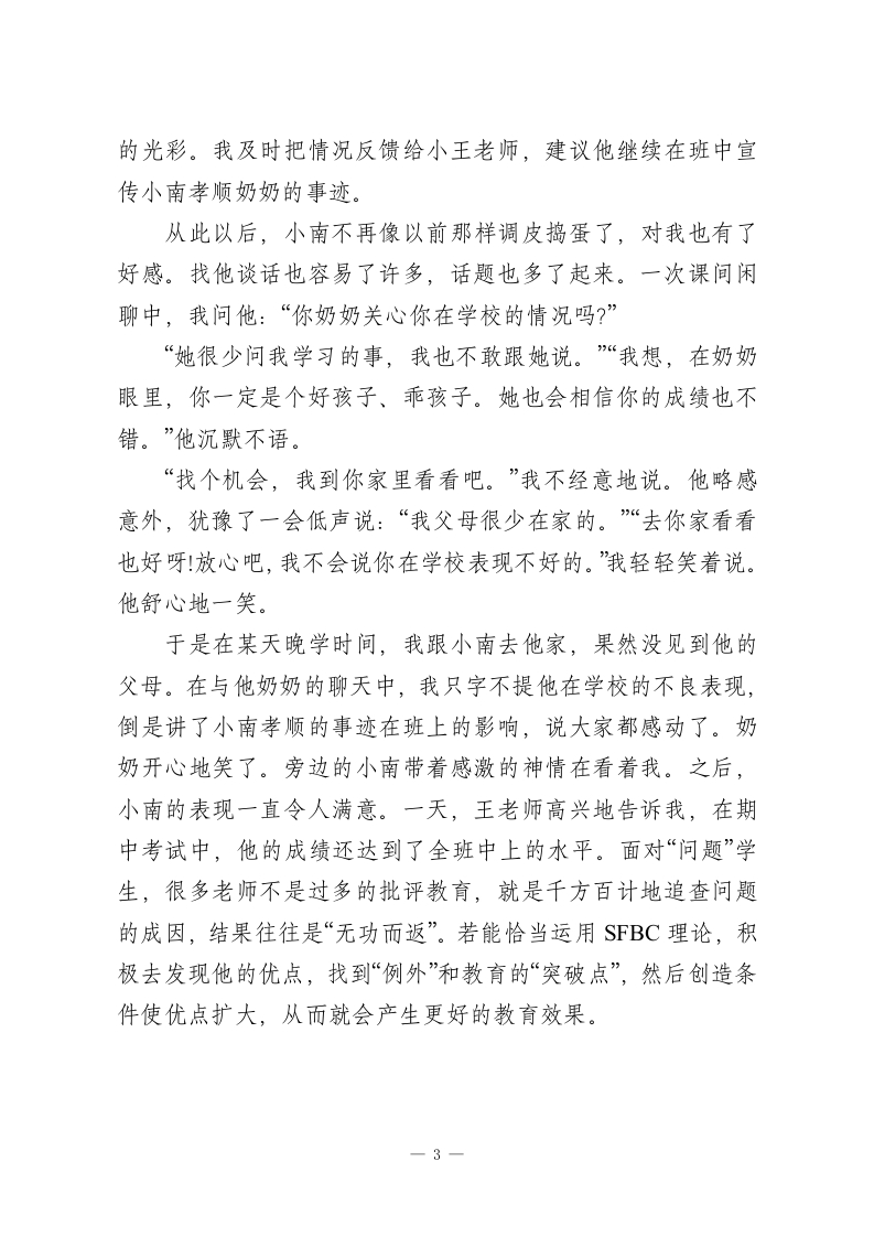 从寻找“例外”开始一一运用SFBC理论转化“问题”学生在一次班主任工作交流会上,同事小王谈起班上一个叫小南的学生时说,这小子真让人头痛,上课讲闲话、做小动作,惹事生非,不完成作业,成绩一塌糊涂,还经常在校园游荡。有时还会做出十分出格的事来。记得有一次,他把一只蜥蜴放到讲台上的粉笔盒里,把刚上课的女教师吓得大惊失色并哭了起来,致使她很长一段时间都不愿到班级来上课。老师训斥他,他还理直气壮地说,我是想带回家给我弟弟玩的,是别人放到讲台上去的,跟我无关!与他沟通?无论你怎么说,他就是一声不吭。其他的科任教师经常来告状,提起他都是直摇头一一这样的孩子啊,你还指望他能进步!小南的父母我有些认识,是做服装小生意的。我知道他们平时都是早出晚归,很少关心孩子的学业。听小王老师这样说,作为德育主任的我也特别关注起这个学生的情况来。一个偶然的机会,在与他母亲的交淡中,知道小南对奶奶特别的孝顺:奶奶双目失明,行动不方便,经常躺在床上,他每天早上都会到奶奶的房里去看看。放学回来的第一件事,也是先问候奶奶,没什么事就是打个招呼也好。还经常与奶奶聊天,拉着奶奶出来散步。在我苦苦思索帮扶小南的思路时,我想起了蒋玉燕老师在一篇文章中提到的SFBC(焦点解决短期心理咨询)理论。SFBC有两个重要的理念,一是不找问题原因,只关注问题是如何解1
