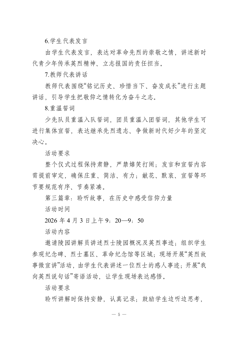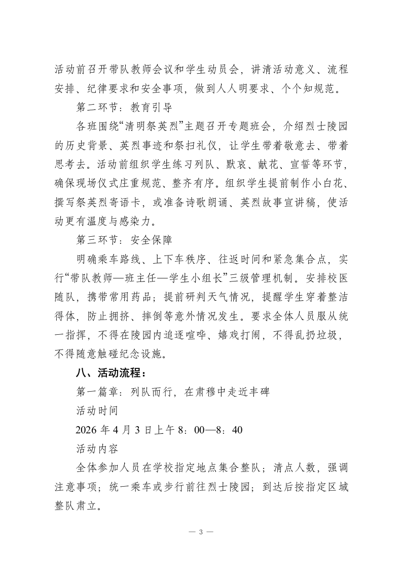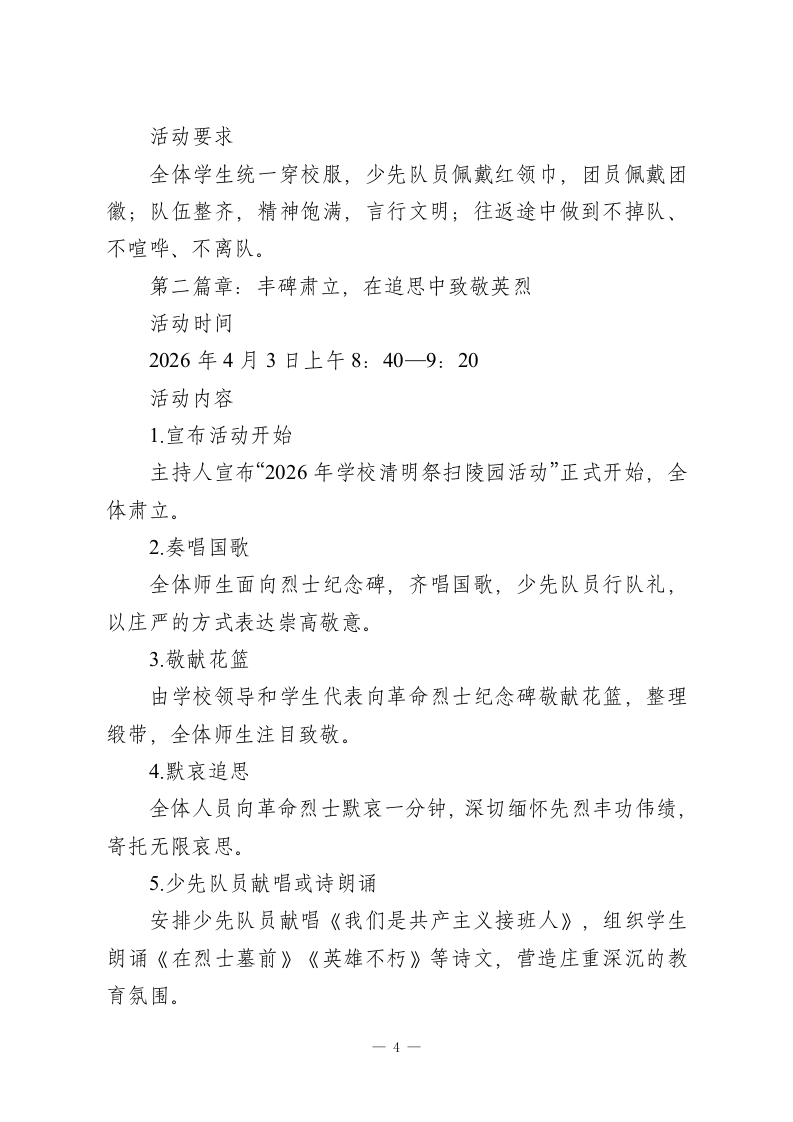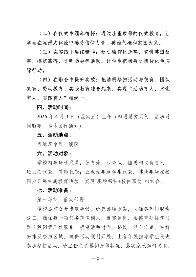 丰碑前的思政课,春风里的少年志2026年学校清明祭扫陵园活动方案在春风中追思,于肃穆中铸魂。为深入贯彻落实立德树人根本任务,充分发挥清明节传统节日育人功能,引导广大青少年缅怀革命先烈、赓续红色血脉、厚植家国情怀,经学校研究,决定组织开展2026年清明祭扫陵园主题教育活动。为确保活动庄重有序、安全顺利、富有实效,特制定本实施方案。一、活动背景:清明节既是中华民族慎终追远、缅怀先人的传统节日,也是学校开展革命传统教育、爱国主义教育和感恩教育的重要契机。革命烈士陵园承载着厚重的历史记忆和鲜明的精神价值,是一堂直抵心灵的“大思政课”。学校开展清明祭扫陵园活动,不仅要让学生“走进陵园”,更要引导学生“走近历史、走进精神、走向成长”,在瞻仰、倾听、缅怀、宣誓、实践中,深刻感悟今天幸福生活的来之不易,坚定“请党放心、强国有我”的理想信念。二、活动主题:丰碑前的思政课,春风里的少年志三、活动目标:(一)在追思中铭记历史:通过祭扫陵园、敬献花篮、默哀致敬、聆听讲解等活动,引导学生了解革命历史,认识英烈事迹,增强历史责任感。一1