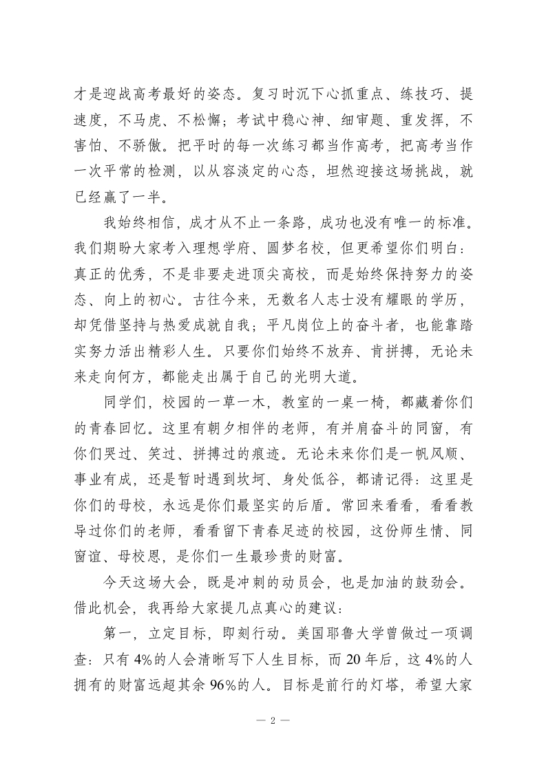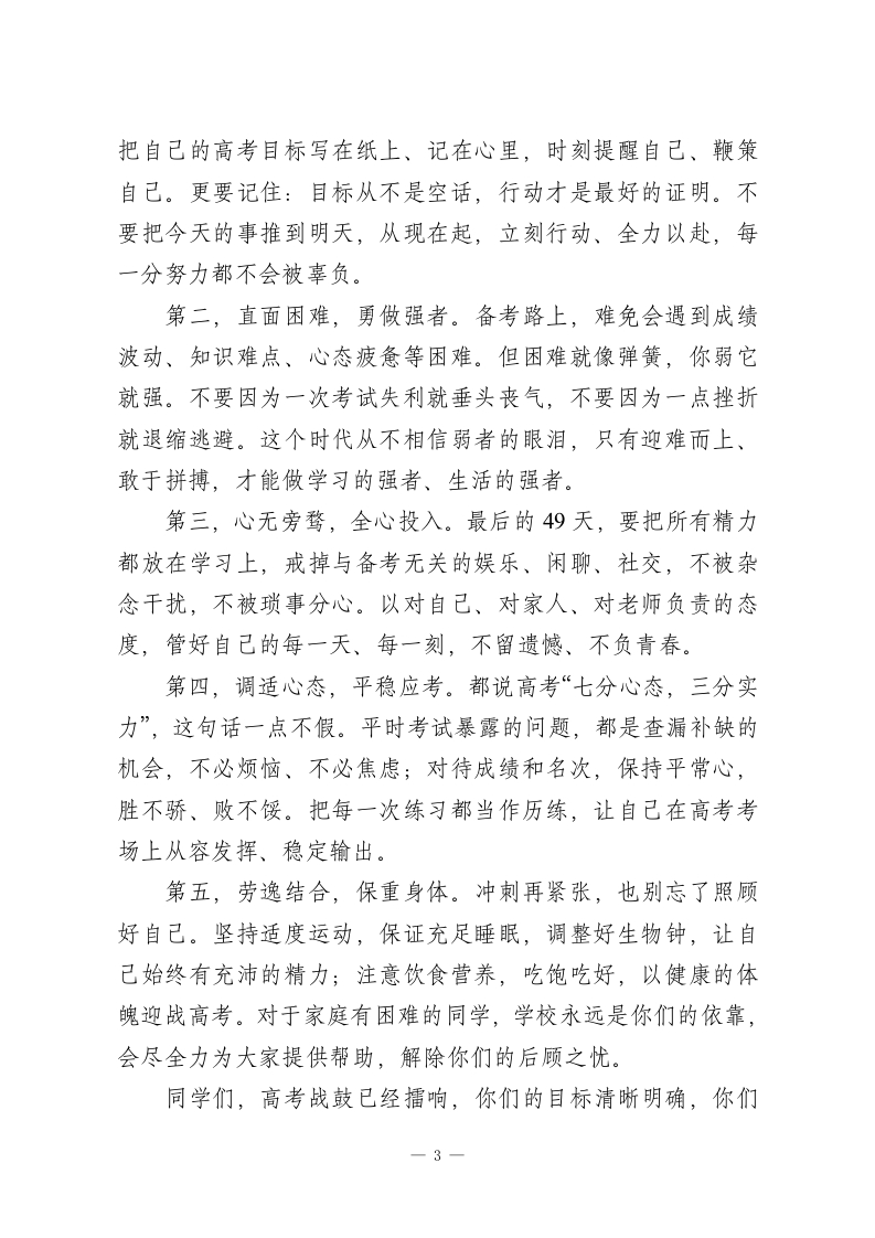 高考冲刺动员大会校长讲话:以奋斗姿赢未来,就一定能书写属于自己的人生新篇章各位老师、亲爱的高三同学们:大家好!春风送暖,万物竞发,我们正站在高考冲刺的关键节点。掐指算来,距离这场人生大考还有整整49天,再过七周,在座的每一位高三学子,都将带着三年的积淀,奔赴考场、迈向人生新征程。在此,我代表学校,向一路拼搏、从未放弃的全体高三同学,致以最诚挚的祝贺!向日夜陪伴、悉心执教的高三老师们,道一声辛苦了!回望这三年,从踏入校园的懵懂少年,到如今沉稳笃定的备考学子,你们走过了一千多个日夜的书山学海,熬过了无数个挑灯夜读的清晨与黄昏。无论是应届同学三年的坚守,还是复读学子一年的再战,大家都怀揣梦想、踏实奋进,让整个高三年级始终有着浓厚的学习氛围、井然的教学秩序、向上的精神面貌。你们懂得珍惜时间、主动钻研,用自觉与勤奋撑起了自己的求学路,也为学校增添了最亮眼的青春底色。这份坚持与付出,值得所有人为你们点赞!同学们,高考的脚步越来越近,最后的冲刺阶段,拼的不只是知识储备,更是心态、毅力与状态。我想和大家说一句掏心窝子的话:不必焦虑慌张,不必浮躁逞强,保持一颗平常心,
