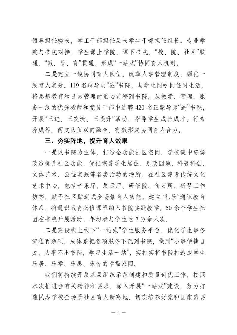 高质量建设民办学校全场景社区育人新高地XX学校在“一站式”学生社区综合管理模式建设中,以习近平总书记系列讲话为指引,以学生为中心,充分发挥民办高校体制机制优势,强化党建引领,创新治理体系,建立协同机制,建设全场景社区育人阵地。一、党建引领,创新内部治理体系一是创新治理体系,坚持党建引领。在“一站式”建设中聚焦党组织作用发挥,从创新体制入手,建立治校方略、组织执行和主体运行“双向三层位”党政交叉任职。党委书记按照法定程序进入董事会担任董事,党委委员进入校务会,院系党组织书记兼任副院长,做到党组织从决策、执行到落实上下贯通、高度协同,引领促进“一站式”实践探索。二是党组织全覆盖,党建工作全融入。将党的组织延伸到学生社区,形成网格化管理和党员网格化帮扶的党建工作机制。建设党建工作坊、文化站、服务站、党史宣传长廊、红色文化现场教学场所等,常态化开展主题党日活动和学习教育活动,把党史教育和学生思想政治教育深度融合,形成纵到底、横到边、全覆盖的基层党组织工作格局。二、创新模式,形成协同育人机制一是实施“学院+书院”育人模式。学校设立正蒙书院,党委书记和校长担任院长,依托二级学院建立实体分院,实体分院作为社区的主要单元,下设“楼”、“楼”分“层”,“层”设“组”,院1