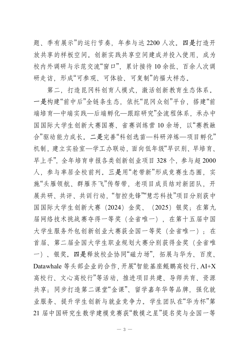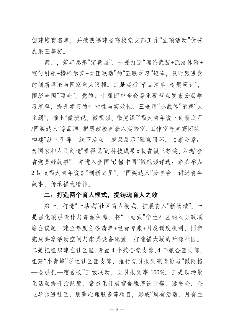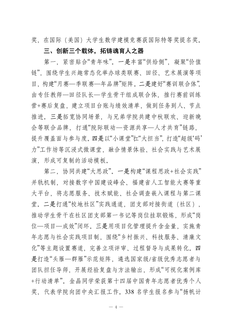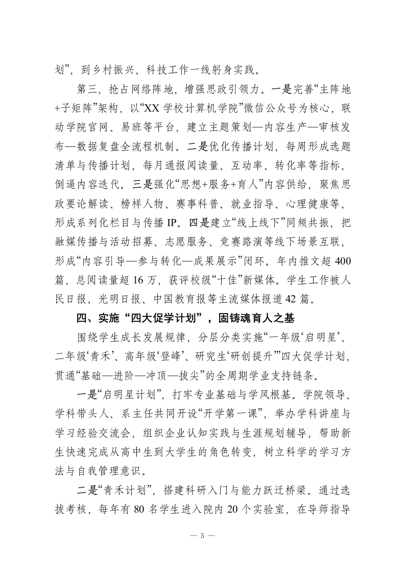 构建“1234”思政工作机制,有效提升思政引领力XX学校坚持以习近平新时代中国特色社会主义思想为指导,认真领会全国教育大会精神,以教育家精神为指引,牢记“为党育人、为国育才”,构建党建引领、两个育人模式、三个载体、四大促学计划的“1234”思政工作机制,大写“思政引领力”,举旗定向、凝心聚气、严管厚爱、强基提质、以文化人、创新发展,学院学生思政工作实现结构性重塑与效能型提升,呈现新面貌、新作为和新突破。一、坚持以高质量党建引领为主线,强铸魂育人之核第一,党建引领“主心骨”。一是构建“党委立标杆-支部树样板-党员当先锋”三维一体全链条学习教育体系,开展党纪学习、爱党爱国爱校等主题教育。二是支部建在平台、团队和项目上,实行“项目+清单+赛程”协同台账,任务到支部、责任到人,推进“以赛促学、以赛促建、以赛促训”。三是实施党员发展全周期培育,培训班分层分岗全覆盖,发展质量与结构同步优化。四是推行“领导班子+微党课+研讨”机制与“清单管理、双评双述”制度,常态化开展理论学习和组织生活,强化学做转化。超级计算团队在党支部引领下连续六次在ASC世界大学生超级计算机竞赛总决赛中斩获一等奖;ACM协同创新团队党支部入选第三批“全国党建工作样板党支部”培育创建单位名单,并在第49届国际大学生程序设计竞赛亚洲区域赛取得1金5银6铜;昆冈众创学生党支部入选第二批全国高校“百个研究生样板党支部”1