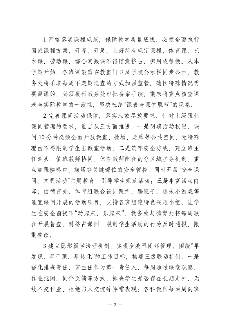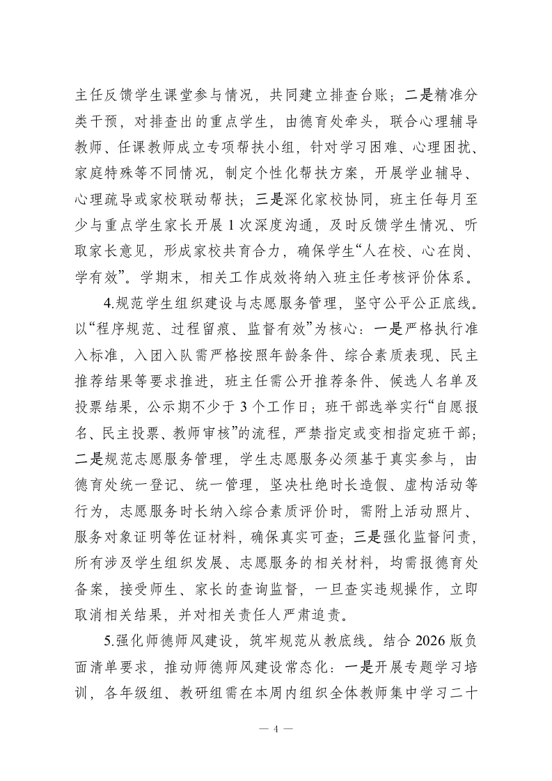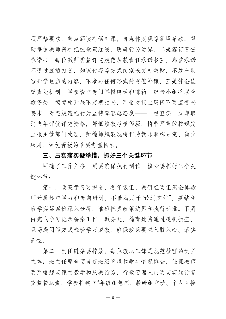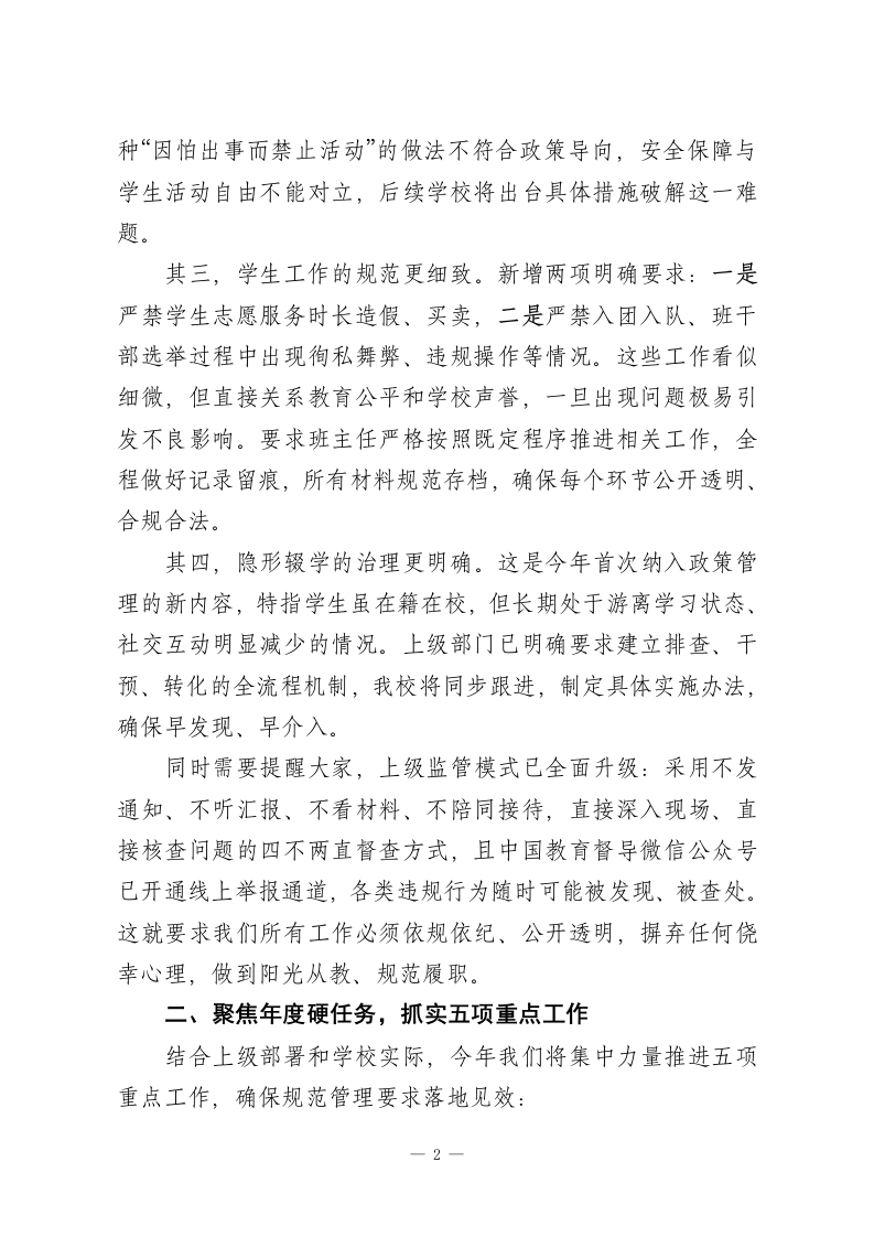 规范管理巩固年工作动员会,校长讲话:凝心聚力抓规范,固本提质促发展各位老师,同志们:今天召开规范管理巩固年工作动员会,核心目的就是把今年的工作要求讲清楚、责任压到位一一不空谈意义、不回避重点,直接聚焦“政策新导向、学校硬任务、落实硬举措”三个核心,让大家明确方向、找准抓手、扎实推进。一、吃透政策新导向,明晰工作新要求今年规范管理的核心依据,是教育部2026版教育行业负面清单,在原有基础上扩充形成二十项严禁要求,后续将全文印发至各年级组、教研组,请每位教师认真研学、准确把握。这里重点梳理与日常工作紧密相关的四项关键调整:其一,有偿补课的界定更全面。以往大家对有偿补课的认知多局限于线下开班收费,新版清单明确将通过直播打赏、知识付费等形式向本校学生家长变相敛财,以及发布升学焦虑类内容带货售课等行为,统一纳入有偿补课治理范畴,查处标准与传统有偿补课一致。这就要求全体教师严守职业底线,不得利用教师身份在各类网络平台开展面向本校家长的变现活动,更不能通过制造焦虑谋取私利,这是今年必须坚守的纪律红线。其二,课间活动的管理更严格。虽然“不挤占课间休息、不限制学生出教室”是往年已有规定,但今年巩固年专项行动将其列为重点督办任务,充分体现上级对学生课间活动权利的重视。我校部分班级存在“担心安全风险就限制学生活动”的倾向,这1