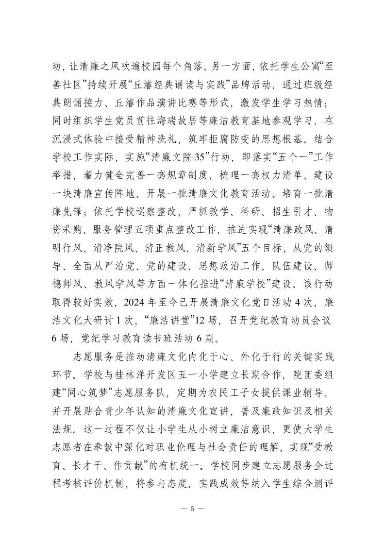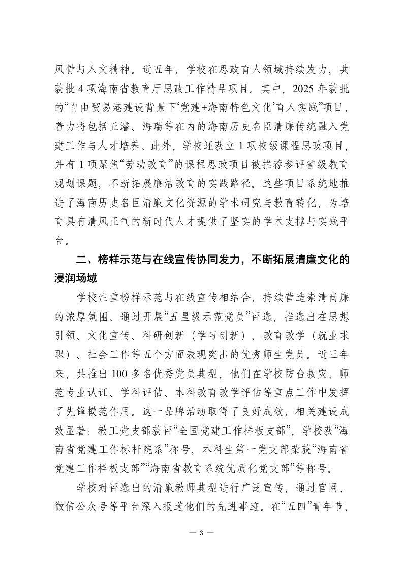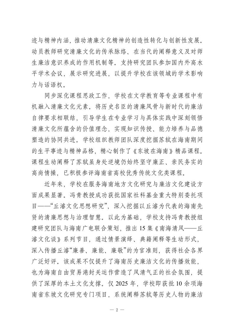 弘扬清廉文化培育时代新人在海南自由贸易港建设的关键时期,XX学校主动作为,紧紧围绕高校清廉文化建设目标,系统构建“学科育人、活动浸润、协同共建”三位一体的清廉文化培育体系,致力于建设“清廉”文院。学校通过深入挖掘海瑞等海南历史名臣的清廉故事,宣传弘扬传统清廉文化精髓,培育清正有为的时代新人,并以多维路径融合与创新实践为抓手,有效实现了清廉文化传播质量与效能的双重提升。一、发挥学科优势,凝练清廉文化时代价值学校将理论学习作为涵养清廉文化的首要环节,建立健全“第一议题”制度,在党委会、党政联席会、党支部“三会一课”中,始终坚持把学习贯彻习近平新时代中国特色社会主义思想和习近平总书记关于全面从严治党、廉洁文化建设的重要论述作为首要内容与核心议题。近年来,聚焦学习贯彻习近平新时代中国特色社会主义思想主题教育、党的历次全会精神、习近平文化思想、中央八项规定精神、《习近平谈治国理政》等重点内容,系统开展专题学习研讨、读书班、专家辅导报告、干部领学等多种形式的学习活动。近两年累计开展各类学习108场次,覆盖师生2700余人次,持续强化党员干部和师生的纪律意识、规矩意识与廉洁自觉,为清廉文化建设奠定了坚实的思想理论基础。以项目申报为契机,鼓励教师围绕清廉文化开展系统深入的学术研究,深入挖掘海南历史名臣海瑞、邢宥等人的清廉事1
