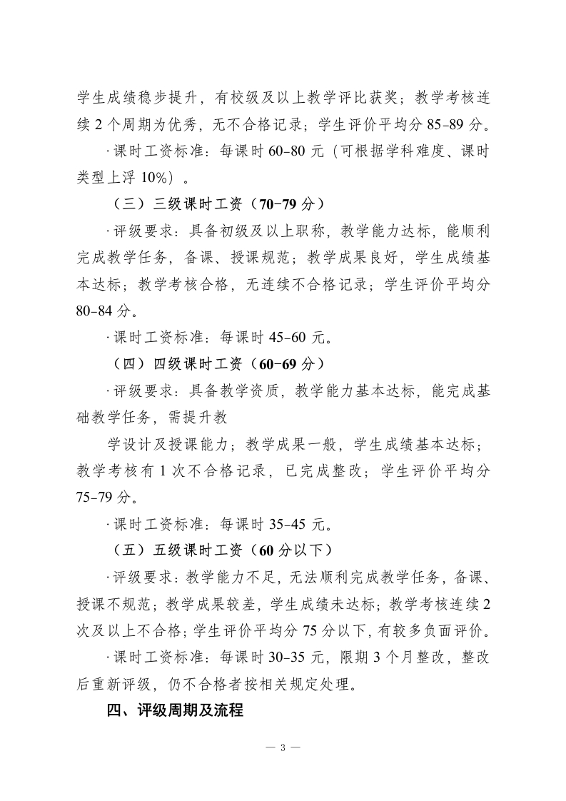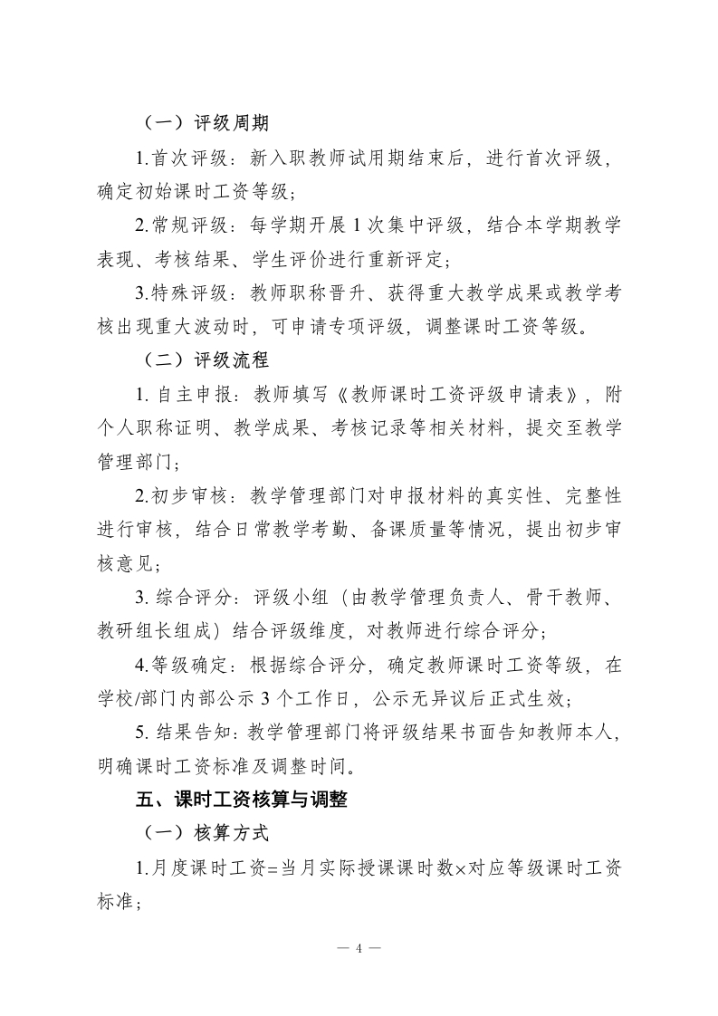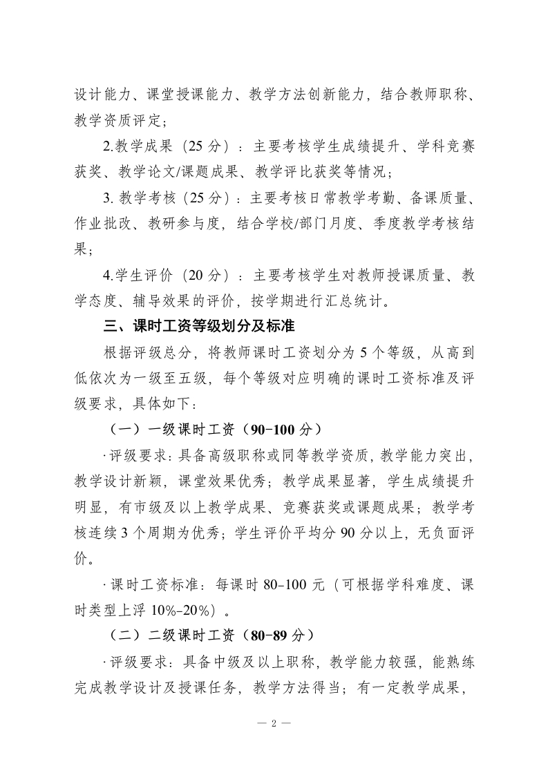 教师课时工资评级方案为规范教师课时工资管理,建立科学、公平、合理的课时工资评级机制,充分调动教师教学积极性,提升教学质量,结合教学工作实际(兼顾教学能力、教学成果、课时量等核心要素),明确教师课时工资评级标准、核算方式及调整规则,制定本方案。本方案适用于全体在岗授课教师,涵盖各学科、各年级教师,不含行政岗、后勤岗及临时代课教师(临时代课教师课时工资另行规定)。一、评级核心原则1.能力匹配原则:课时工资等级与教师教学能力、专业素养、职称等级直接挂钩,体现教师教学价值;2.绩优酬优原则:结合教学成果、学生评价、教学考核结果,优秀教师可获得更高评级及课时工资:3.公平公正原则:评级标准统一、流程公开,以实际教学表现为核心依据,杜绝徇私舞弊;4.动态调整原则:课时工资等级可根据教师教学能力提升、教学成果变化、职称晋升适时调整,保持机制活力;5.兼顾差异原则:结合学科难度、年级特点、课时类型(理论课、实践课、辅导课),合理设定评级权重及薪资标准。二、课时工资评级维度及权重教师课时工资评级以四大维度为核心,总分为100分,各维度权重结合教学工作重点设定,具体如下:1.教学能力(30分):主要考核教师专业知识储备、教学-1-