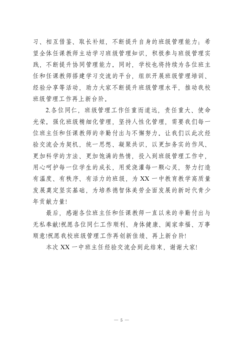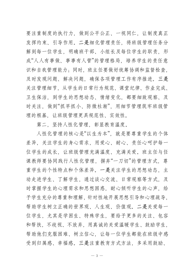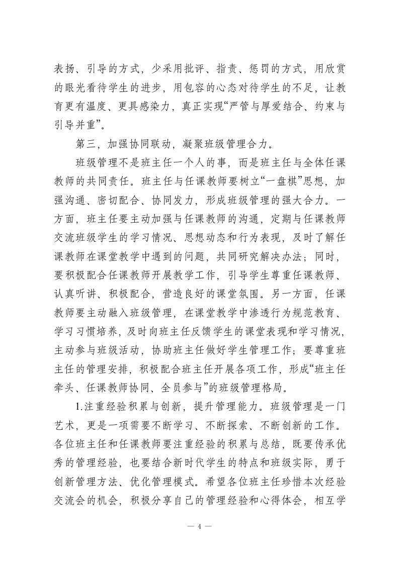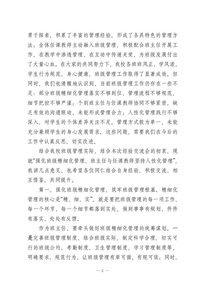 强化班级精细化管理班主任与任课教师坚持人性化管理一一XX一中班主任经验交流会各位领导、各位班主任、全体任课教师同仁:大家好!班级是学校教育教学工作的基本单元,是培育学生成长成才的重要阵地,而班级管理则是连接学校、教师、学生与家庭的桥梁纽带。今天,我们齐聚一堂,召开XX一中班主任经验交流会,核心目的就是搭建交流平台、分享管理经验、凝聚管理共识,聚焦“强化班级精细化管理、坚持人性化管理”这一核心,推动班主任与任课教师协同发力,不断提升班级管理水平,营造和谐有序、温暖包容的班级氛围,助力每一位学生全面发展、健康成长。班主任是班级管理的核心力量,任课教师是班级管理的重要参与者、推动者。班级管理的成效,不仅取决于班主任的精心谋划与辛勤付出,更离不开全体任课教师的协同配合与共同发力。精细化管理是提升班级管理效能的关键,人性化管理是凝聚班级合力、呵护学生成长的核心,二者相辅相成、有机统一,唯有将精细化管理落到实处,将人性化管理融入日常,才能构建起有温度、有秩序、有活力的班级,才能真正实现“以管促教、以育促成长”的育人目标。长期以来,我校全体班主任扎根班级管理一线,潜心钻研、