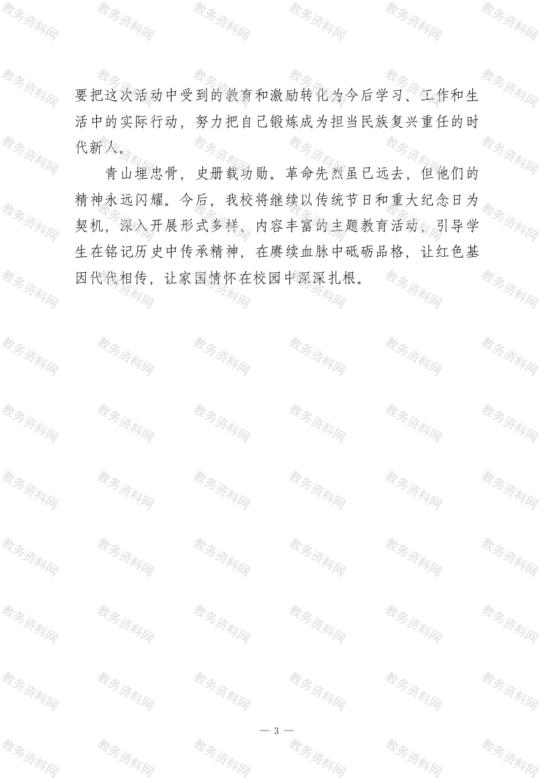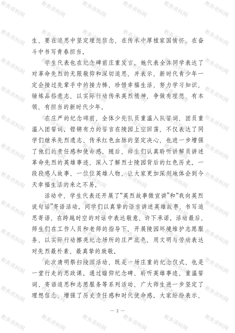 青松寄哀思丰碑砺少年一—我校开展2026年清明祭扫陵园主题教育活动春风轻拂寄哀思,丰碑巍然铸忠魂。为深入落实立德树人根本任务,弘扬中华优秀传统文化,传承红色基因,厚植家国情怀,在2026年清明节来临之际,我校组织师生代表走进烈士陵园,开展“清明祭英烈”主题教育活动。师生们在庄严肃穆的氛围中缅怀革命先烈,追思英雄伟绩,接受了一次深刻的爱国主义教育和精神洗礼。活动当天,全体师生代表怀着崇敬的心情整齐列队,肃立于革命烈士纪念碑前。苍松翠柏掩映下,纪念碑庄严矗立,现场气氛凝重而肃穆。祭扫活动在庄严的国歌声中正式开始。伴随着激昂的旋律,全体师生面向纪念碑肃立致敬,少先队员行队礼,表达对革命先烈的深切缅怀和崇高敬意。随后,学校领导和学生代表缓步上前,向革命烈士纪念碑敬献花篮。鲜花寄托哀思,缎带表达敬仰。全体人员低头默哀,在无声中追忆先烈丰功伟绩,在静默中感受信仰的力量。那一刻,历史仿佛穿越时空,与在场的每一位师生深情相遇。祭扫仪式上,校长发表了讲话。讲话深情回顾了革命先烈为民族独立、人民解放和国家富强作出的巨大牺牲与卓越贡献,勉励同学们铭记历史、珍惜当下,把对先烈的崇敬之情转化为勤奋学习、修身立德、报效祖国的实际行动。校长寄语全体学