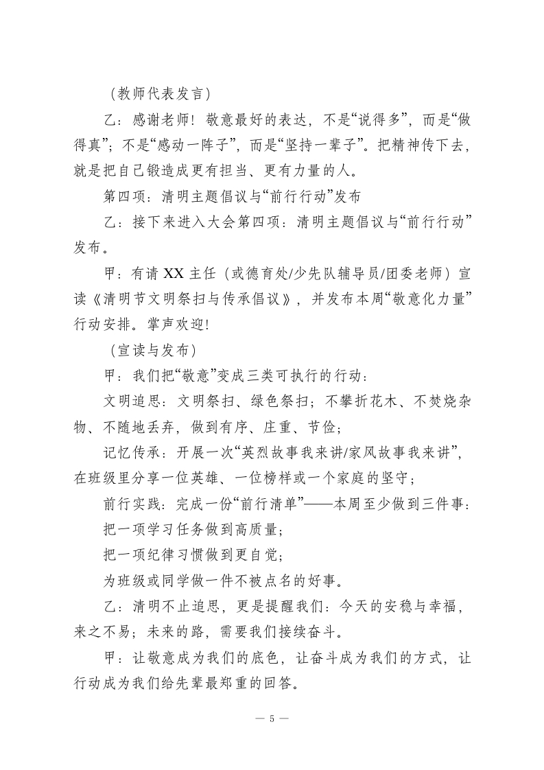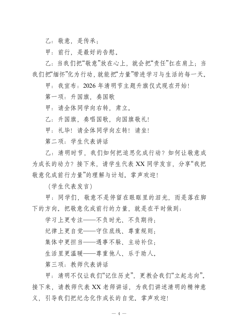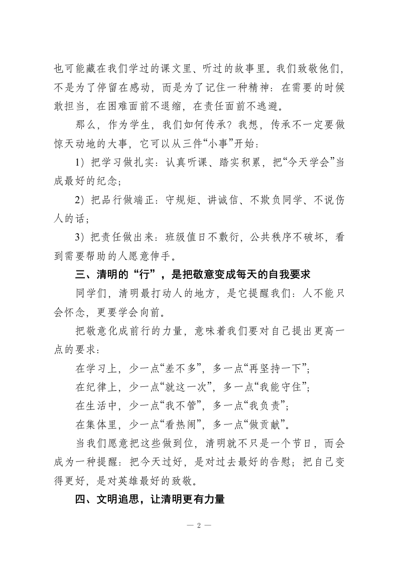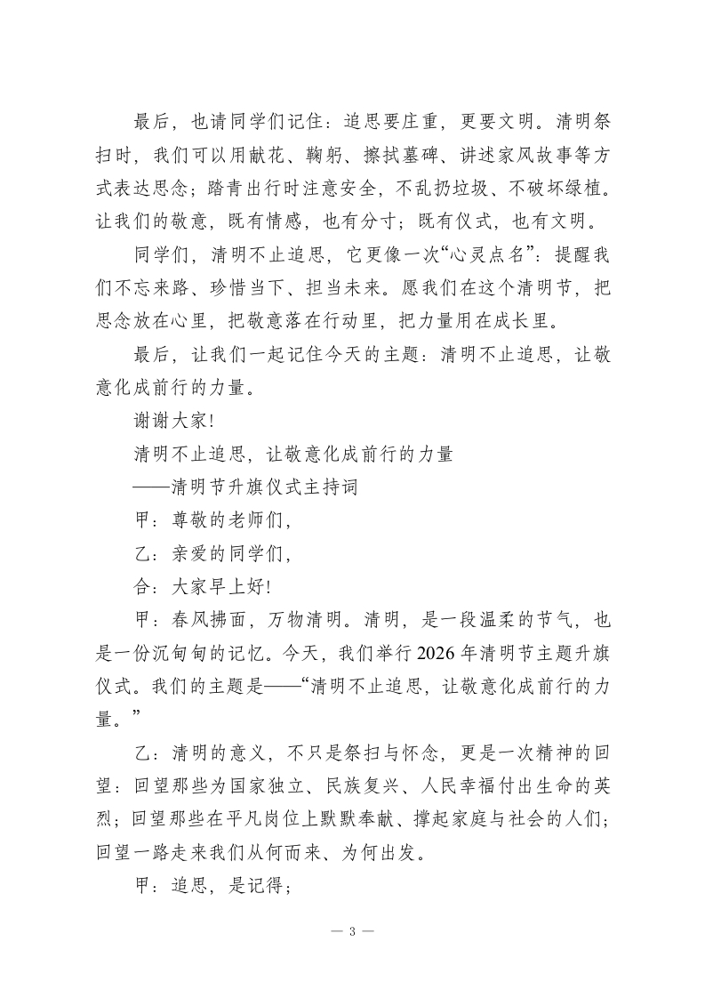 清明不止追思,让敬意化成前行的力量清明节学生国旗下演讲稿敬爱的老师、同学们:清明不止追思,让敬意化成前行的力量。一提到清明,我们会想到细雨、青团、踏青,也会想到祭扫、纪念、思念。清明是中国人最“安静”的节日之一,它不热闹,却很深情:不张扬,却很庄重。可清明的意义,真的只是“想起过去”吗?我想说:清明不止追思,更是一次提醒一把敬意化成前行的力量,把记忆变成成长的方向。一、清明的“思”,是对生命的回望与珍惜清明让我们停下脚步,想一想:我们从哪里来?是谁在默默守护我们长大?也许是亲人的陪伴与付出,是长辈的教诲与期望;也许是无数普通人的劳动,让城市运转、让生活安稳。清明让我们明白:生命不是理所当然,幸福也不是凭空而来。当我们在追思中学会珍惜,就会更懂得:每一次按时到校、每一次认真作业、每一次遵守规则,都是对自已生命负责;每一次尊重他人、礼貌相待、彼此扶持,都是对他人生命的善意。二、清明的“敬”,是对英雄的致敬与传承清明也是致敬英雄的日子。我们今天能安心在校园里读书,是因为有人曾经在更艰难的岁月里选择挺身而出:为了国家的独立、为了人民的安宁,他们把热血和青春留在了历史里。同学们,英雄并不遥远,他们的名字可能刻在纪念碑上,1