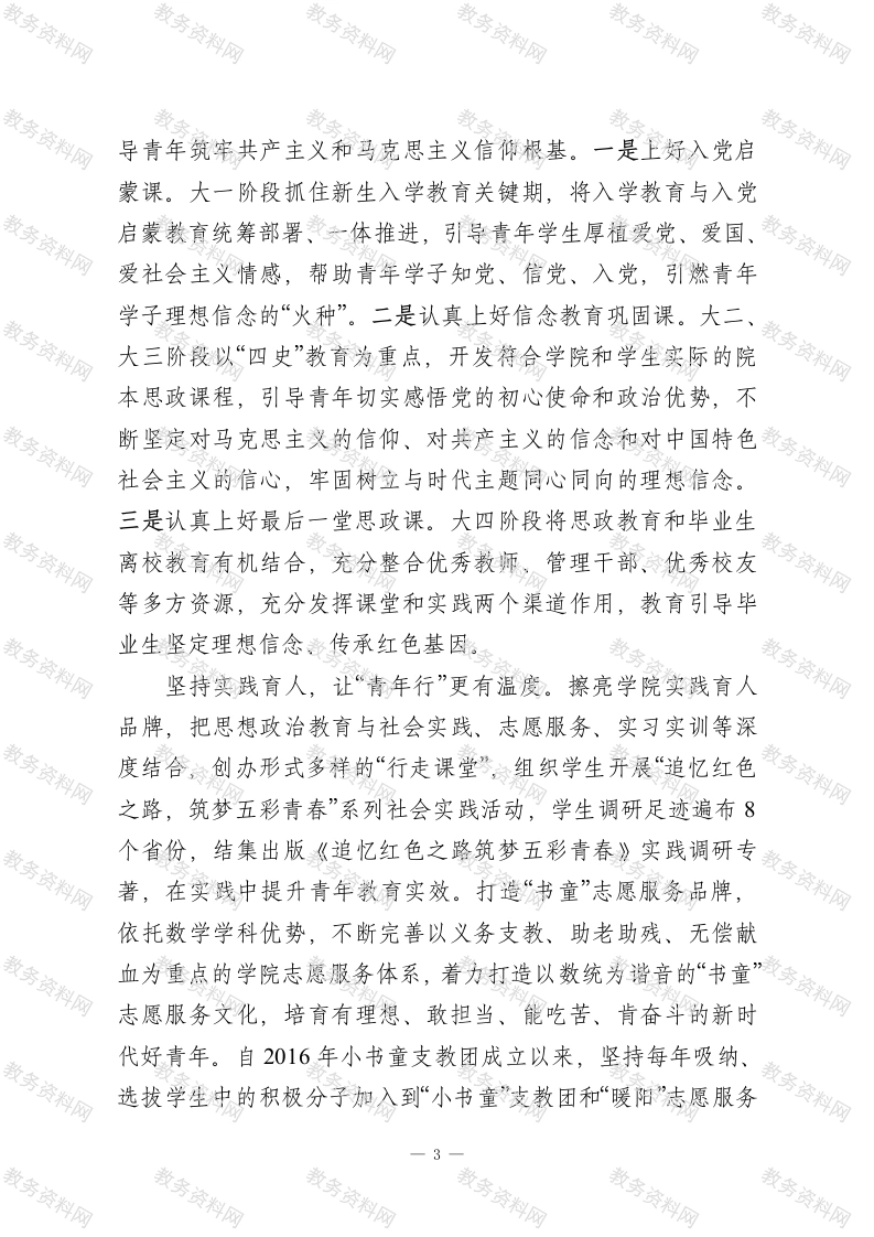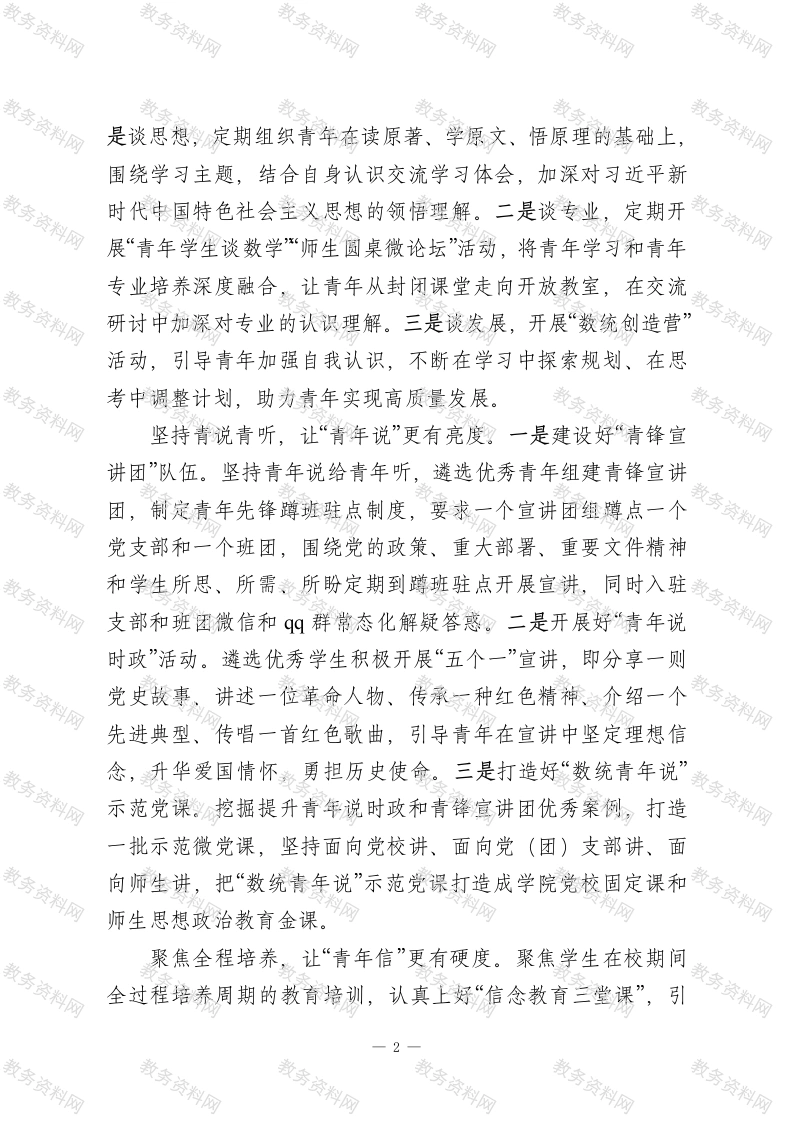 实施“五青”铸魂行动培育时代新人XX学校党委坚持以习近平新时代中国特色社会主义思想为指导,紧紧围绕立德树人根本任务,牢牢抓住青年这个关键群体,以“时代新人铸魂工程”为牵引,结合学院实际,探索实施以“青年学、青年思、青年说、青年信、青年行”为主要内容的“五青”铸魂行动,引导广大青年坚定不移听党话、跟党走,努力成长为堪当民族复兴大任的时代新人。突出政治引领,让“青年学”更有力度。学院坚持常态化、长效化推进理论学习,严格落实“思想引领,学习在先”机制,明确每周三下午理论学习日制度,让政治理论学习成为师生的自觉约束。深入推进“干部领学、典型送学、支部联学、实践导学、专题研学”制度,通过定期邀请先进典型、专家学者、优秀校友、学校老教授红旗说唱团、学校职能部门领导等与青年师生面对面交流,鼓励党(团)支部之间开展联学联促活动,要求党支部围绕每月学习主题进行专题研学等多种形式,让理论学习更有实效性。持续探索精准化、科学化的党员学习教育模式,引导学生支部结合数学学科特点和支部实际,申报党员学习教育特色活动,创建活动开展以来培育了党员教育红模型、SECI模型学习法、1+2朋辈导航等具有鲜明学科特色、受到学生广泛欢迎的党支部学习品牌,让理论学习更富感染力。丰富内容设计,让“青年思”更有深度。搭建“青年沙龙”平台,组织青年学生围绕思想、专业、发展等开展开放式、讨论式、互动式思考交流活动,让青年在思维碰撞中获得思想启迪。一1