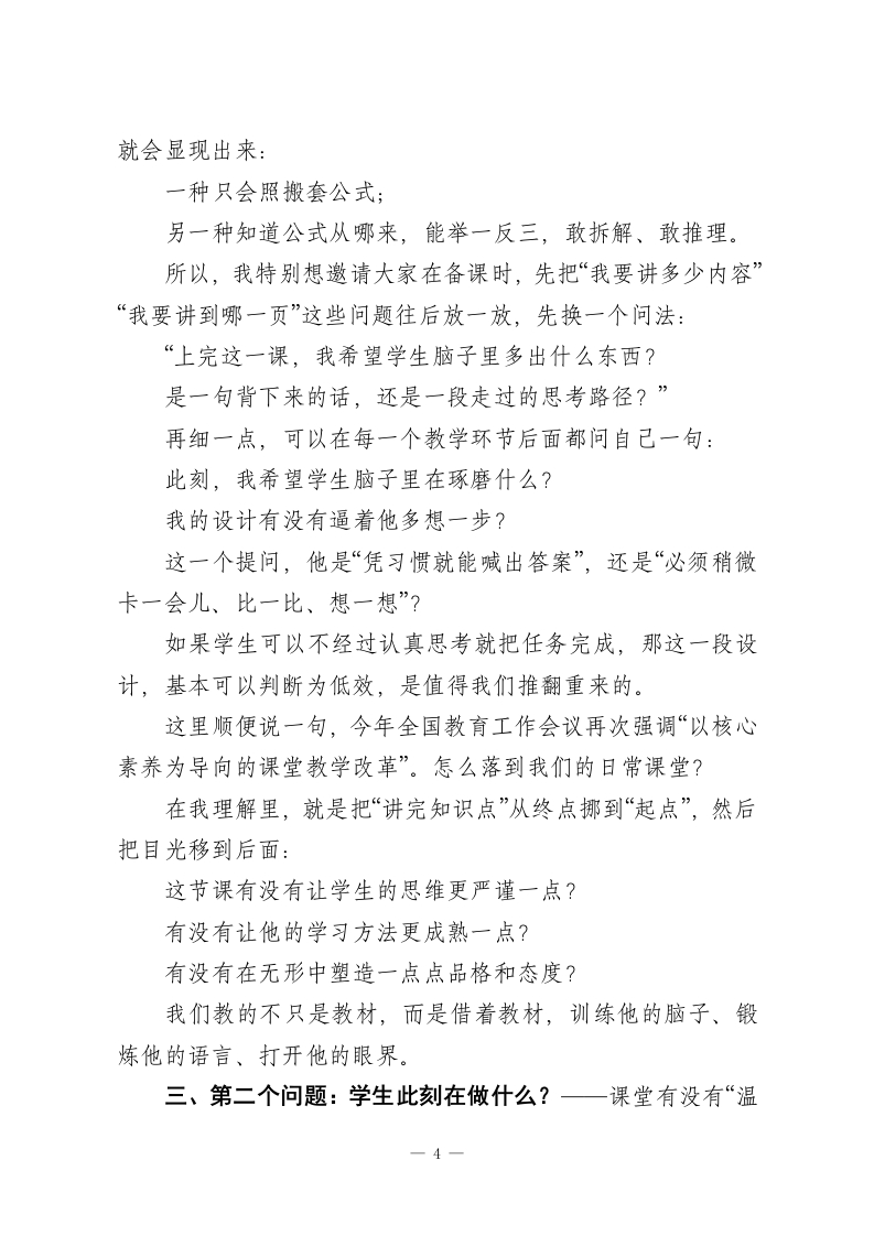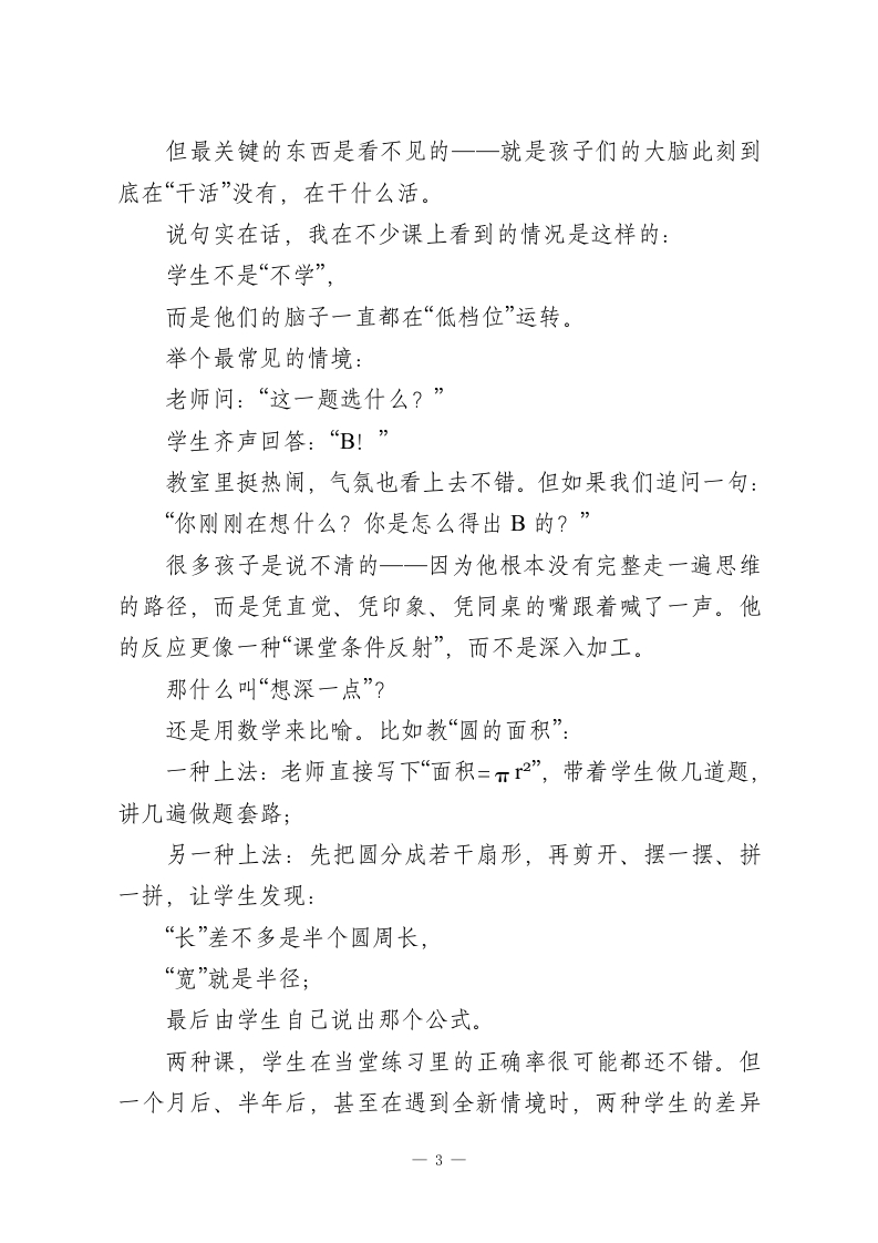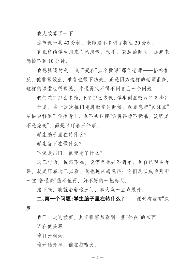 听完无数堂课后,校长忍不住说实话:张雪峰式“激情讲解”,到底该学还是该戒?各位同事:下午好。先跟大家说明一点:这段时间,我经常推开教室的门就坐在后排,来的时间并不固定,上的课也并没有事先挑选。今天站在这里,并不是想给哪位老师“算总账”,也不是为了排个名次、评个高低,而是想把我在教室后面看到、听到、感受到的一些东西,摊开来和大家聊一聊,然后一起想想:我们的课,接下来还能怎样上得更有价值。一、我在后排看到了什么说一段印象很深的小片段。有一次第二节课,我走进一个班,老师正在讲一个重要知识点。可以说,这位老师的“教师素养”是很过硬的:板书布局合理、条理清楚;课件画面精致,逻辑紧密;语言流畅,节奏也把握得很好。如果只盯着讲台,其实挺赏心悦目的。于是我刻意把视线挪开,落在学生身上:前几排的同学低头记笔记,写得很认真:中间一片在翻书、找地方;后面有几个孩子,眼睛看着黑板,但看得出来是在“放空”,跟不上也没有挣扎,只是安静地“坐在那里”1
