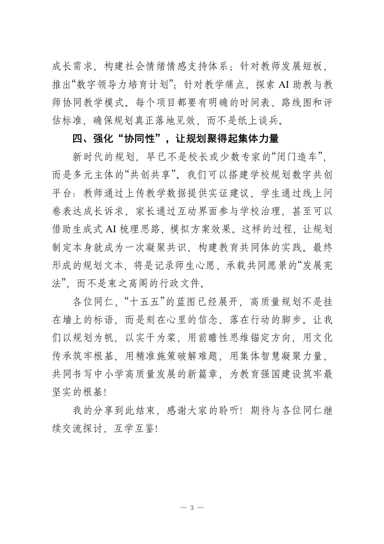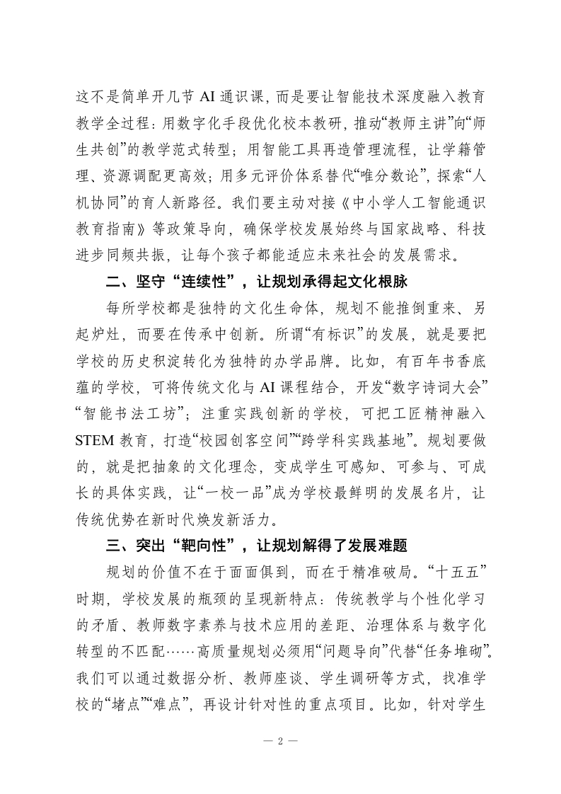 校长论坛精彩发言:规划先行,引航学校高质量发展尊敬的各位教育同仁、各位校长朋友:大家好!站在“十四五”圆满收官、“十五五”扬帆起航的关键节点,相信每一位深耕基础教育的校长都在思考:如何让学校发展既踩准国家战略的节拍,又贴合师生成长的真实需求?今天,我想以“以高质量规划引领学校高质量发展”为题,和大家分享几点实践思考。当前,我国正迈向教育强国的历史性跨越,《教育强国建设规划纲要》明确指出“建设教育强国,基点在基础教育”。而人工智能掀起的科技浪潮,正深刻重塑教育生态。这意味着,“十五五”时期的学校规划,早已不是常规的管理流程,而是回应时代命题的组织变革,是关乎学校未来五年甚至更长时间发展的“导航图”。它不该是应付检查的文字堆砌,更不是装点门面的宏大叙事,而是凝聚集体智慧、指导具体实践的行动纲领,是校长们教育情怀与责任担当的集中体现。结合多年办学实践,我认为高质量规划要抓好四个核心维度:一、锚定“前瞻性”,让规划接得住时代脉搏基础教育已从“基本均衡”迈向“优质均衡”,单纯的办学条件改善、学业成绩提升,早已不是高质量发展的全部内涵。“十五五”规划必须主动拥抱时代变化,把“数智赋能”作为关键引擎。-1