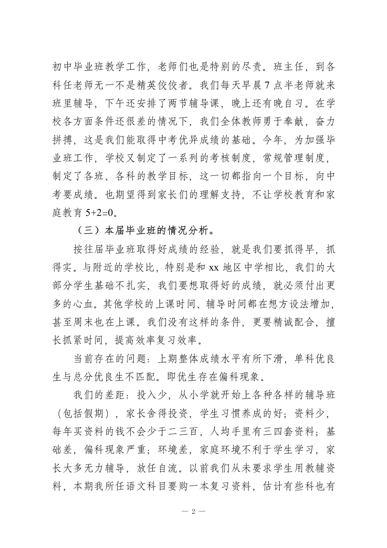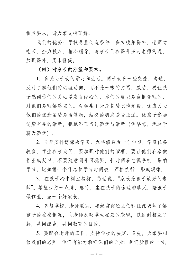 校长在初三九年级毕业班家长会上发言,主要讲了4点内容尊敬的各位家长:你们好!今天,你们带着对子女成长的殷切关怀,对学校工作的极大支持,来参加我校组织召开的毕业班家长会,我谨代表学校对你们表示最热烈的欢迎和衷心的感谢!借此机会,我们加强联系,共同探讨教育,促进孩子全面发展和健康成长。今天,正好距离中招考试还有三个月左右,今天的主题和中心就是要树立信心、家校协作,全力冲刺,铸就辉煌。理解沟通育英才,携手同心赢中考。为此我想和各位交流以下几点:(一)毕业班工作的重要性。毕业班工作的重要性想必各位家长都十分清楚。九年级这一学期,是十分关键的一期,也是十分紧张的一期。要对初中三年来的知识进行系统的整理和复习,将零散的知识形成一个完整的体系;既是对初中阶段的一个总结,又是为高中学习打下坚实基础。时间紧,任务重,学校、教师、学生和家长,都十分关注毕业班的教育教学质量。特别是我们在座的各位家长,都希望你家的孩子能进入一个理想的满意的高一级学校学习。加上青春期的学生处于学习压力最大的阶段,所以家校合作,教育方式方法显得格外重要。(二)我校对毕业班工作十分重视。我校历来就十分重视毕业班教育教学工作。学校在教师配备上,安排了具有丰富毕业班教学、管理经验的骨干教师承担一1
