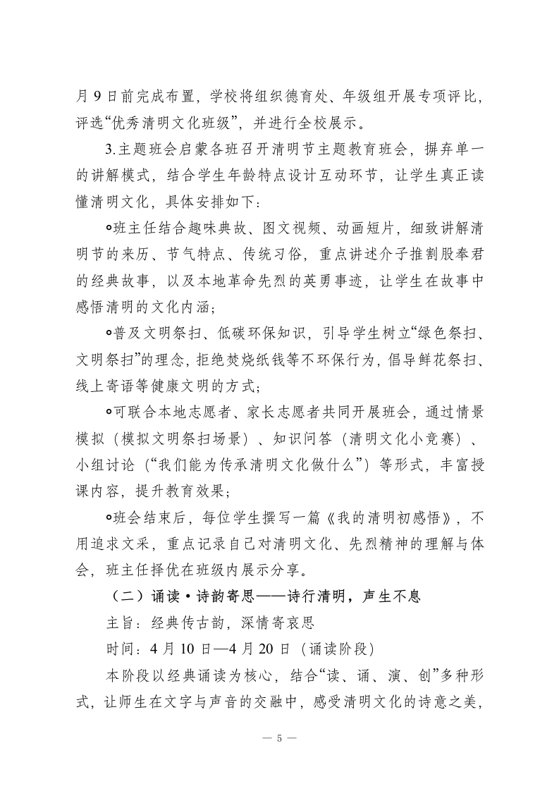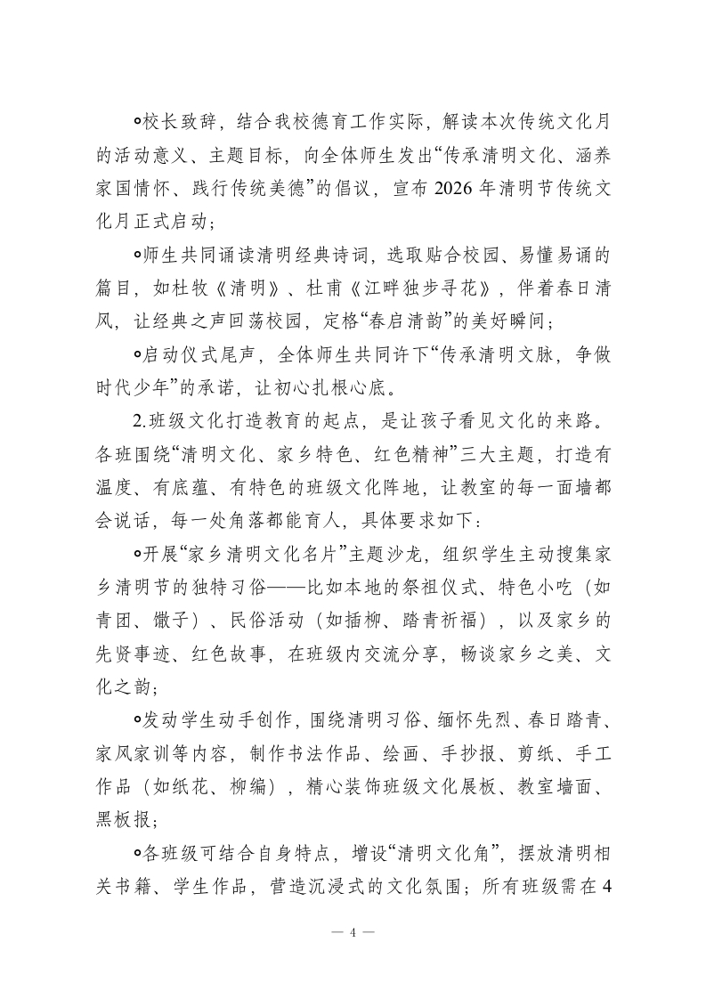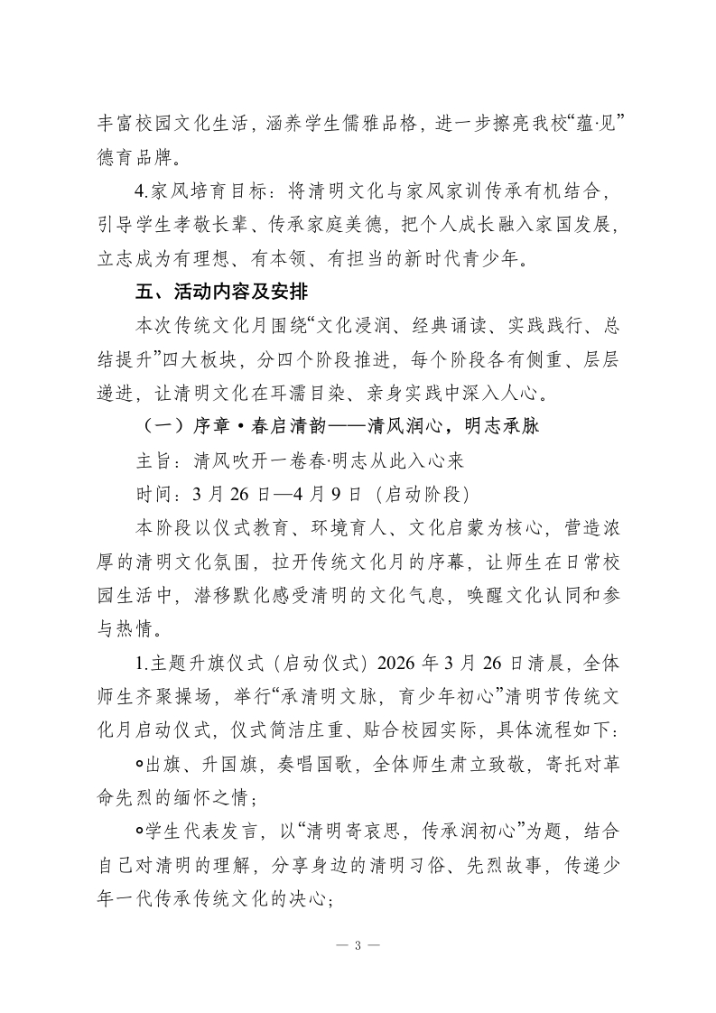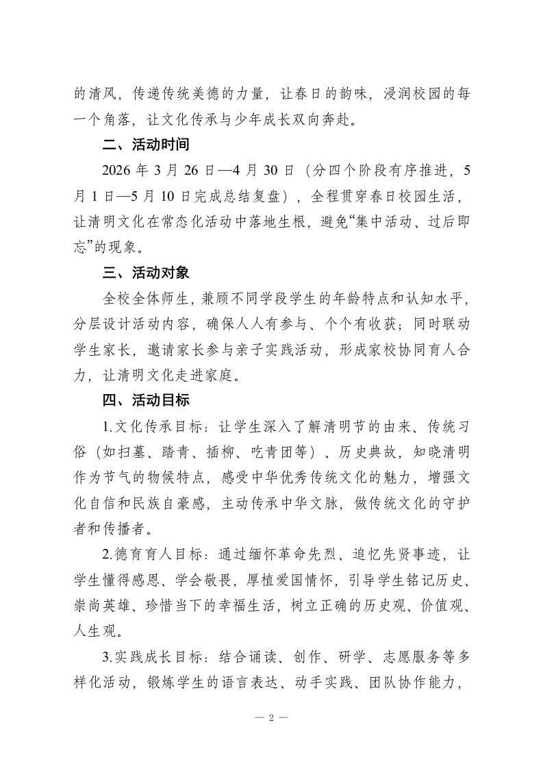 学校2026年清明节传统文化月活动实施方案春回大地,天清地明,清明如期而至。它既是二十四节气中春意最浓的一个,带着草木新生的生机与希望;更是刻在中国人骨子里的传统节日,承载着慎终追远、缅怀先烈、传承家风的深厚情怀,藏着中华民族独有的精神气节与文化根脉。春风拂过校园,哀思与暖意相伴,初心与使命同行。在这个特殊的时节,我们希望带领全体师生,在缅怀先辈中铭记历史,在传承文化中涵养品格,在实践行动中践行担当,让清明文化真正走进校园、走进课堂、走进每一位少年的心中。为深入落实市教育局“我们的节日·清明”主题校园文化活动要求,充分挖掘清明节的文化内涵与德育价值,推动中华优秀传统文化落地生根,结合我校“蕴·见”德育品牌建设,坚守立德树人根本任务,贴合师生成长实际,精心策划本次清明节传统文化月系列活动,不搞形式、不走过场,让每一位师生都能在沉浸式体验中感悟传统、收获成长,特制定本实施方案。一、活动主题承清明文脉,育少年初心一清风传美德,春韵润校园主题解读:“承清明文脉”,是让每一位师生读懂清明背后的文化底蕴,知晓节气习俗、历史典故,传承中华民族慎终追远、敬老爱亲的传统美德;“育少年初心”,是通过缅怀先烈、践行美德,引导少年儿童厚植爱国情怀、筑牢责任担当,树立正确的价值观。“清风传美德,春韵润校园”,则是希望让清明1