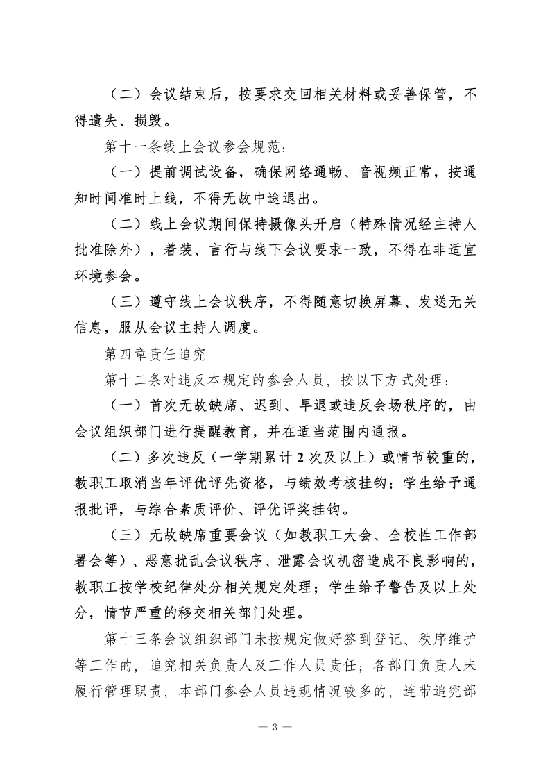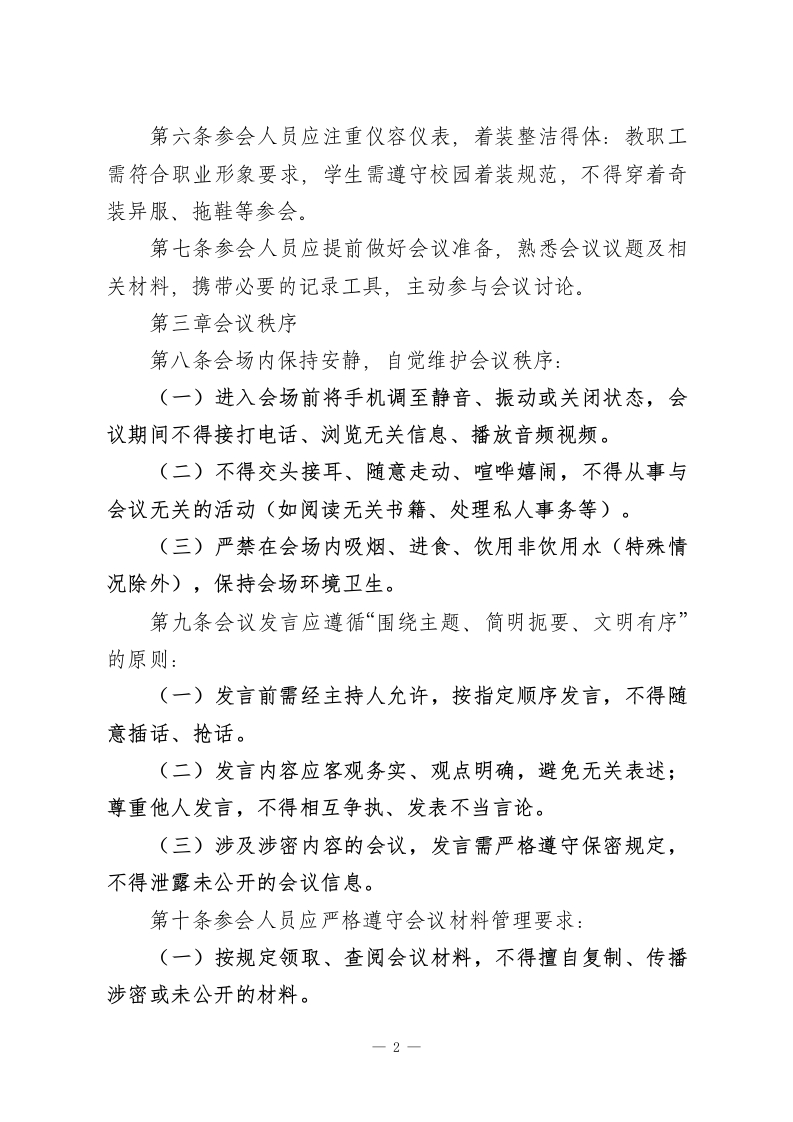 学校会风会纪管理规定第一章总则第一条为进一步规范学校各类会议组织管理,严肃会议纪律,提升会议质量与效率,保障学校各项工作部署有效落实,营造务实、高效、严谨的会议氛围,依据教育系统相关管理要求及学校规章制度,制定本规定。第二条本规定适用于学校组织的各类会议,包括教职工大会、行政办公会、专题工作会、学术研讨会、学生会议、班级会议等,覆盖全体教职工、学生及参会相关人员。第三条会风会纪管理遵循“统一规范、分级负责、从严要求、奖惩并重”的原则,坚持以会促干、以纪提效,推动会议成果转化为工作实效。第二章参会规范第四条参会人员应严格遵守会议通知要求,按规定时间、地点参会,不得无故缺席、迟到、早退。(一)确因特殊情况无法参会的,须提前履行请假手续:教职工向会议组织部门或分管校领导书面请假,学生向班主任或会议组织者书面请假,经批准后方可缺席,未经批准缺席视为无故旷工(旷课)。(二)迟到、早退累计超过15分钟的,按缺席会议处理;会议期间未经主持人允许擅自离会的,视为早退。第五条参会人员应按要求完成签到,不得代签、补签。会议组织部门需做好签到登记,准确记录参会情况。1