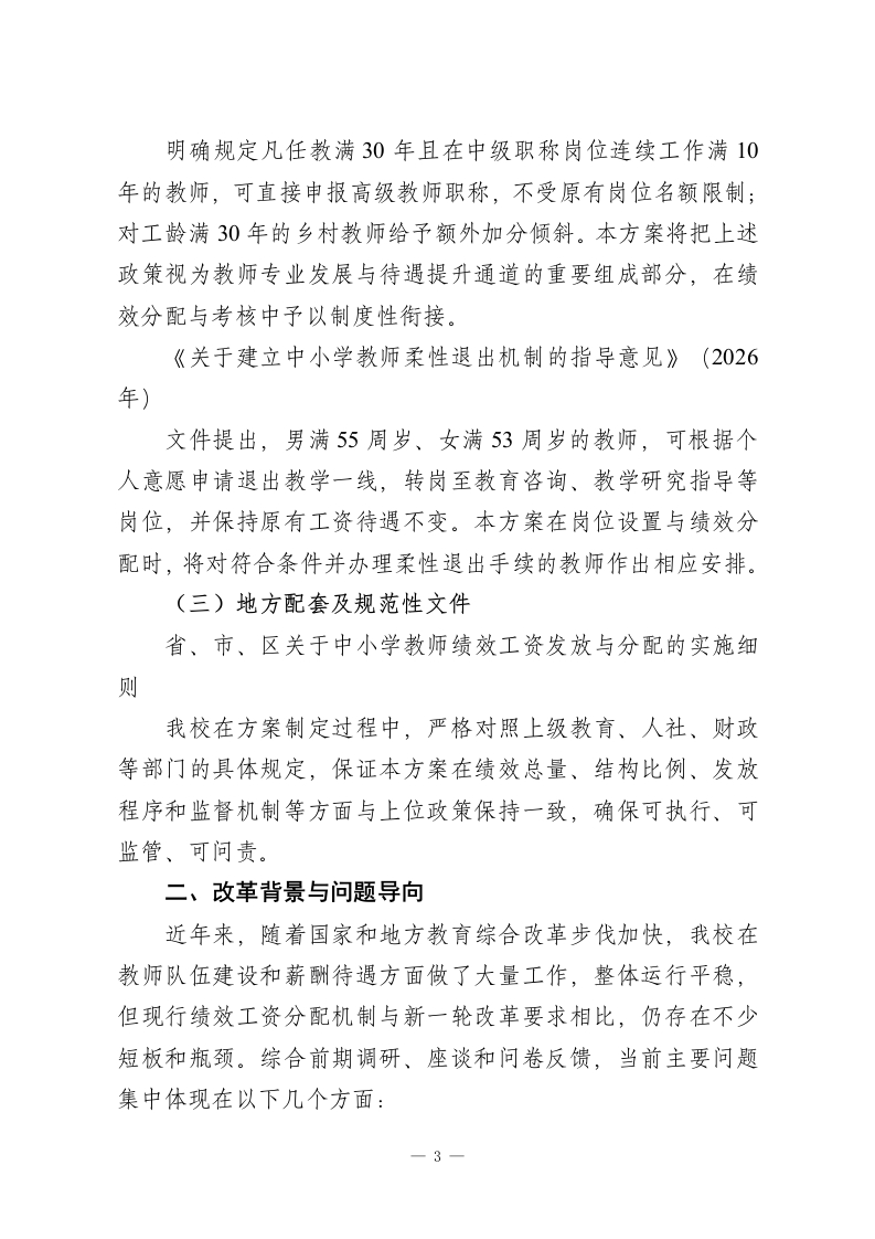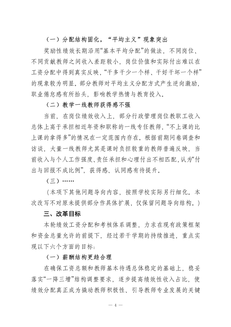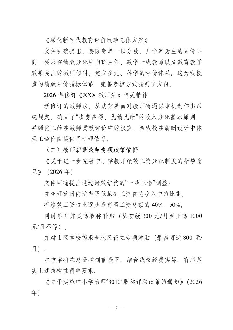 学校教师绩效工资考核分配改革方案(2026年试行)为全面落实《教育强国建设规划纲要(2024一2035年)》关于“优化教师工资结构”的战略要求,切实贯彻2026年修订的《XXX教师法》有关教师待遇保障和薪酬激励的新精神,执行《深化新时代教育评价改革总体方案》中关于“绩效工资分配向班主任、一线教师和教育教学成效突出者倾斜”的相关规定,结合我校实际运行情况与教师队伍现状,特制定本绩效工资分配与考核实施方案。本方案旨在通过调整工资结构、完善考核办法、细化分配规则,推动形成结构合理、导向鲜明、公开透明、激励有力的教师绩效工资制度,进一步激发教师队伍活力,提升教育教学质量。一、政策依据本方案严格依照国家和地方现行有关法律法规及配套文件精神制定,主要依据如下:(一)国家总体政策依据《教育强国建设规划纲要(2024一2035年)》纲要对教师收入分配提出了明确要求,强调要“优化教师工资结构,健全中小学教师工资长效联动机制”,并突出提出建立以岗位职责、工作业绩和实际贡献为核心要素的绩效工资分配制度,为我校从结构调整和制度设计层面推进改革提供了根本遵循。