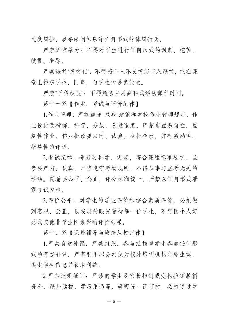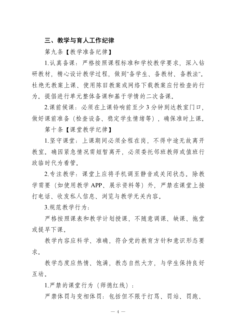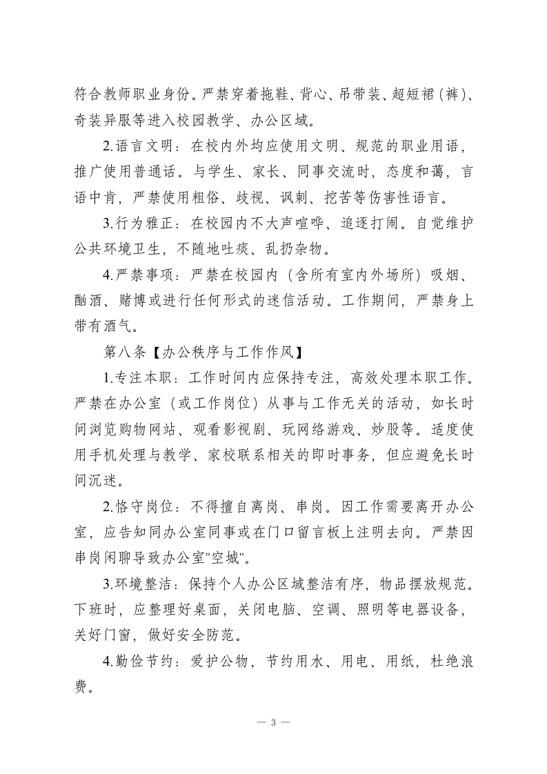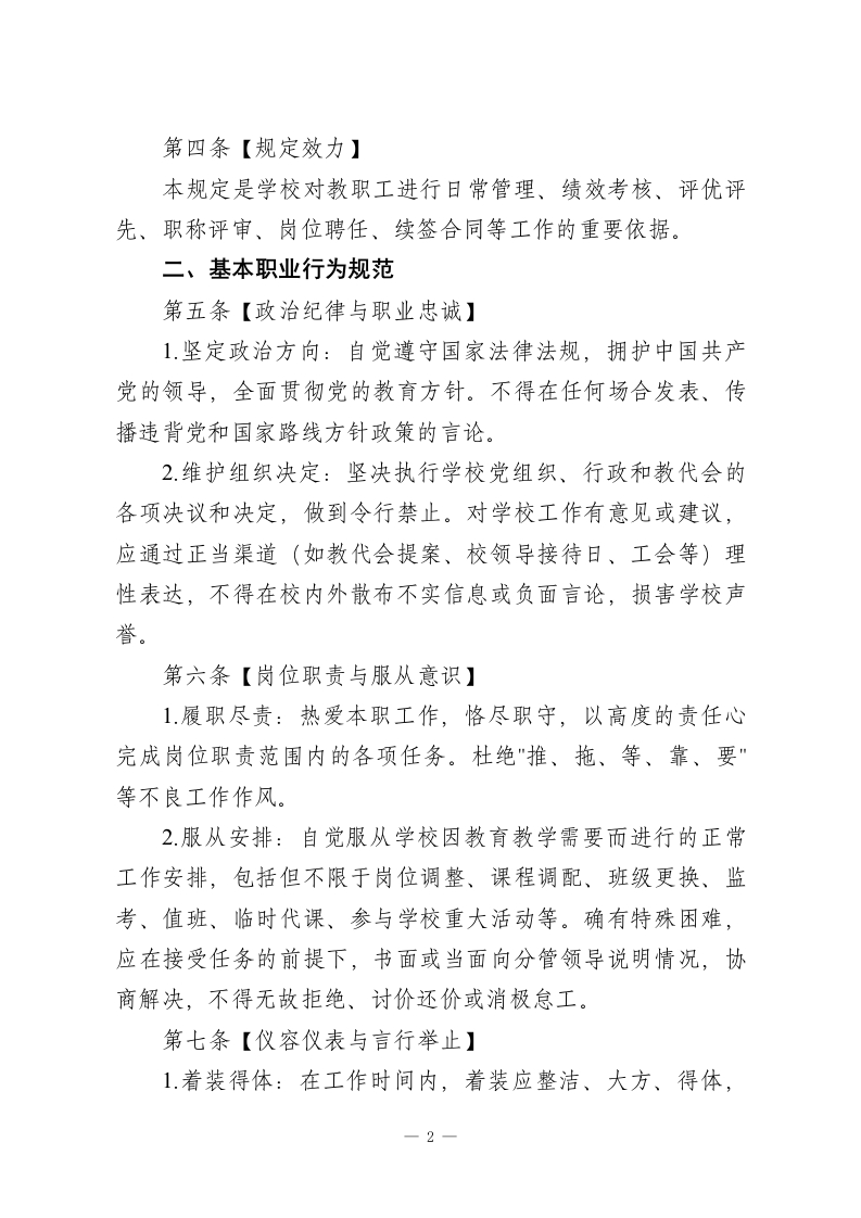 学校教职工工作纪律管理规定(2026新版)一、总则第一条【制定目的与依据】为深入贯彻落实《中华人民共和国教师法》《新时代中小学教师职业行为十项准则》及教育行政部门关于加强教师队伍建设和师德师风建设的系列文件精神,进一步明晰教职工职业行为边界,规范工作秩序,营造严谨、有序、和谐、奋进的育人环境,保障学校各项工作高效平稳运行,提升办学品质和育人成效,经学校教职工代表大会审议通过,特制定本规定。第二条【适用对象】本规定适用于在我校工作的全体教职员工,包括但不限于:1.在编及聘用制教师:2.校级及中层管理干部;3.行政、教辅人员(如实验员、图书管理员、信息技术员等);4后勤、工勤、安保、宿管、食堂等服务保障人员;5.所有通过劳务派遣、服务外包等形式在校工作的相关人员(其行为规范参照本规定核心条款,并由相应合同约定)。第三条【核心理念】全体教职工应牢固树立"”人人是形象,处处是课堂,事事皆育人"的意识。工作纪律不仅是管理要求,更是职业素养和师德修养的直接体现。遵守本规定,是每一位教职工最基本的岗位职责和职业承诺。一1