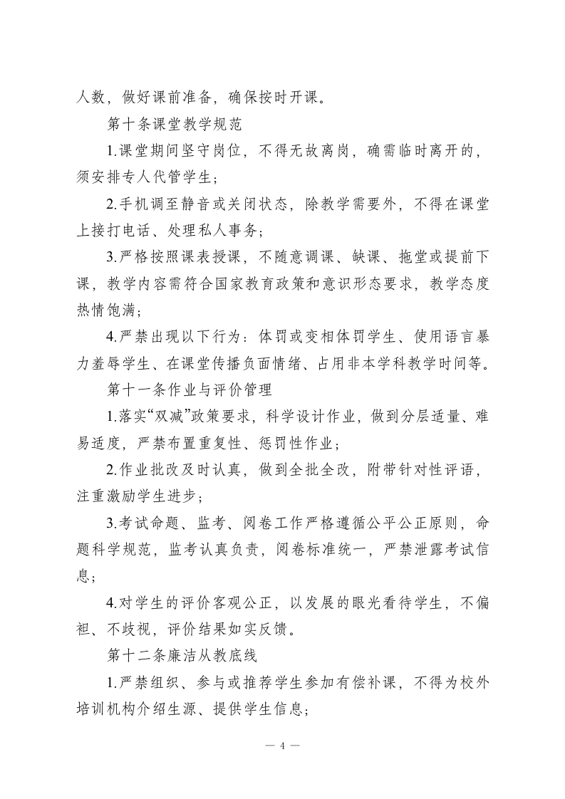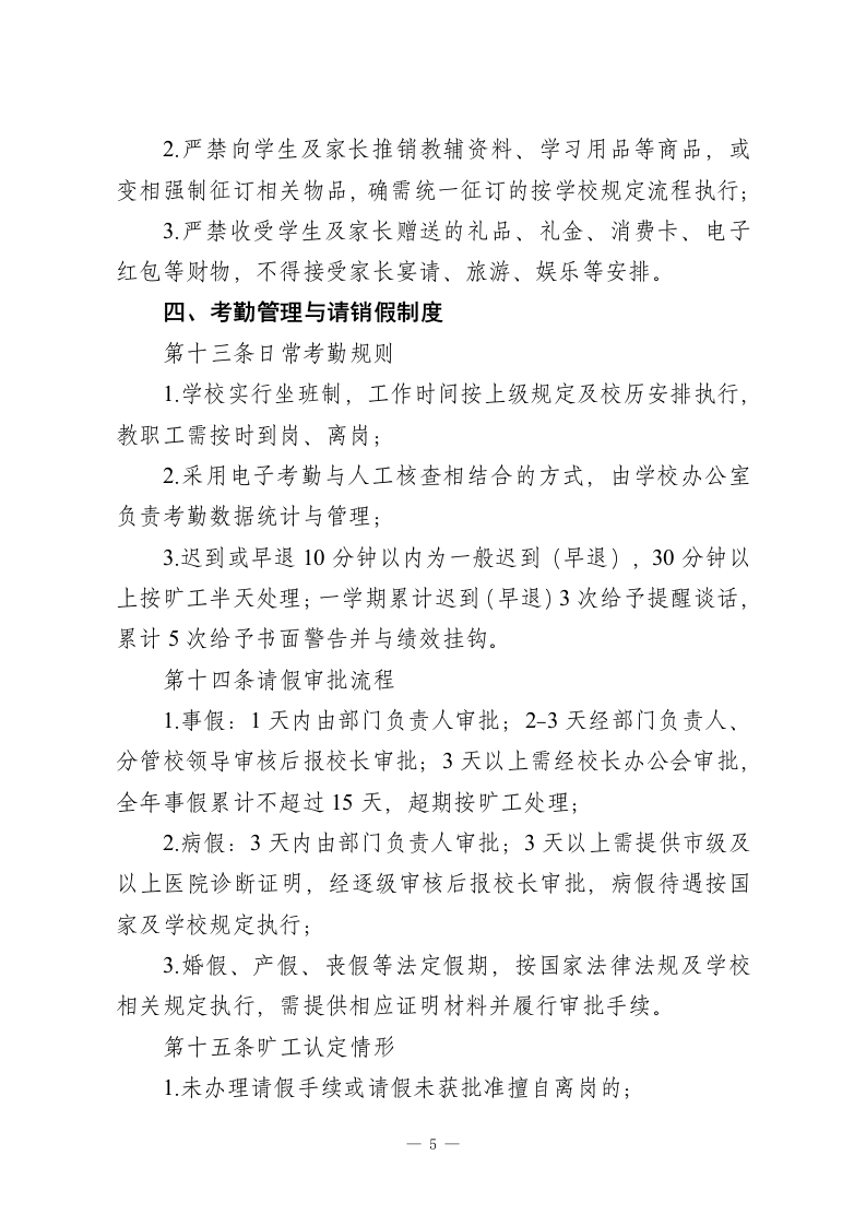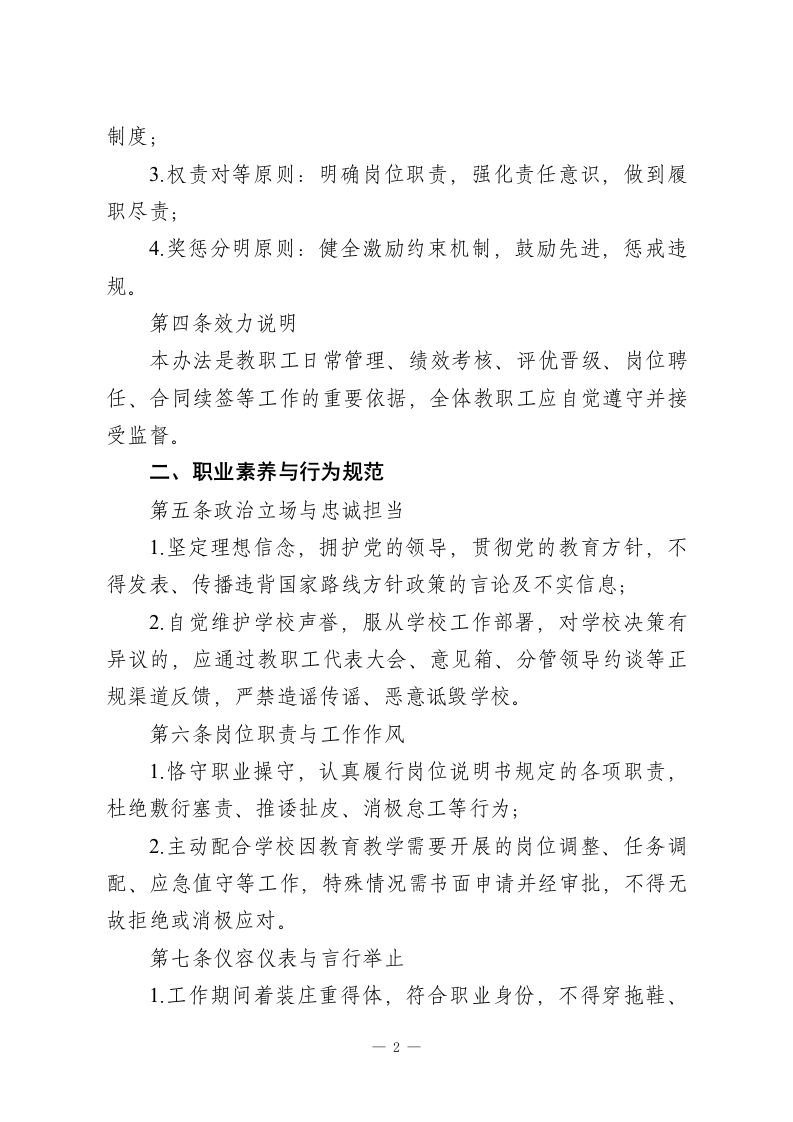 学校教职工职业行为与工作纪律管理办法(2026年修订版)一、总则第一条制定宗旨为全面落实立德树人根本任务,依据《中华人民共和国教育法》《中华人民共和国教师法》《新时代教师职业行为十项准则》及上级教育主管部门相关文件要求,结合学校发展实际,进一步规范教职工职业行为,强化工作纪律,营造风清气正、务实高效的育人环境,保障教育教学工作高质量推进,经学校校务委员会审议通过,制定本办法。第二条适用范围本办法适用于学校全体在岗教职工,涵盖:1.事业编制、聘用制专任教师;2.各级管理岗位人员(校级、中层及年级组、教研组负责人);3行政办公、教学辅助(实验、图书、信息技术等)人员;4.后勤服务、安全保卫、宿舍管理、食堂运营等保障人员;5.劳务派遣、外包服务等驻校工作相关人员(参照本办法核心条款执行,纳入用工合同管理)。第三条核心原则1.立德树人原则:坚守教育初心,将师德师风建设贯穿工作全过程;2.依法依规原则:严格遵守国家法律法规及学校各项规章一1