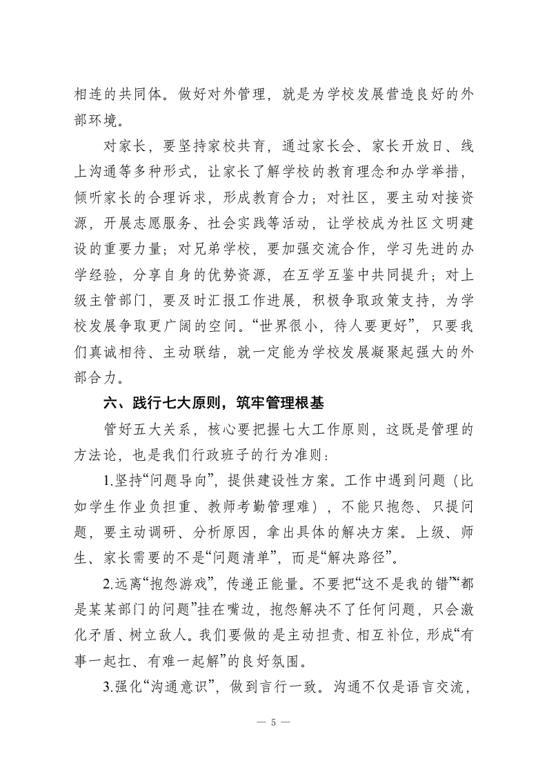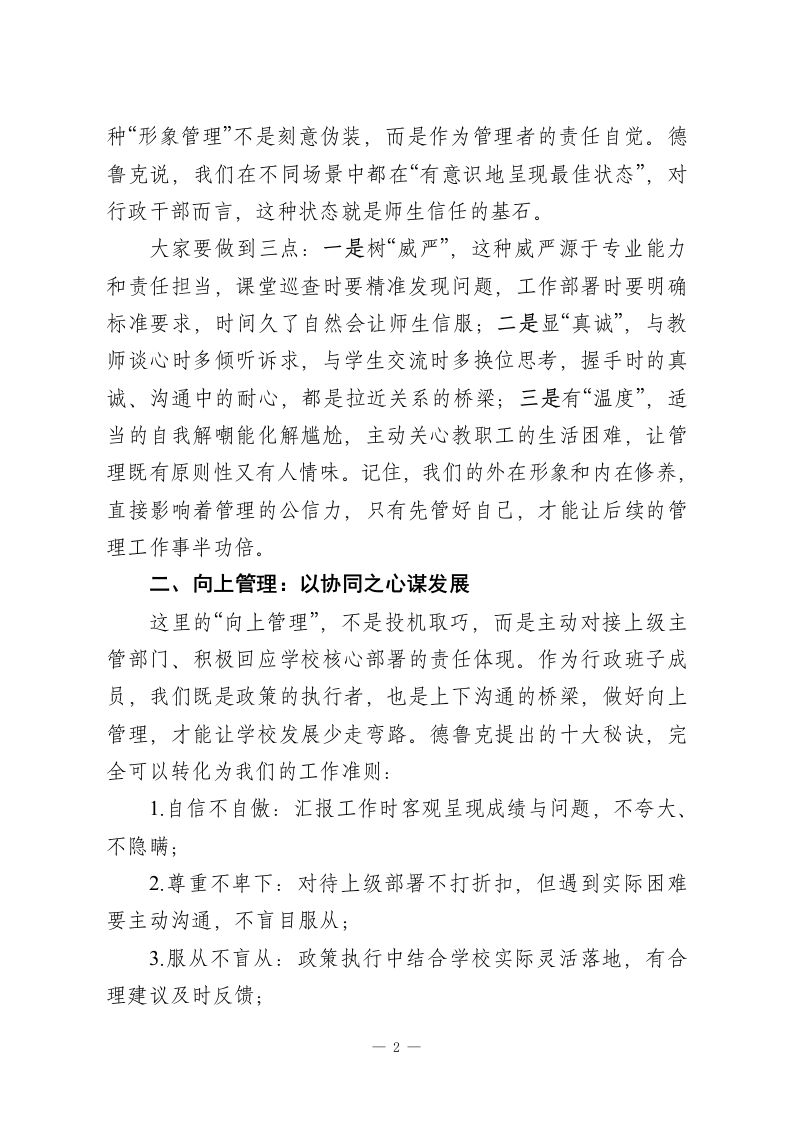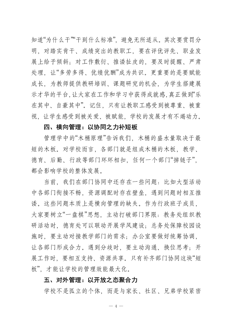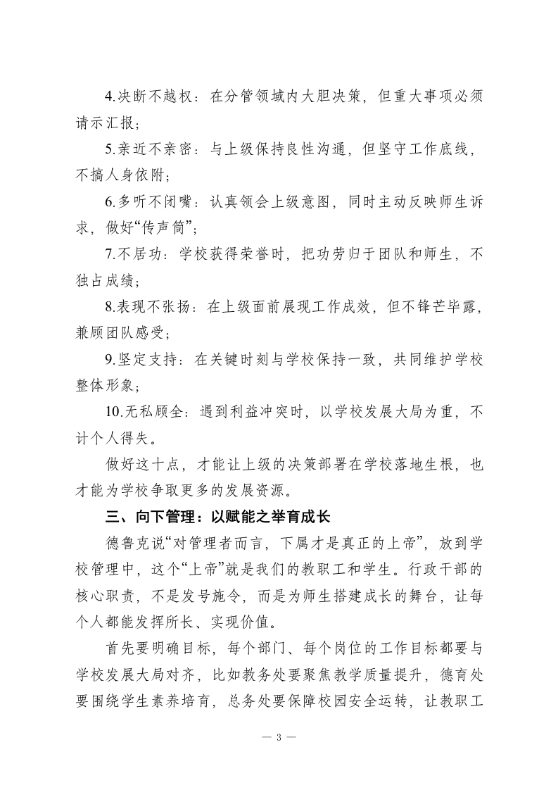 学校行政班子工作会上,校长发言:凝心聚力抓管理,守正创新促发展各位行政班子的同仁们:大家下午好!今天我们召开这场行政班子专题会议,核心是想和大家深入探讨一个命题:作为学校发展的“领头雁”和“操盘手”,我们究竟该如何做好“管理”这篇大文章?在座的每一位,都是学校管理体系中的核心力量,日常既要对接上级、协调同级,也要带领下属、服务师生,每天都在践行“管理”二字。但我想问问大家:如果我们只把管理等同于“管人”,只盯着自己分管部门的那几个人、几件事,这样的管理能支撑起学校的高质量发展吗?管理大师彼得·德鲁克曾警示过管理者的两大误区:一是错把“管人”当作管理的全部,二是过度简化管理逻辑,认为管好下属就万事大吉。放到学校管理中,这两大误区同样值得我们警惕。一所学校就像一个有机整体,教学、德育、后勤、行政等各个环节环环相扣,师生、家长、社区等多方关系交织共生。真正有效的管理,从来不局限于“管人”,而在于管好“关系”一一既要管好自己的言行示范,也要管好与上级的对接协同、与下属的赋能成长、与同级的协作配合,更要管好与外部的良性互动。今天,我就围绕这五大核心关系,和大家交流几点思考。一、管好自己:以示范之姿立标杆作为行政干部,我们的一言一行都是师生的“风向标”。这一1